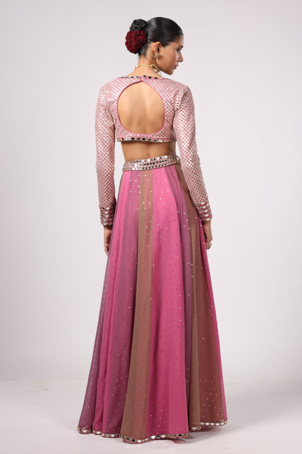 Feminine festive and fluid in form—the Pink Noorani Lehenga Pant Set is where modern ease meets traditional elegance. The soft pink hue is enhanced with intricate multicolor embroidery lending the ensemble a handcrafted charm. The lehenga-style flared pants offer the drama of a skirt with the comfort of pants making it an ideal pick for mehendi celebrations sangeet nights or pre-wedding events. Designed for the woman who embraces joyful dressing with a contemporary twist this look is playful polished and ready to shine.