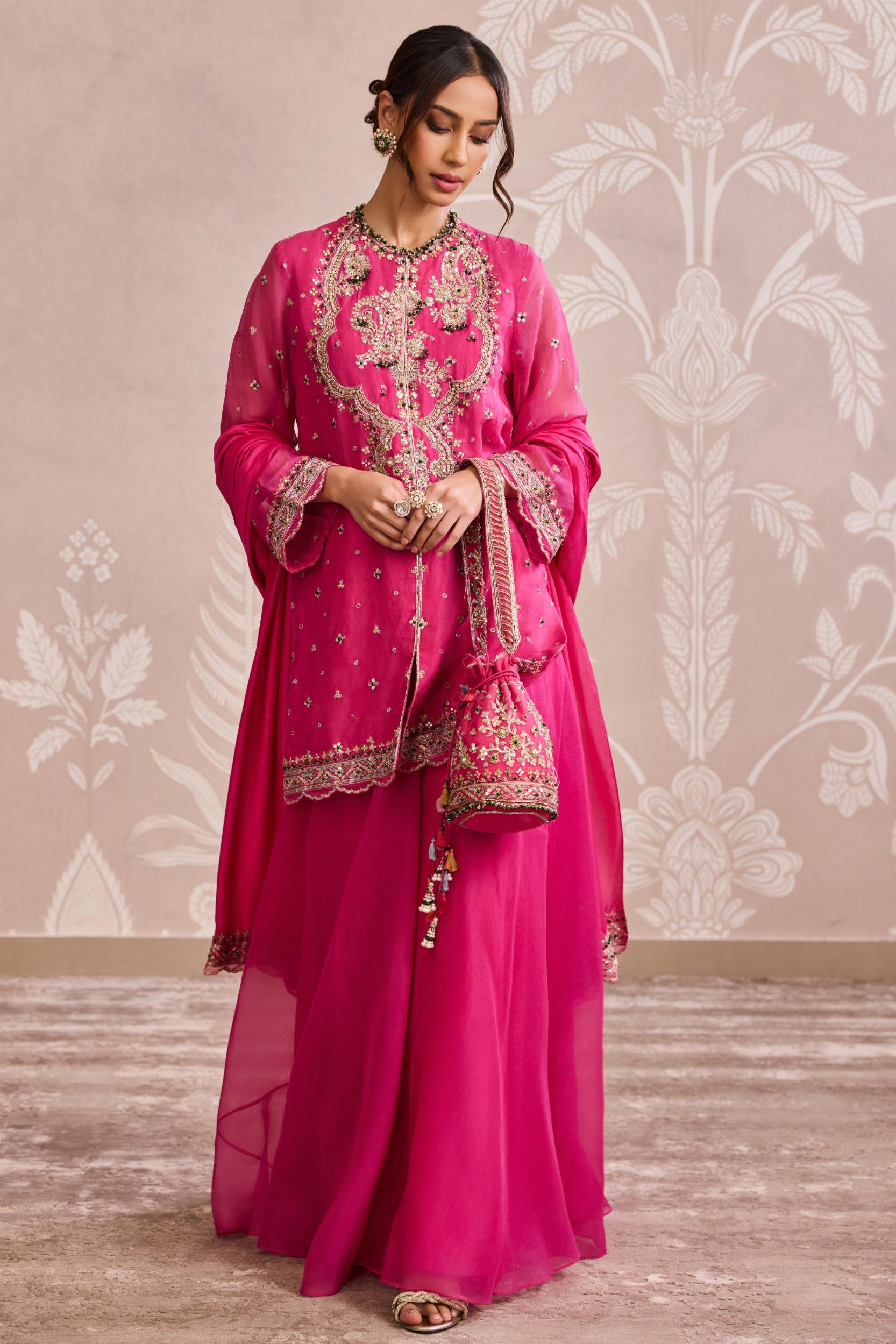 The Pink Nooreh Ever After Organza Sharara Set is a delicate ode to festive elegance. Crafted from weightless organza, the ensemble features a breezy silhouette that flows with ethereal grace. Its soft blush hue is accented with intricate detailing, lending it a dreamy, romantic feel. The flared sharara pants add playful movement, while the fitted kurta balances structure and flair. Ideal for daytime weddings or twilight soirees, this set is timelessly feminine and effortlessly sophisticated.