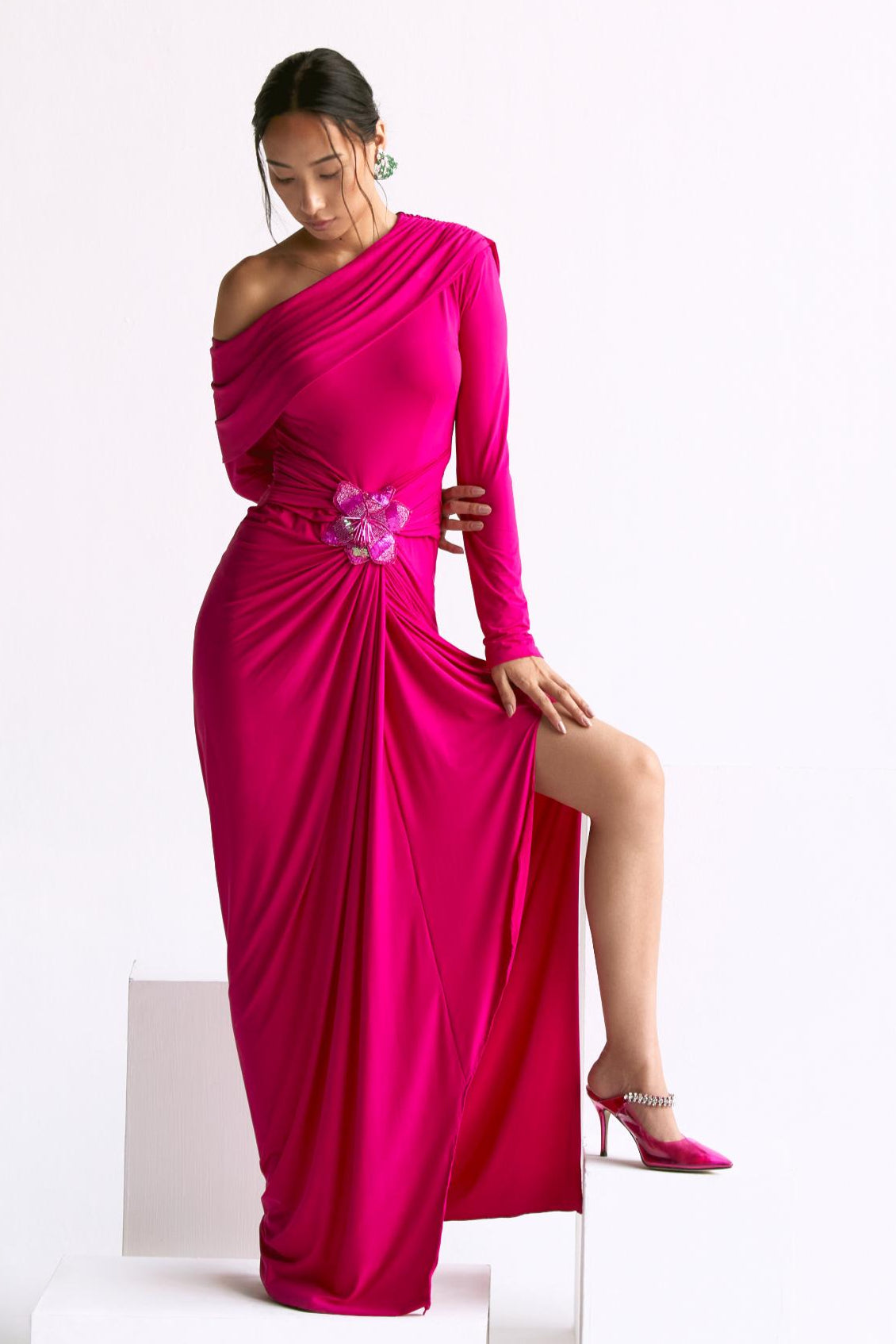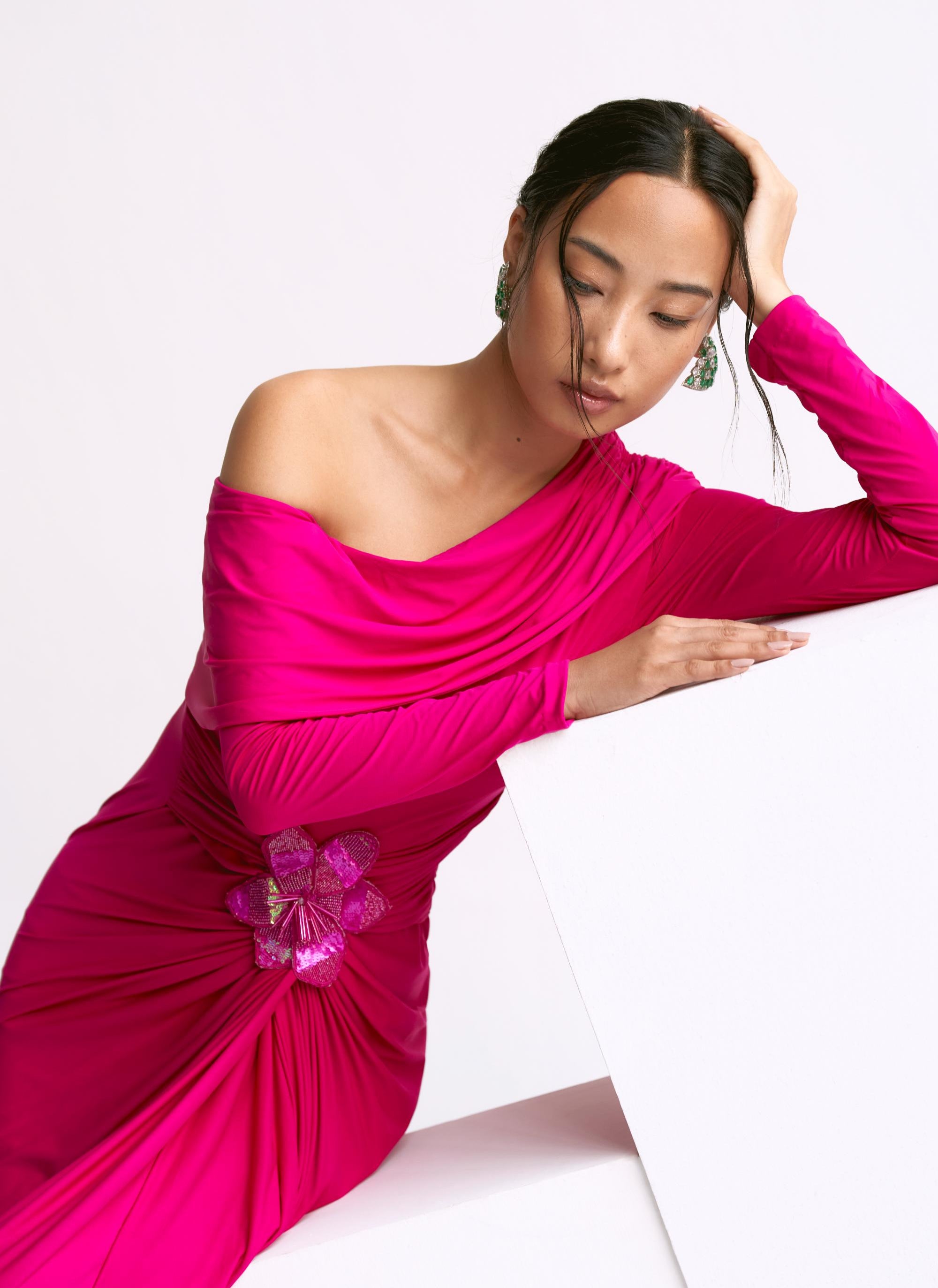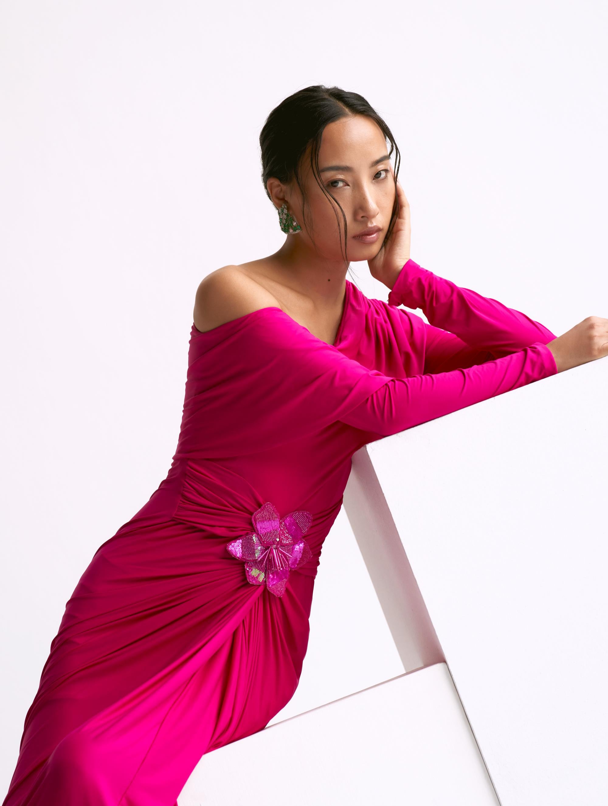 The Pink Off-Shoulder Gathered Waist Reim Gown exudes feminine charm and sophisticated allure. Designed with a flattering off-shoulder neckline and soft, gathered waist, this gown creates a stunning silhouette that highlights the natural curves while offering an effortlessly elegant look. The delicate pink hue adds a touch of romance and warmth, perfect for any formal occasion.
