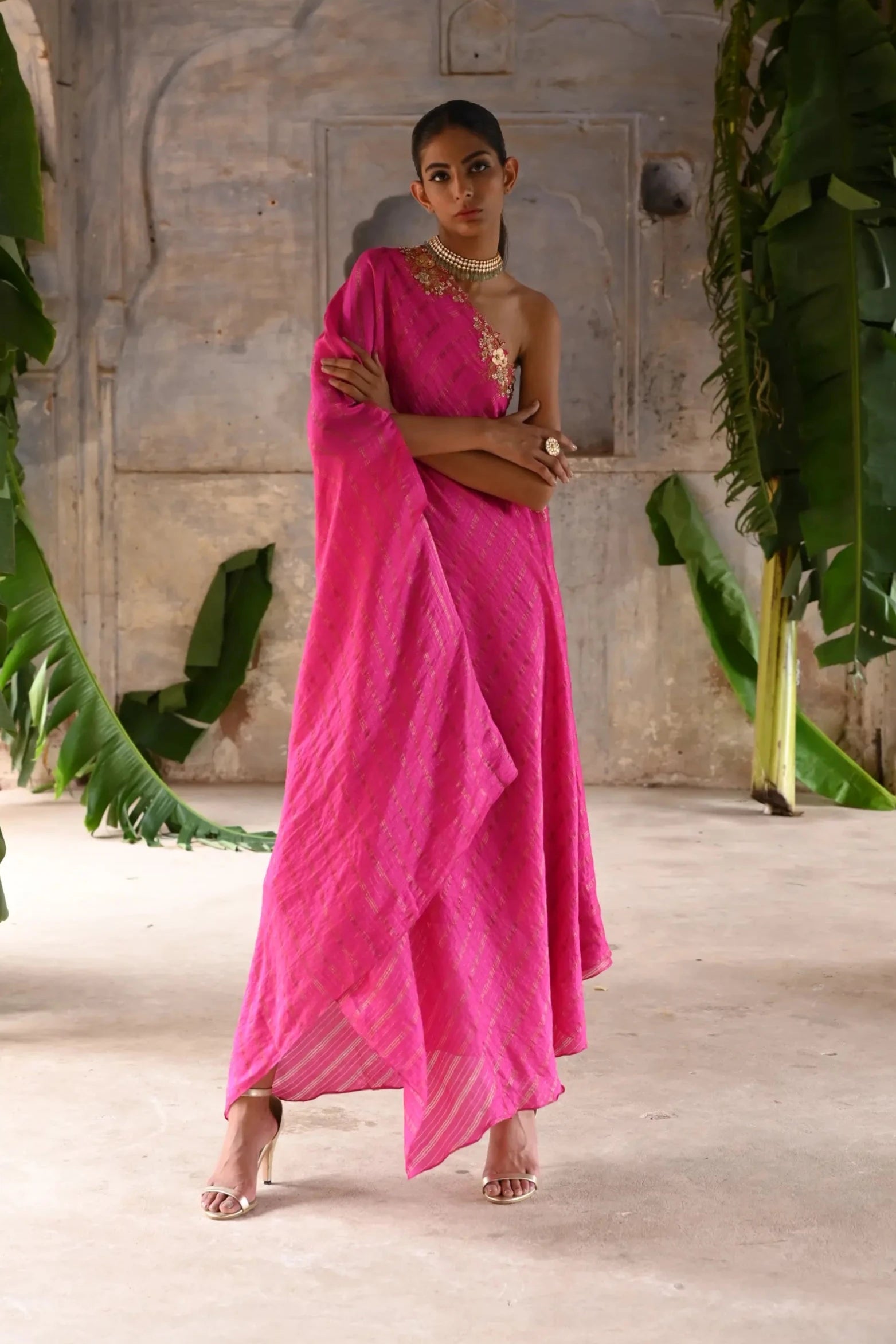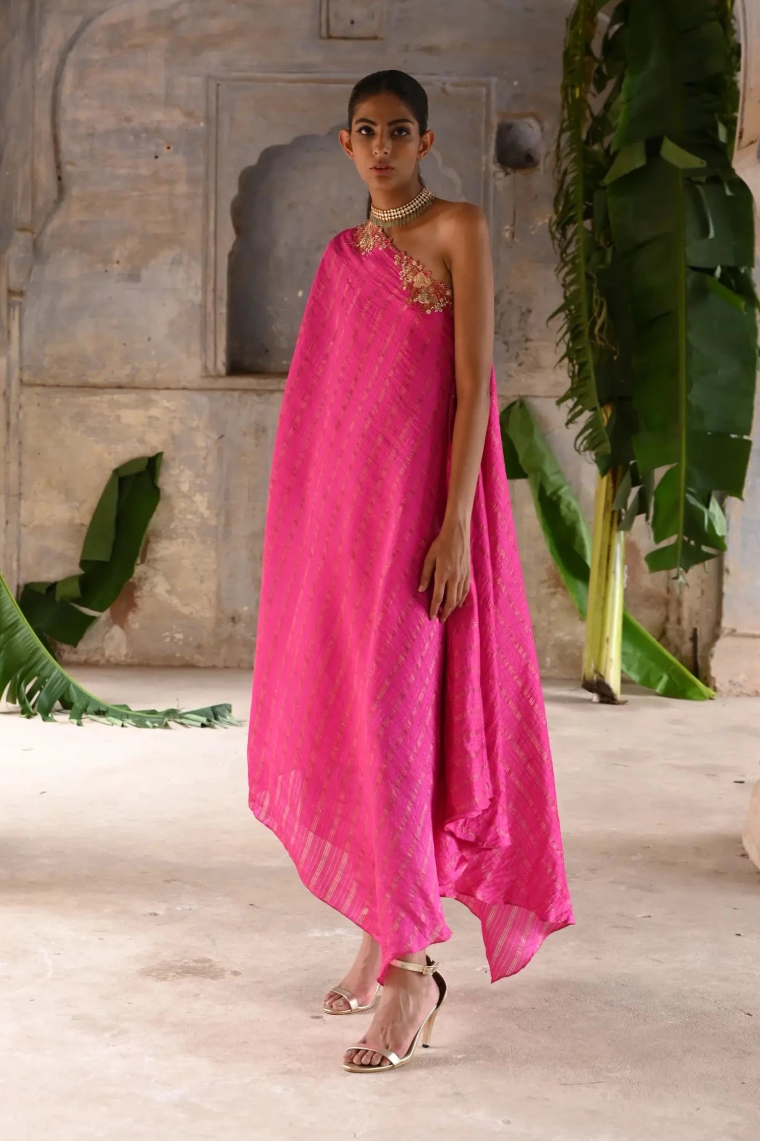 Turn heads with our Pink One Shoulder Dress. This stunning piece features a contemporary one-shoulder design that adds a bold and stylish flair to your wardrobe. The vibrant pink hue exudes femininity and confidence, making it perfect for parties, weddings, or special events.