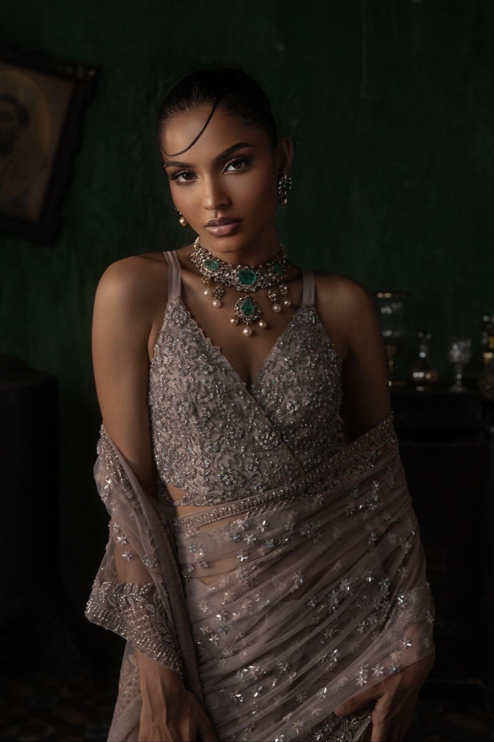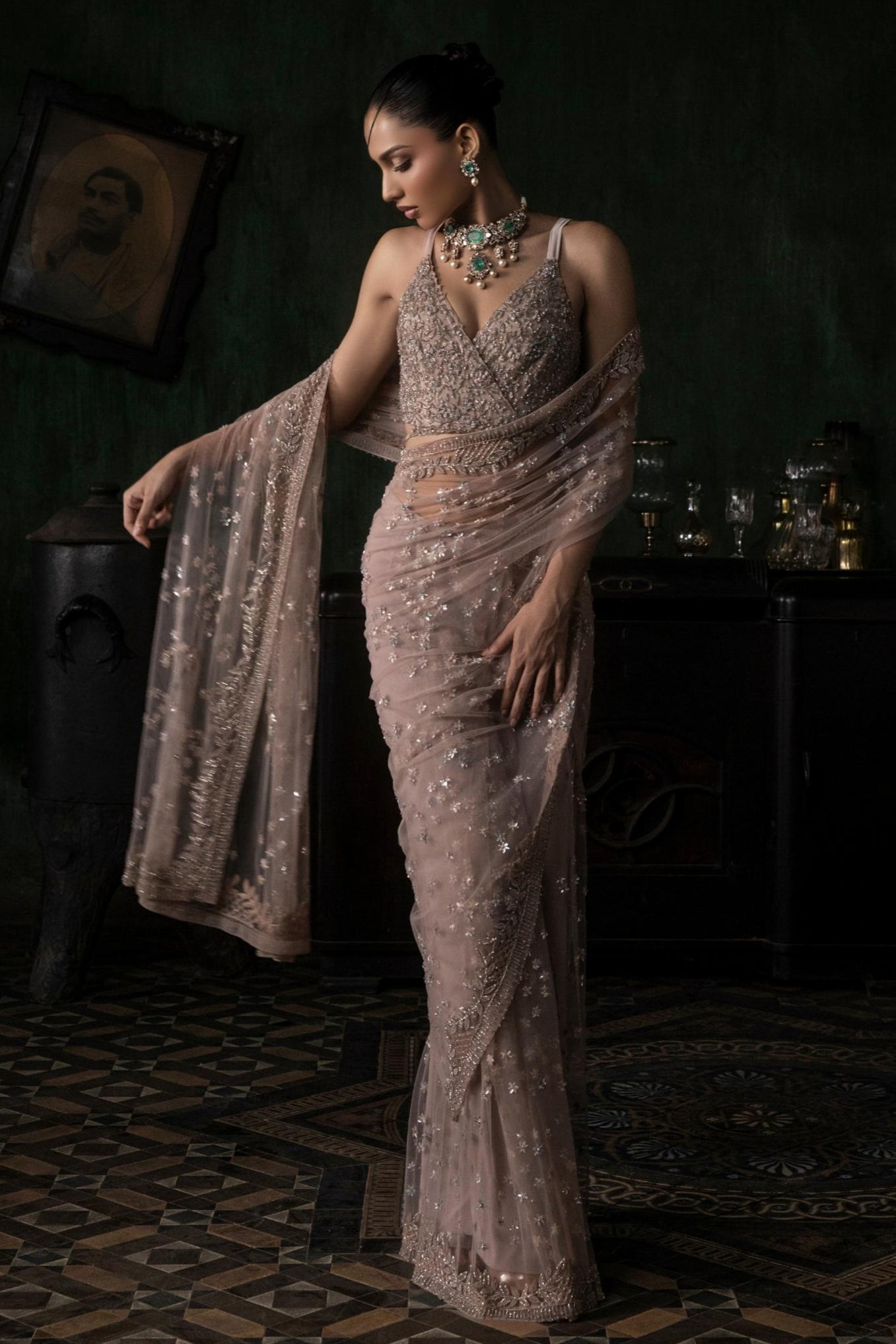 The Pink Oraan Pre-Stitched Saree Set is a celebration of effortless draping and contemporary femininity. Rendered in a soft blush hue, this ready-to-wear saree is detailed with delicate pleats and minimal embroidery for a refined yet modern aesthetic. Its pre-stitched form makes it perfect for quick elegance—ideal for weddings, festive evenings, or cocktail events. The set includes a structured blouse that adds a sleek silhouette to the overall look. Feminine, functional, and fuss-free—this sari is made for the modern muse.