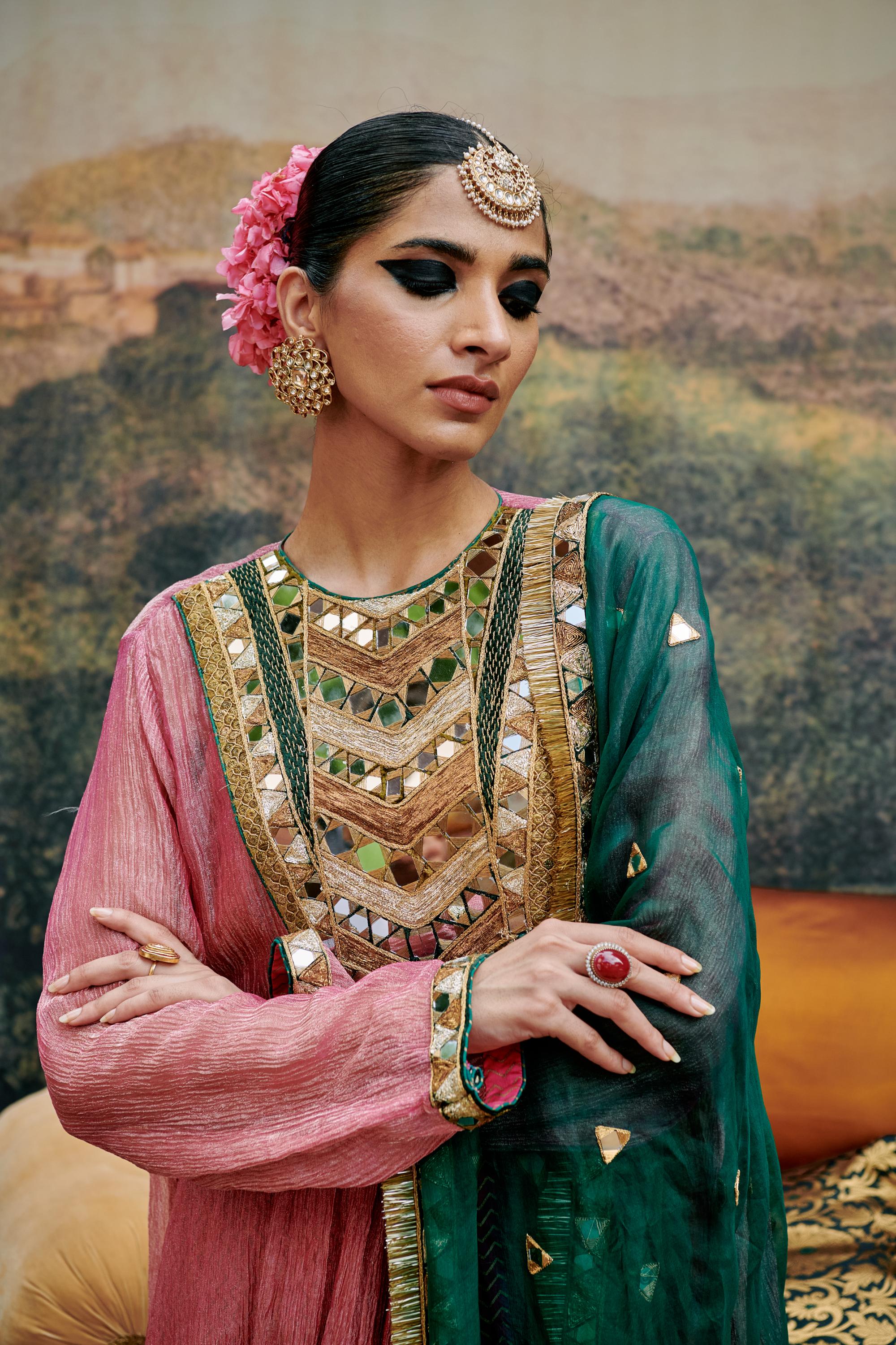 This pink tissue suit features a stunning mirror work yoke and crushed tissue details paired with chanderi-lined pants for a touch of elegance. The ensemble is completed with a green organza dupatta delicately adorned with mirror work on the borders of the kurta slip pants and dupatta. A perfect blend of tradition and sophistication for festive occasions.