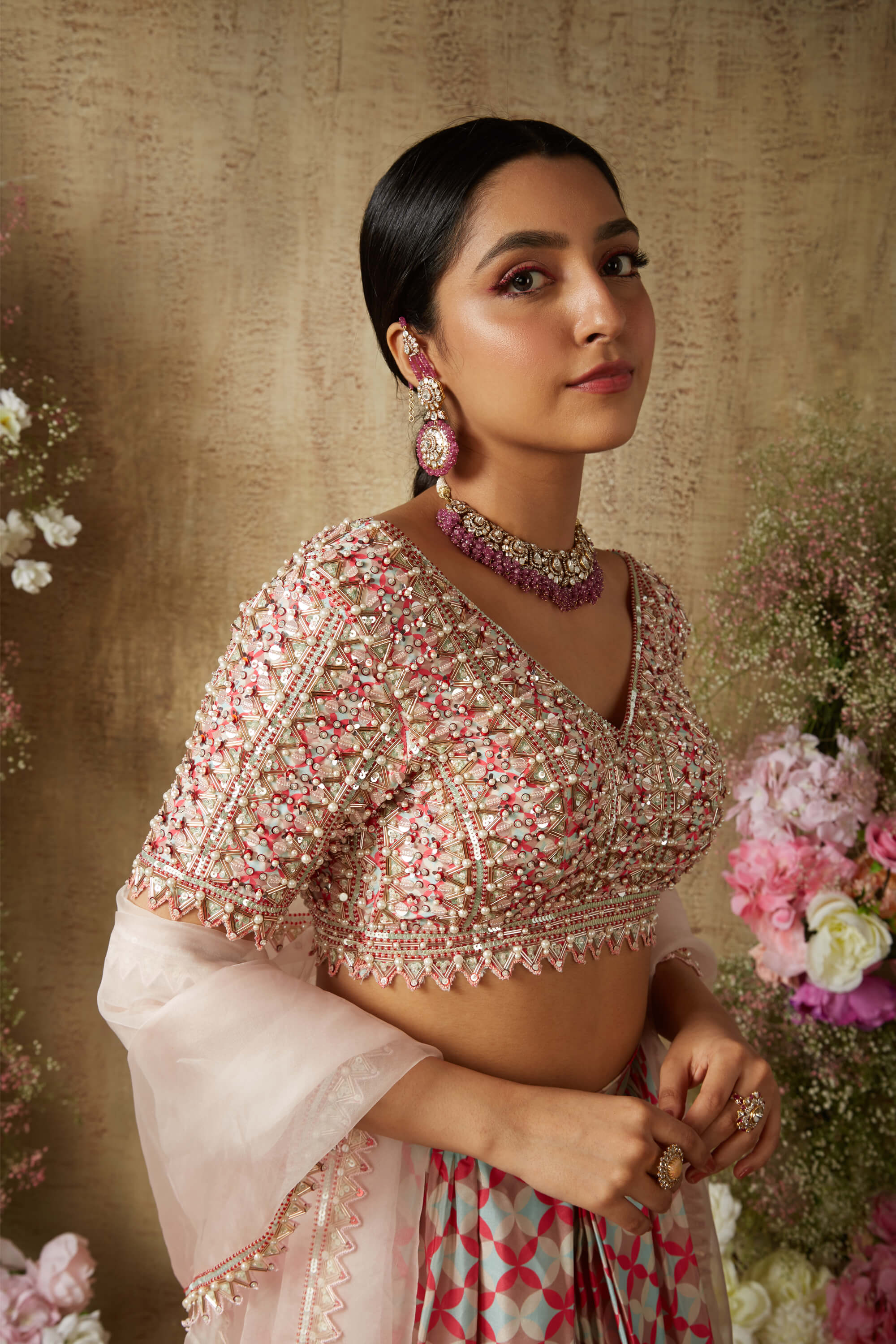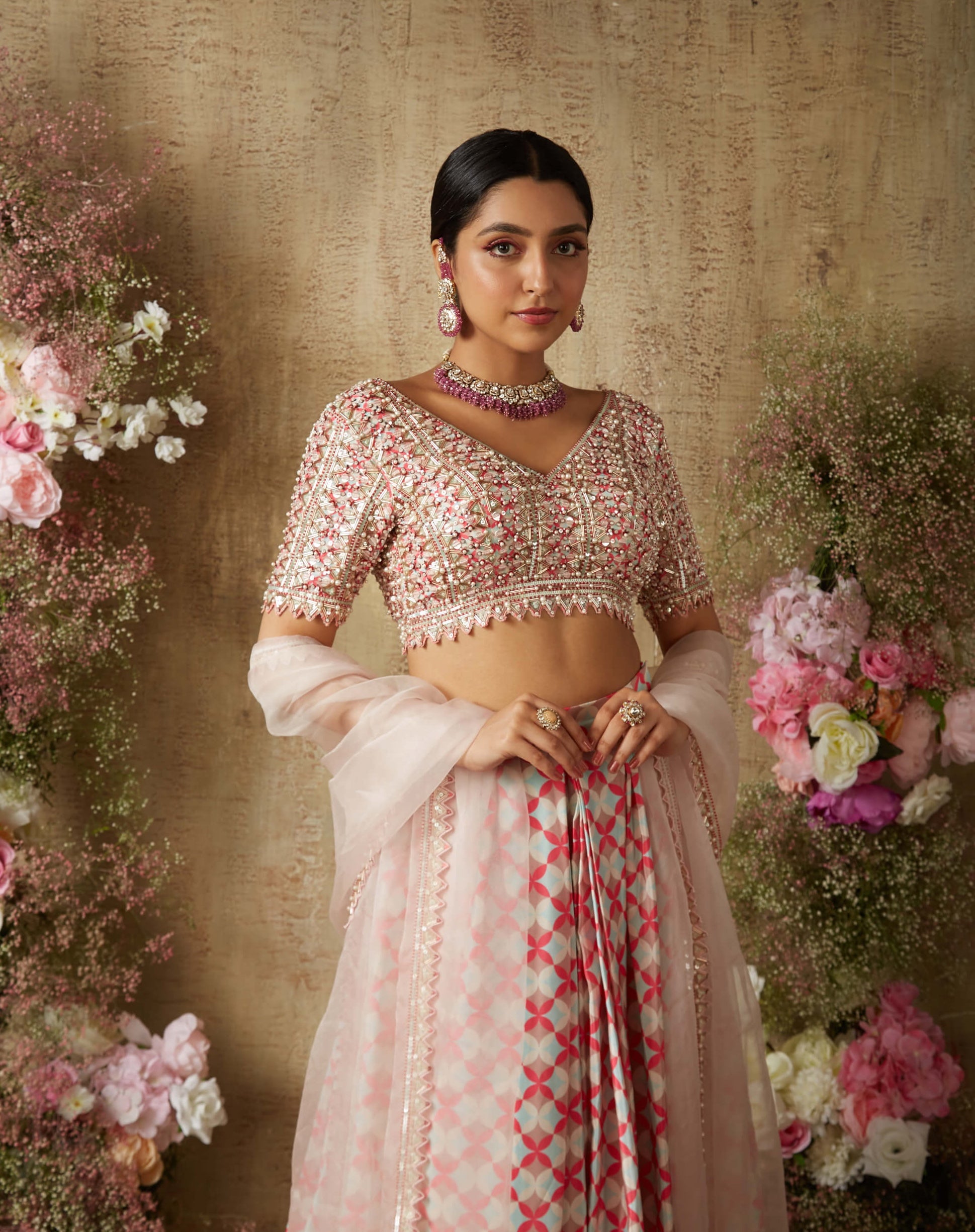 Presenting our exquisite printed double pleat lehenga set, complete with a fully embroidered blouse and a delicate organza dupatta. This ensemble effortlessly combines traditional craftsmanship with contemporary flair, showcasing intricate detailing and vibrant prints. The double pleat lehenga offers a regal charm with its structured silhouette, while the fully embroidered blouse adds a touch of opulence and elegance. Paired with the ethereal organza dupatta, this outfit is perfect for weddings and celebratory occasions, promising a timeless and graceful look that commands attention.