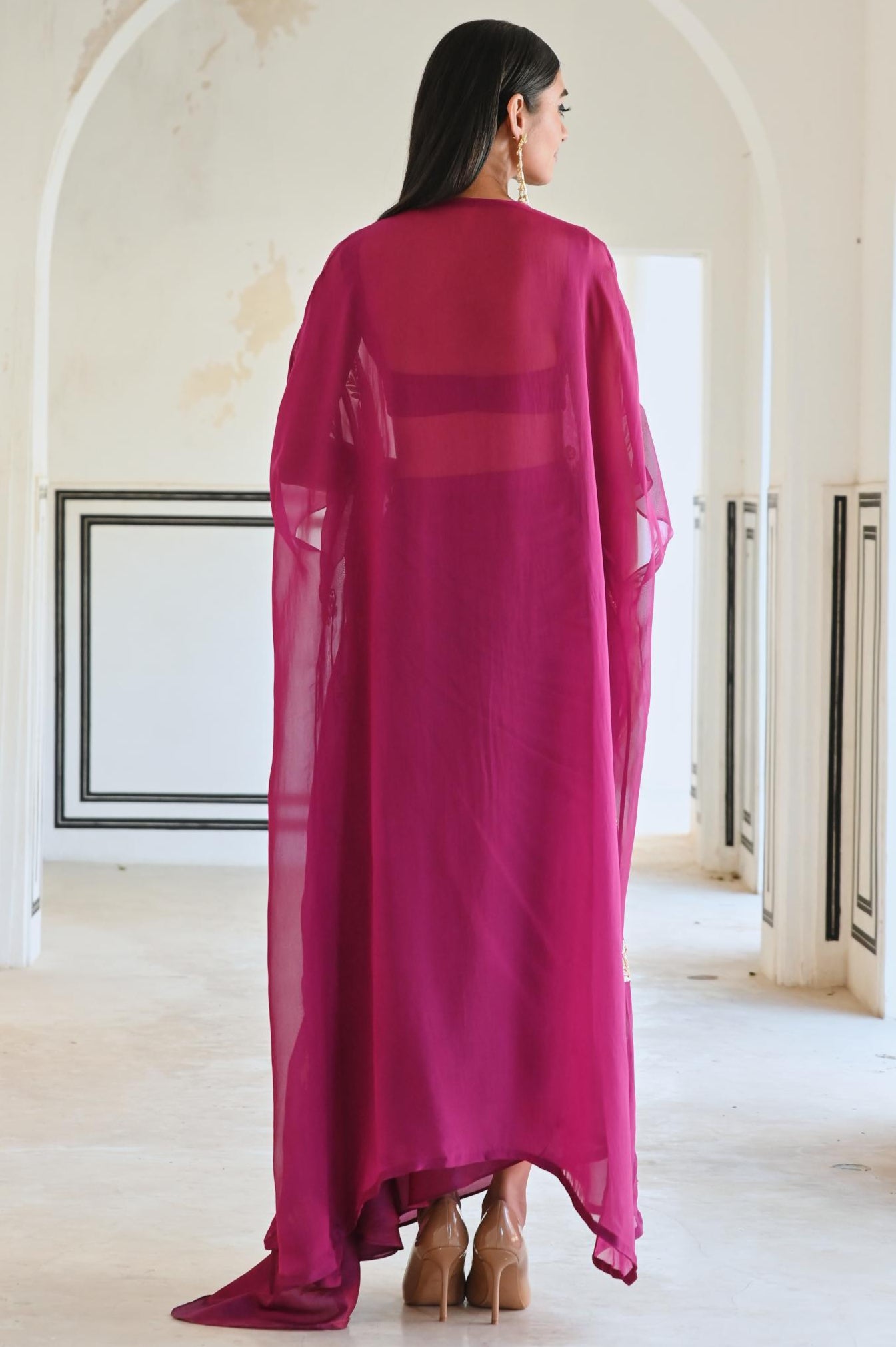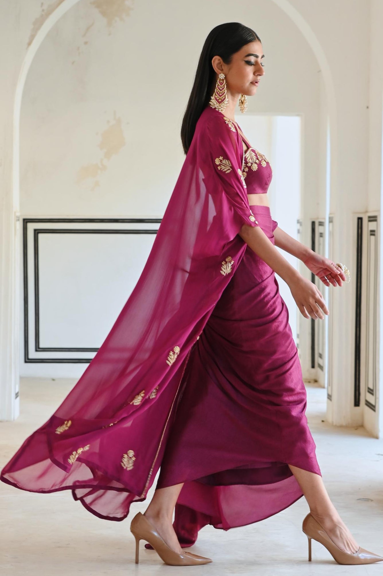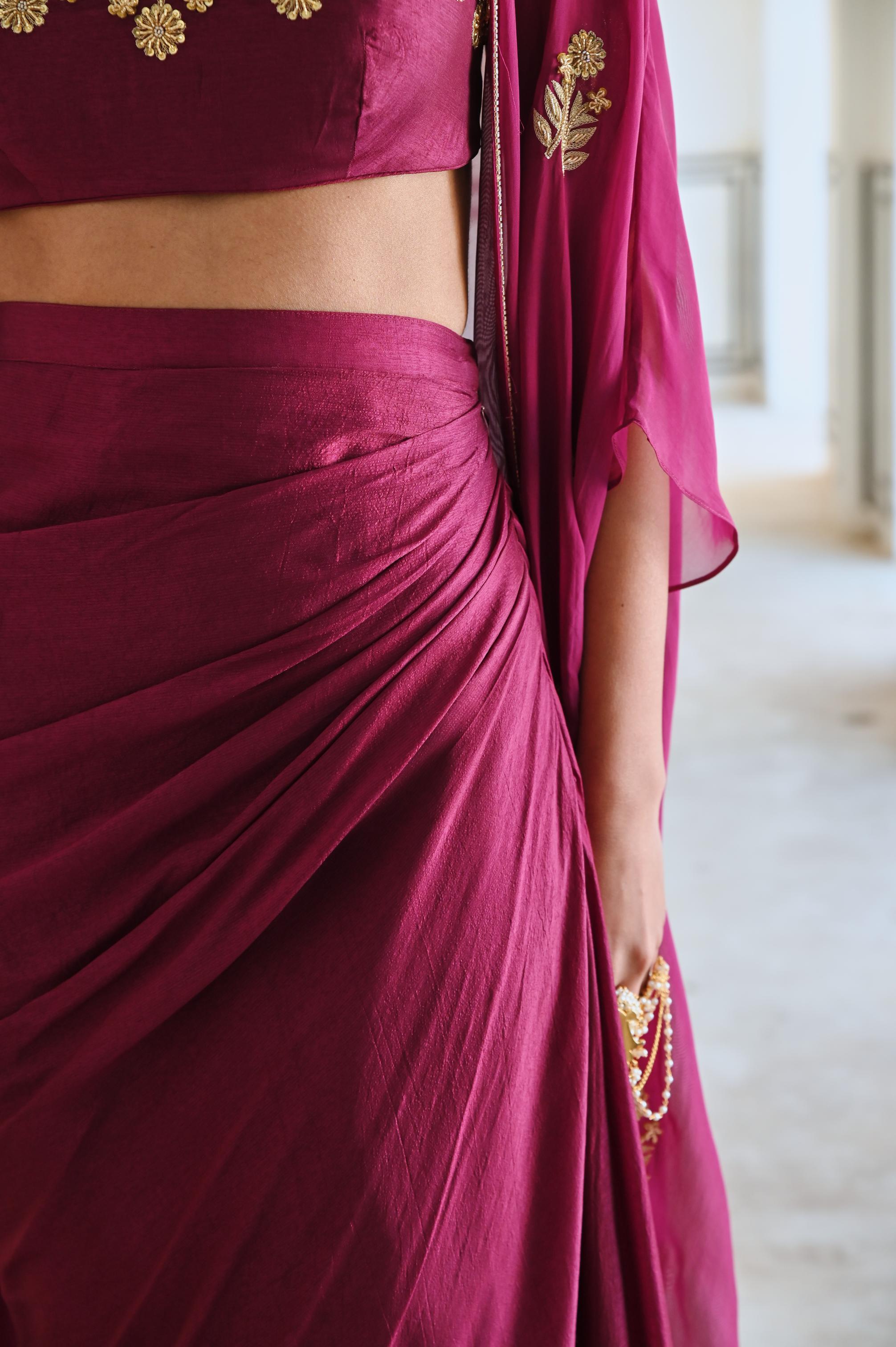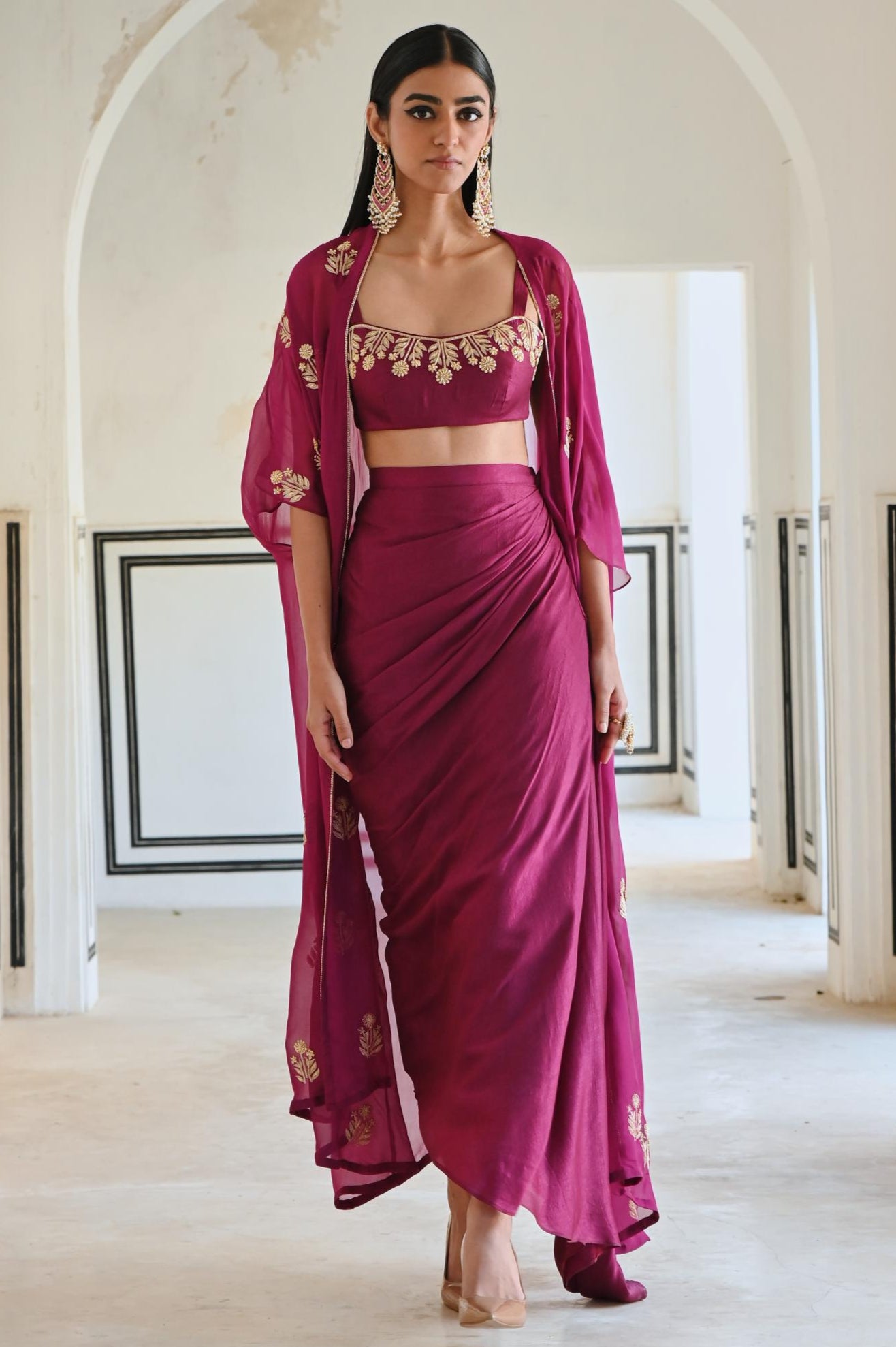 Step into effortless elegance with the Pink Rahi Jacket and Cowl Skirt. Featuring a stylish drape and contemporary design, this ensemble is perfect for festive celebrations, weddings, and special occasions.