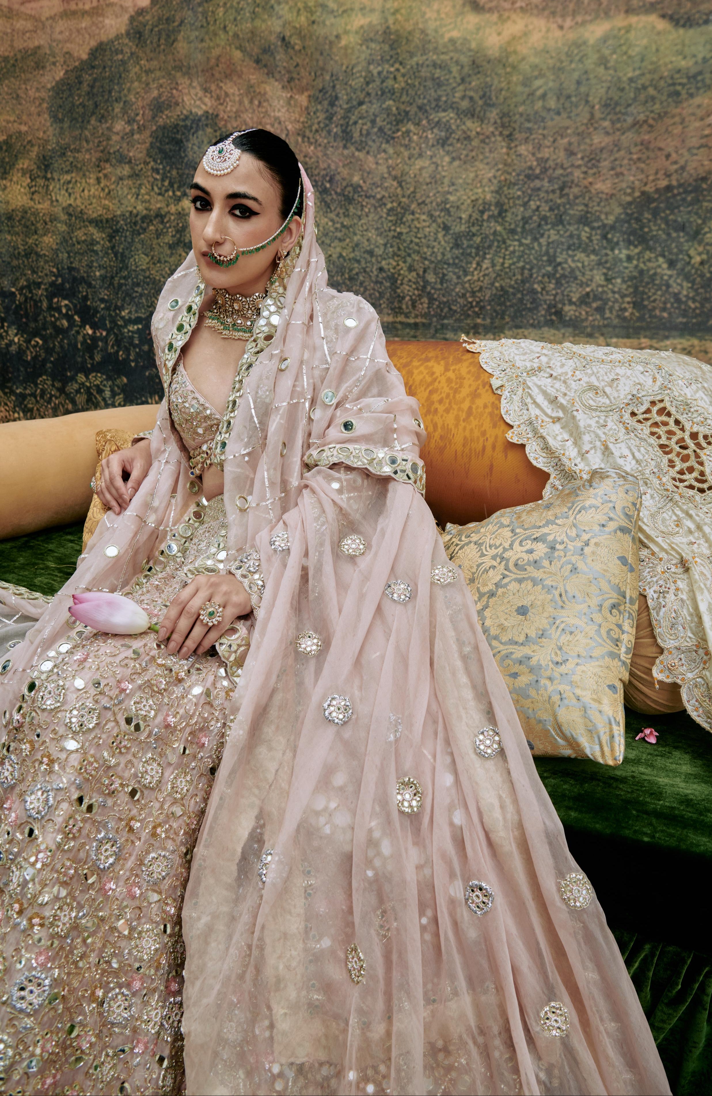 This pink organza lehenga features intricate embroidery and delicate gota work along the border, exuding timeless elegance. Paired with a matching organza blouse adorned with delicate mirror tassels and a luxurious tissue dupatta, this ensemble is the perfect blend of grace and sophistication for weddings and festive celebrations.