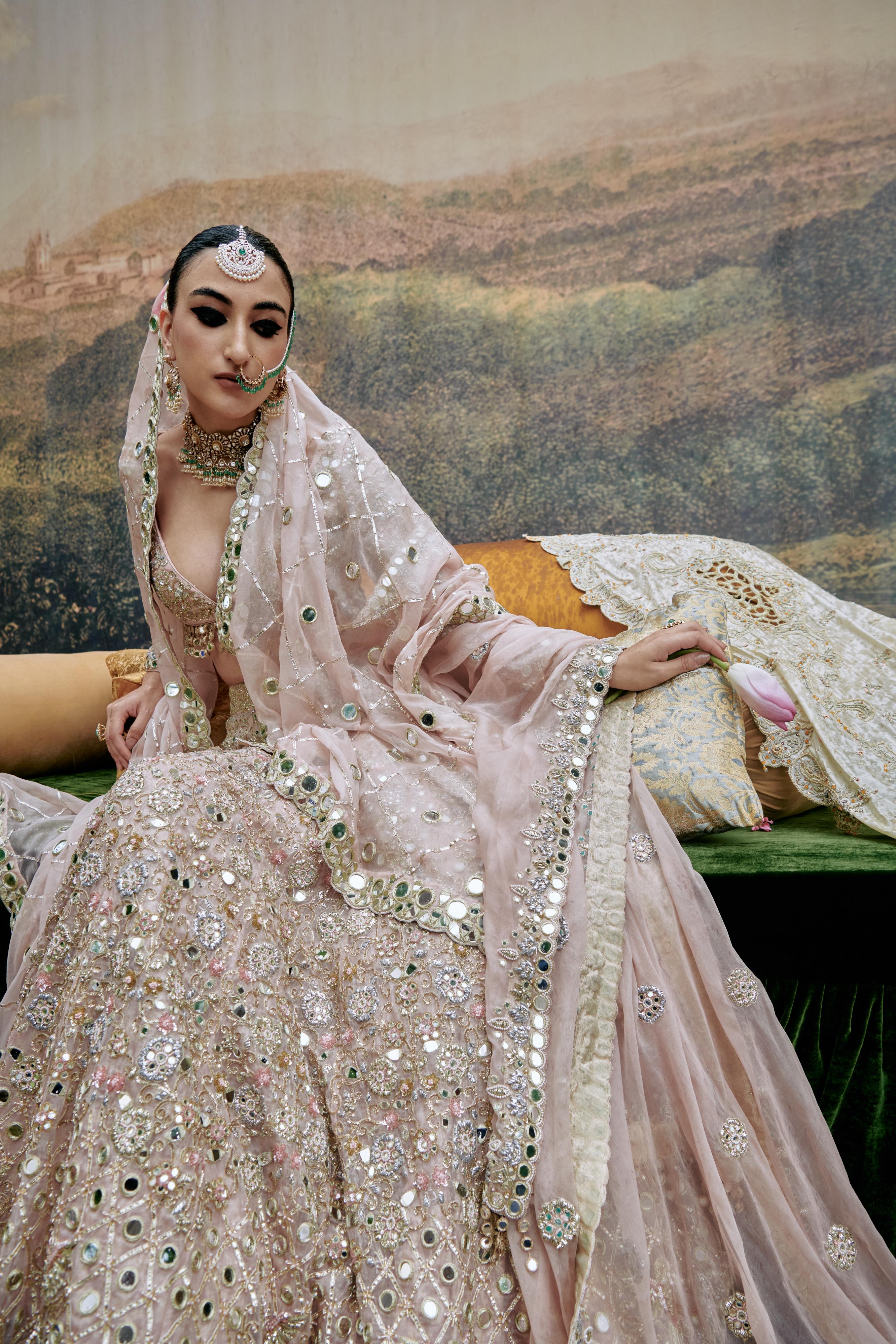 This pink organza lehenga features intricate embroidery and delicate gota work along the border exuding timeless elegance. Paired with a matching organza blouse adorned with delicate mirror tassels and a luxurious tissue dupatta this ensemble is the perfect blend of grace and sophistication for weddings and festive celebrations.