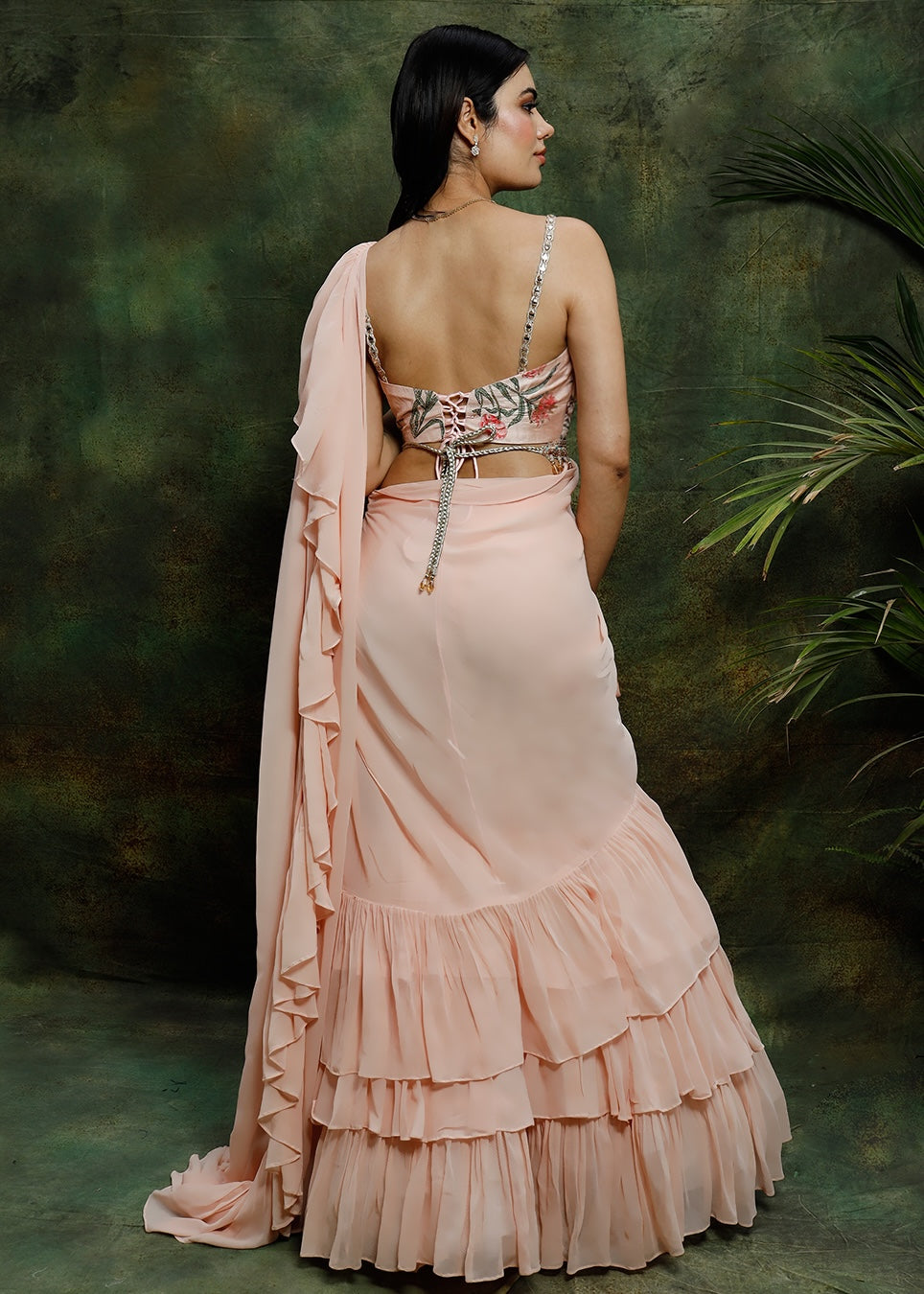 Wrapped in delicate floral prints and serene light pink tones, this ruffle saree exudes effortless grace. Crafted from soft georgette, it drapes elegantly, with cascading ruffles that add a touch of whimsy. The ensemble is beautifully complemented by an intricately embroidered blouse and a chic embellished belt, ensuring a polished and sophisticated finish to your attire.