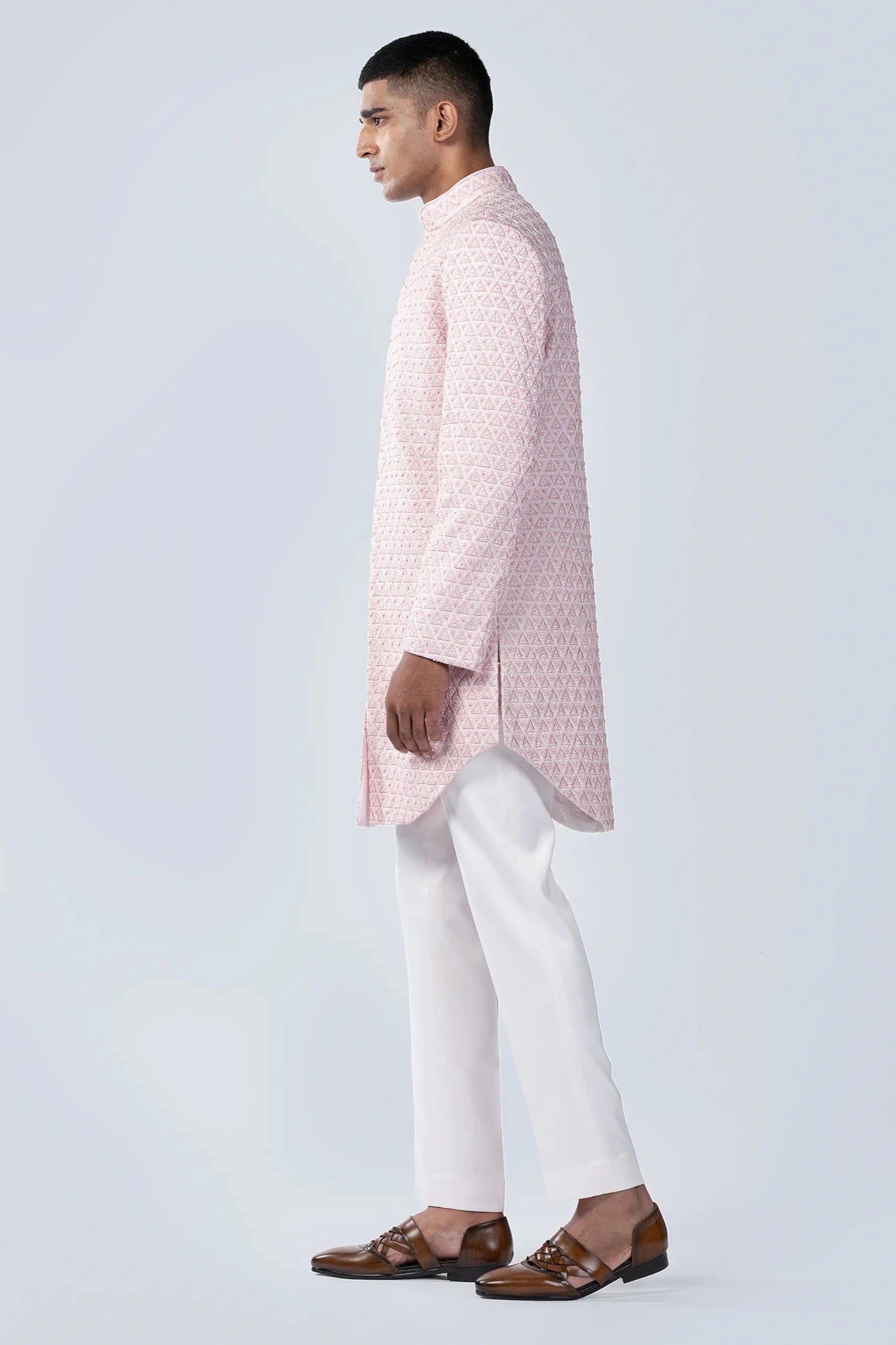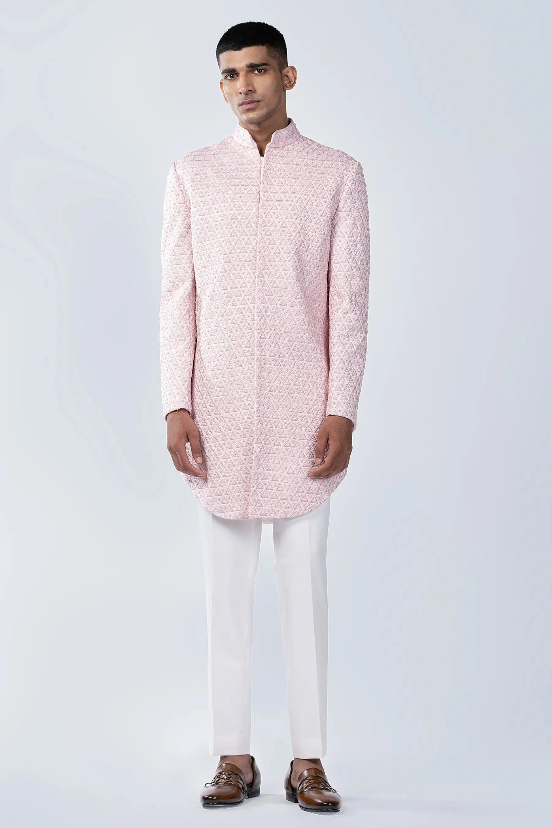 Step into a world of sophistication with the Pink Salli Threadwork Embroidered Bucket Cut Sherwani, a striking fusion of timeless craftsmanship and contemporary design. The soft pink hue sets an elegant tone, while the delicate Salli threadwork embroidery adds intricate texture and depth, creating a luxurious and refined appearance. Perfect for weddings, receptions, or any special occasion, this sherwani ensures you make a lasting impression with style and grace.