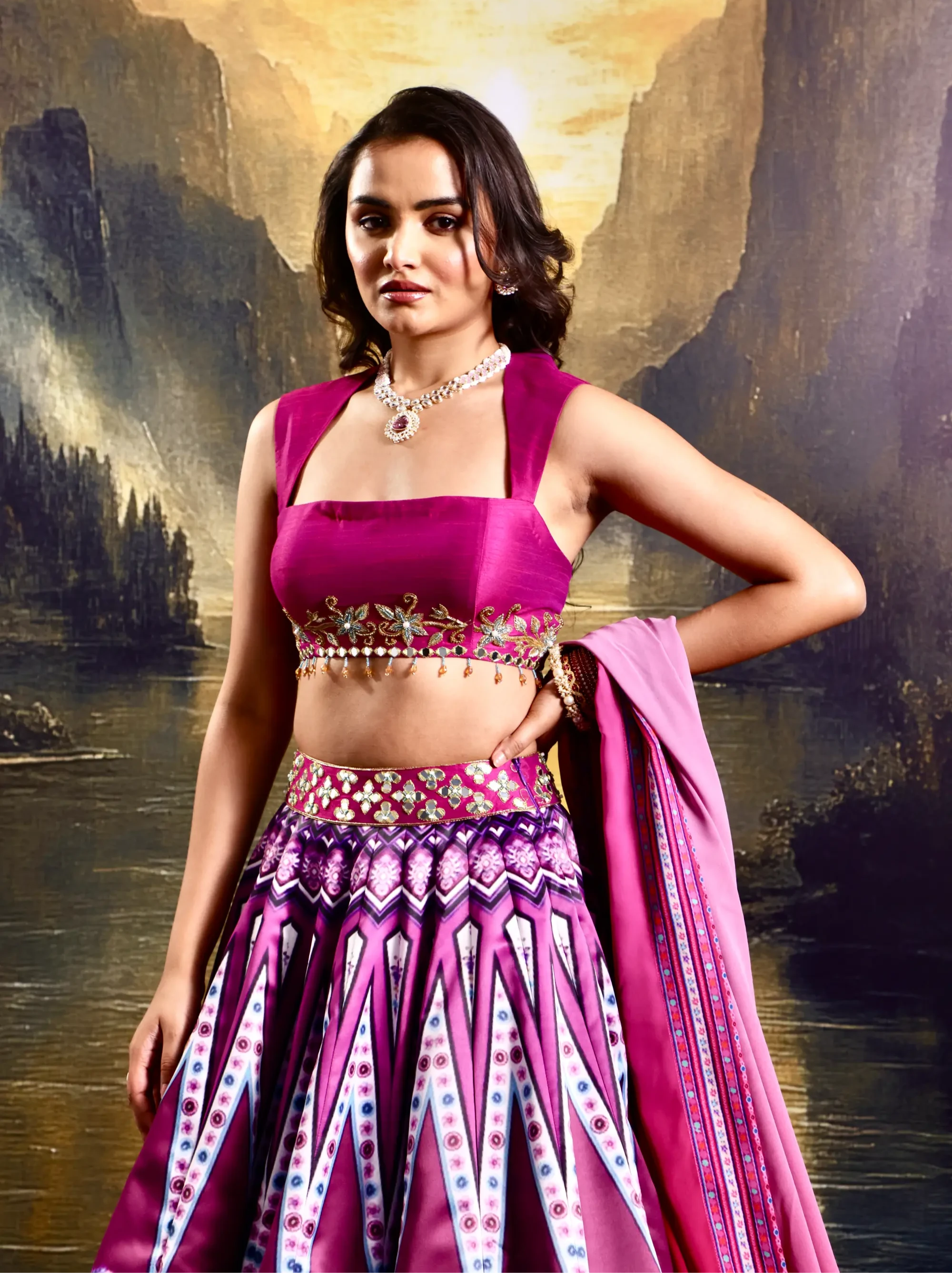 Pink satin printed lehenga with a hand-embroidered blouse & dupatta