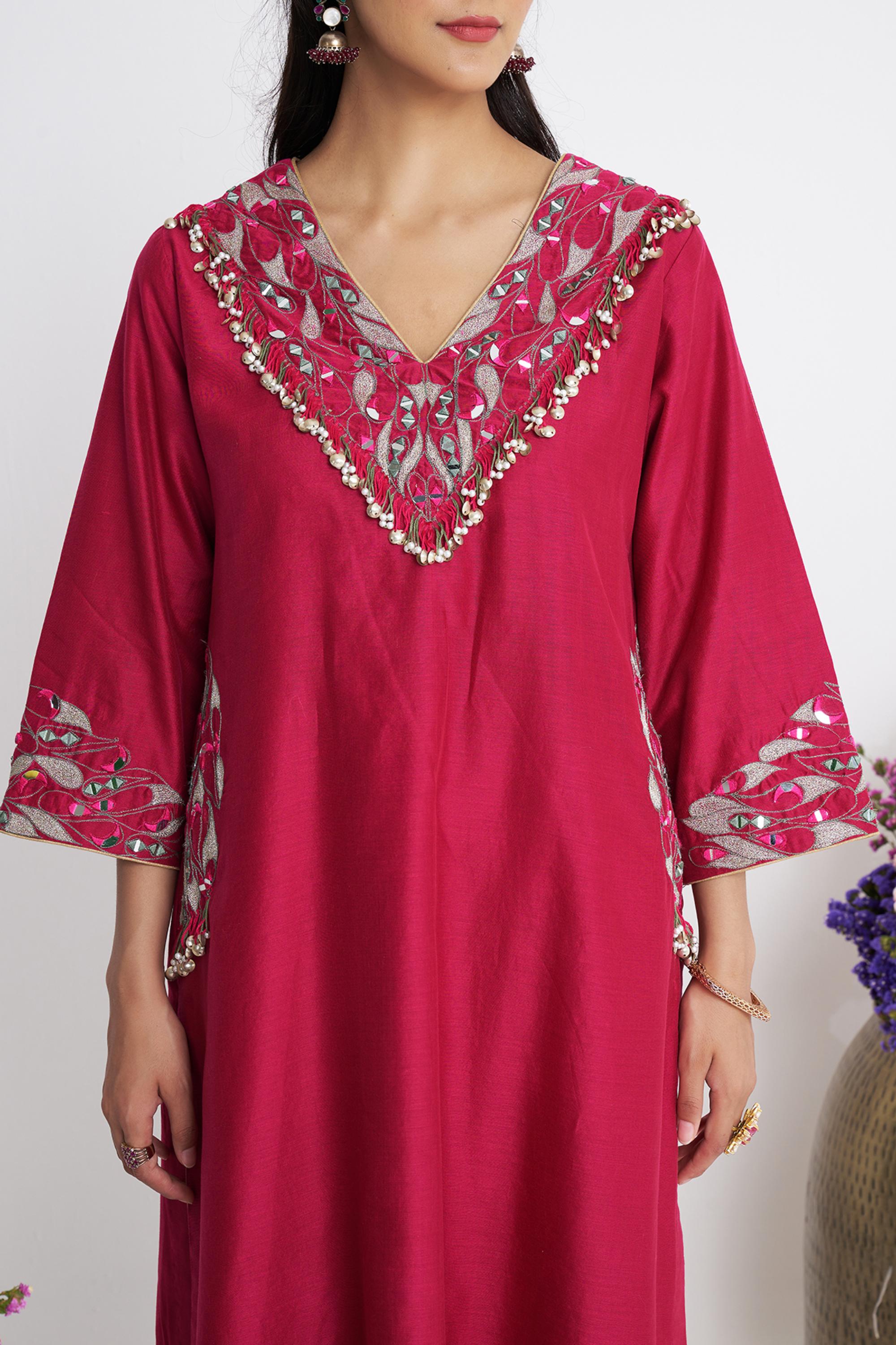 A joyful tapestry of color and craft, the Pink Satrangi Dhaaga Kurta Set is a vibrant celebration of Indian textile artistry. "Satrangi" meaning seven-colored, and "dhaaga" meaning thread, this ensemble features intricate multicolored threadwork that brings life and texture to every inch. The kurta’s lively embroidery is beautifully balanced with solid-toned bottoms and a coordinated dupatta, making it perfect for festive occasions, mehendi functions, or cultural gatherings. The Pink Satrangi Dhaaga Kurta Set is playful, eye-catching, and crafted for those who love color with purpose and poise.