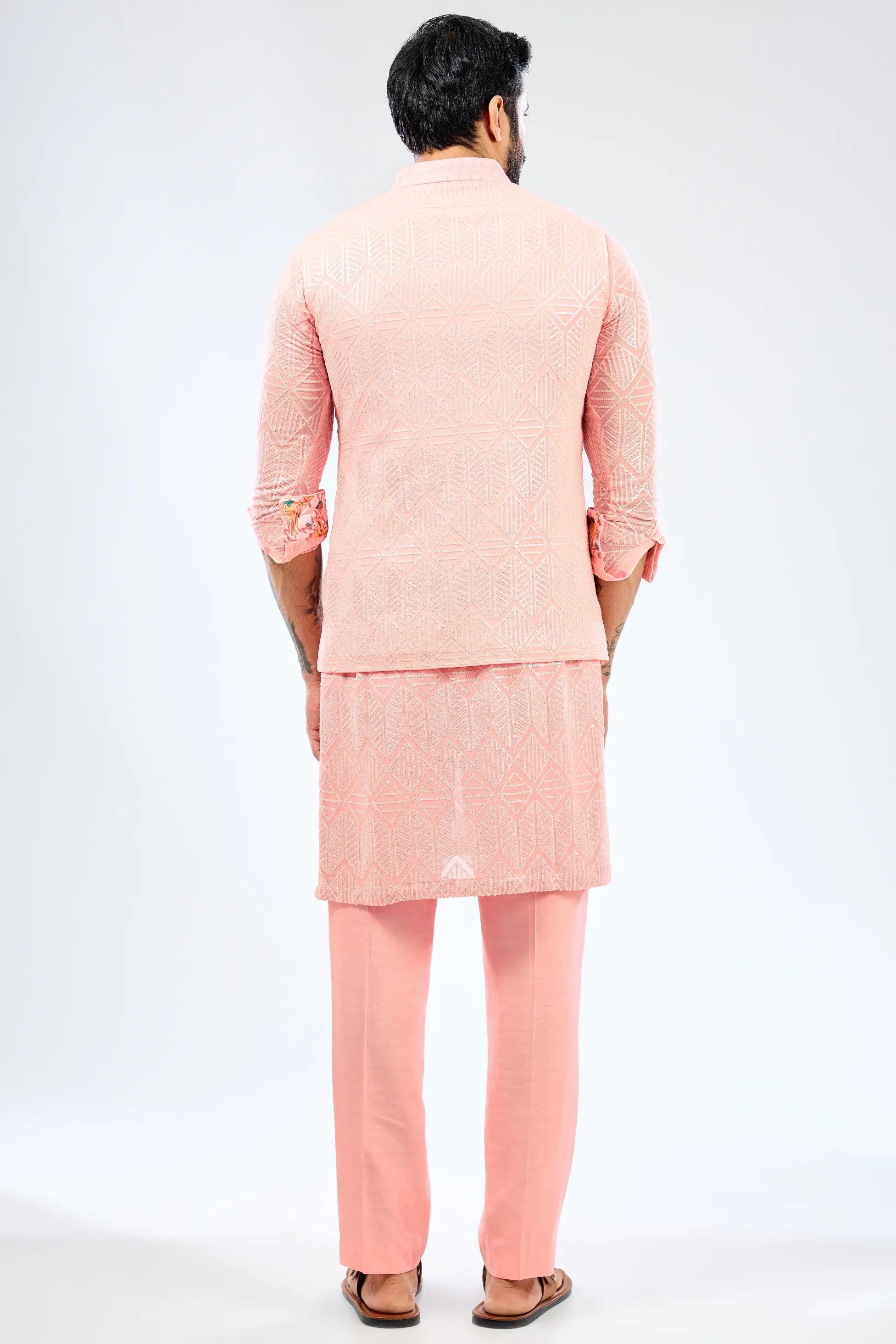 Pink sequin embroidered kurta with bundi and cotton silk pant