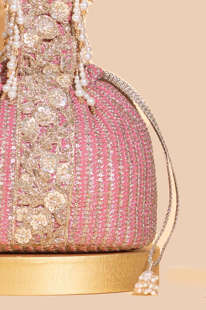 Elevate your festive look with our embroidered potli, crafted from luxurious georgette and poly silk. Featuring intricate net lace, woven gold thread drawstrings, and a hand-embroidered zardosi handle, this piece exudes elegance. Adorned with pearl fringes and tassels, it's the perfect accessory to complement your wedding or celebration ensemble with grace and sophistication.