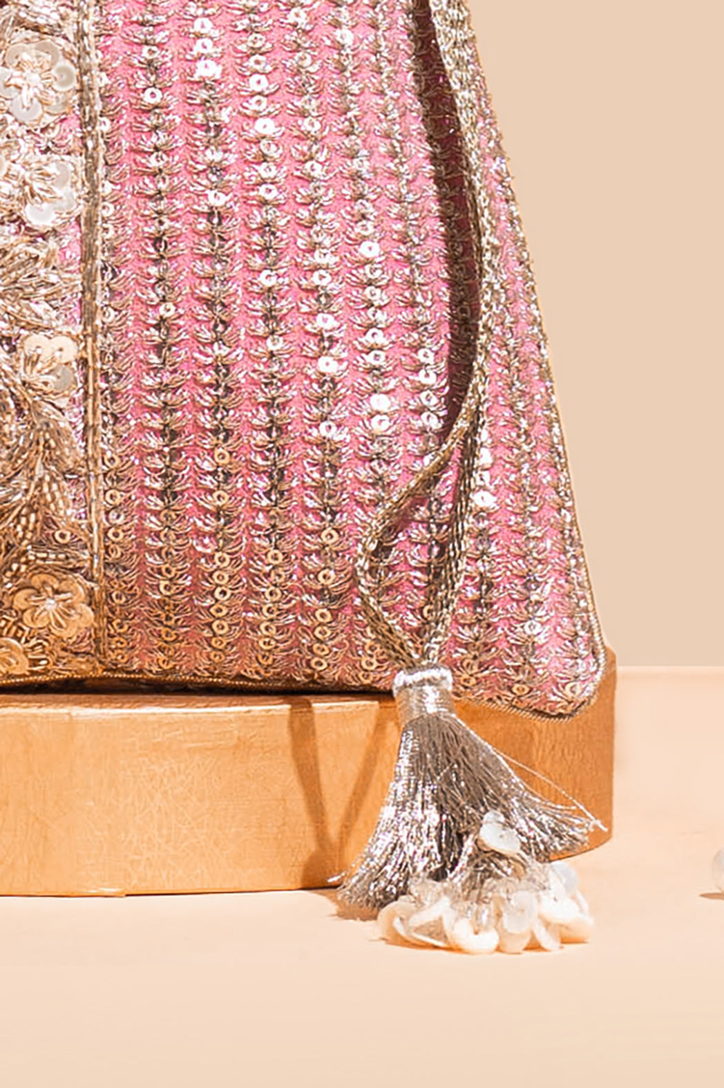 Crafted from embroidered georgette fabric with a poly satin lining, this exquisite clutch features woven golden thread drawstrings and a hand-embroidered zardosi handle. Adorned with elegant gold zari tassels, it adds a touch of sophistication and tradition to any festive or wedding ensemble, making it the perfect accessory for special occasions.