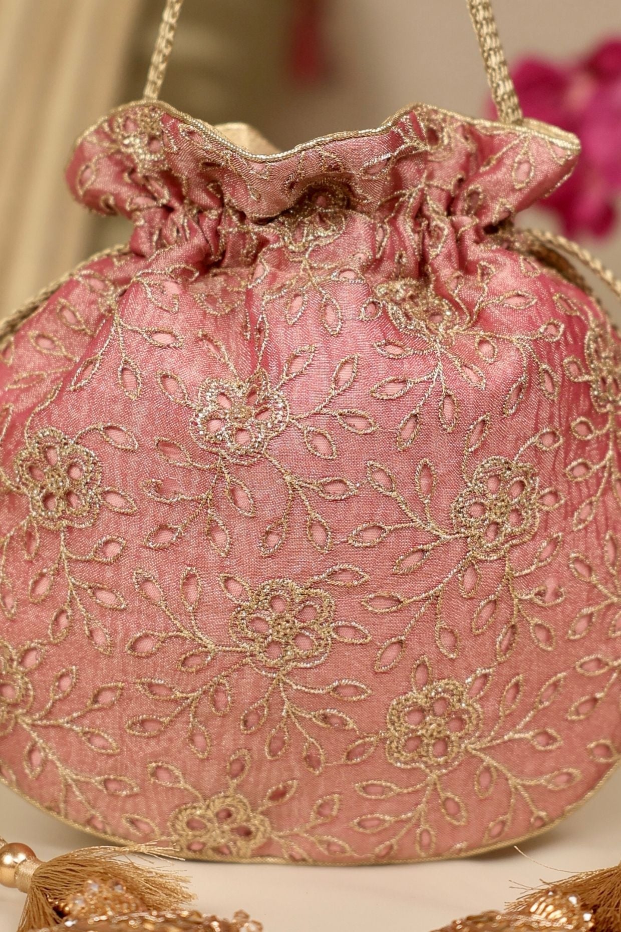 The Pink Tarang Cutwork Potli is a vibrant blend of traditional charm and detailed craftsmanship. Featuring intricate cutwork in a lively pink hue, this elegant potli adds a playful yet refined touch to festive and bridal ensembles. With a roomy interior and classic drawstring closure, it balances style with function. Ideal for weddings, celebrations, or special occasions, it's a statement accessory for those who love timeless elegance with a bold splash of color.