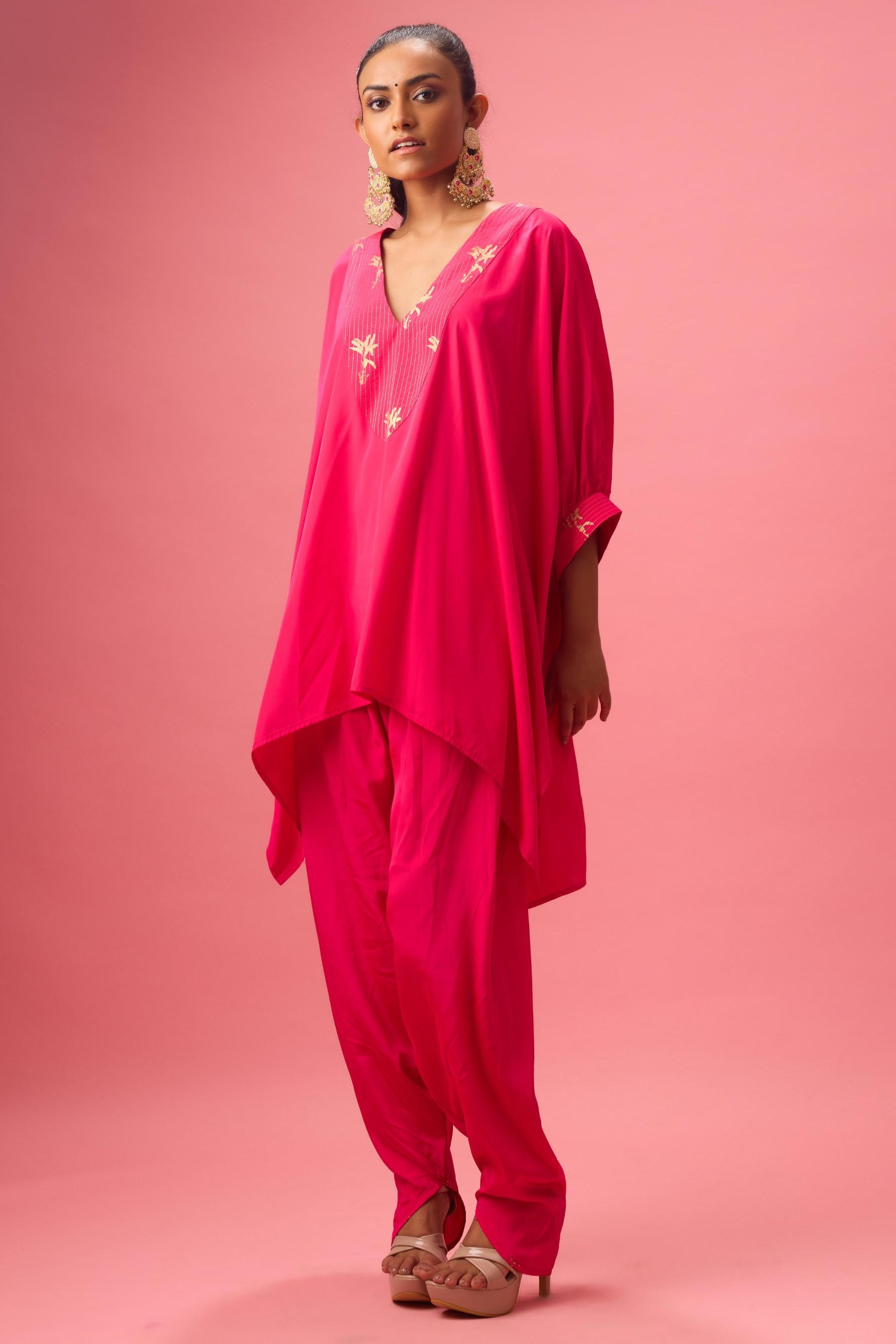 Pink v neckline with dhagai and foiling kaftan detailing paired with salwar