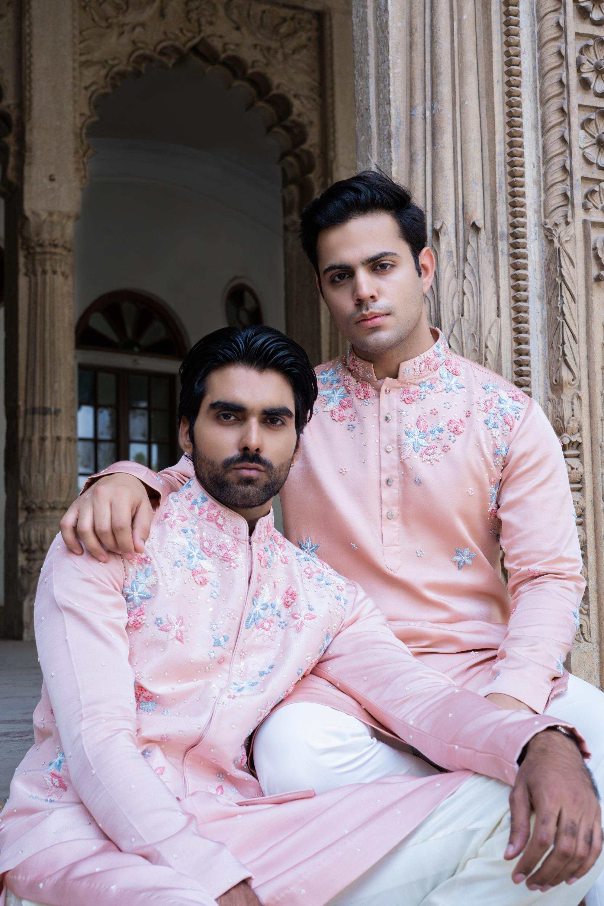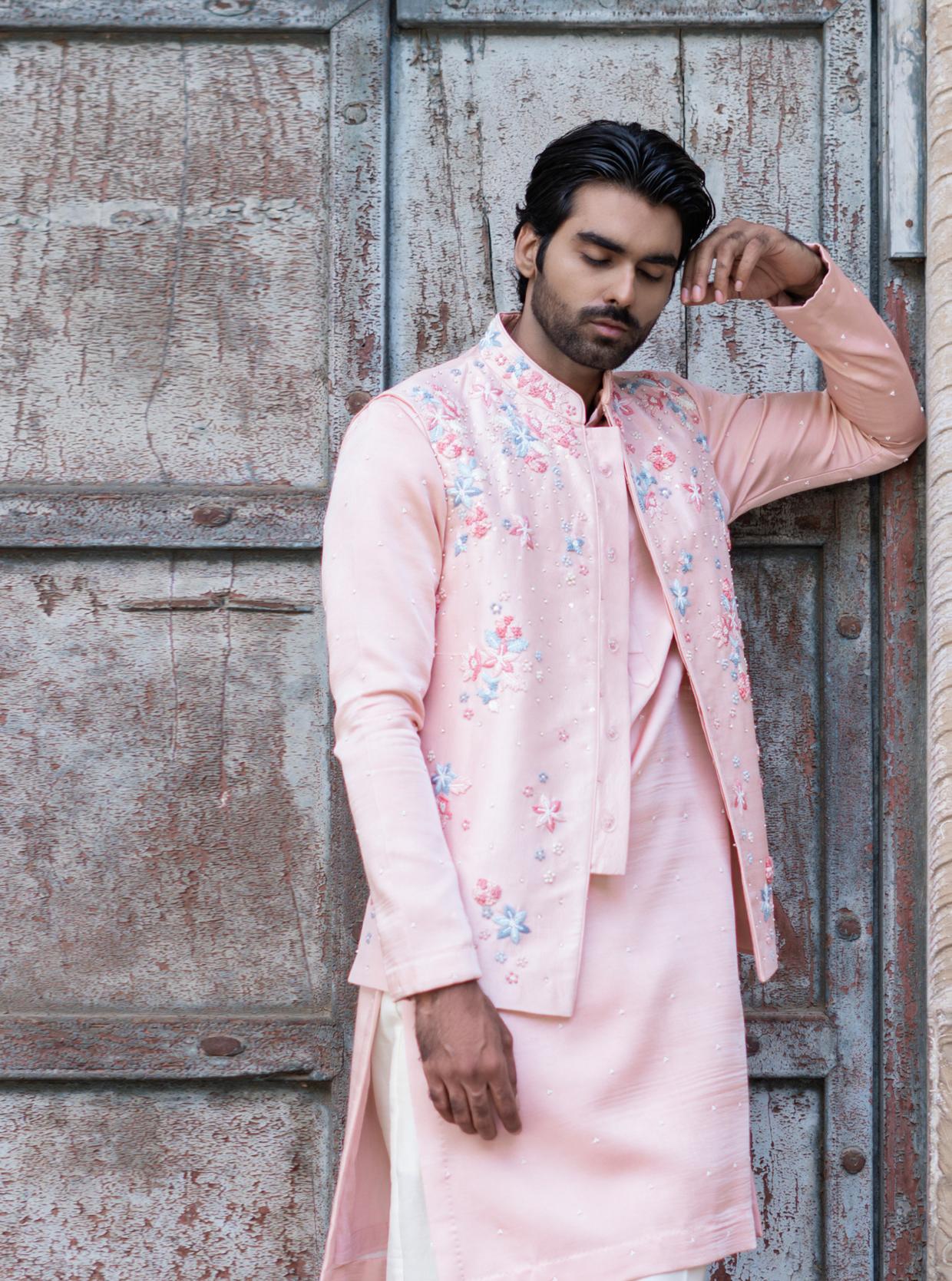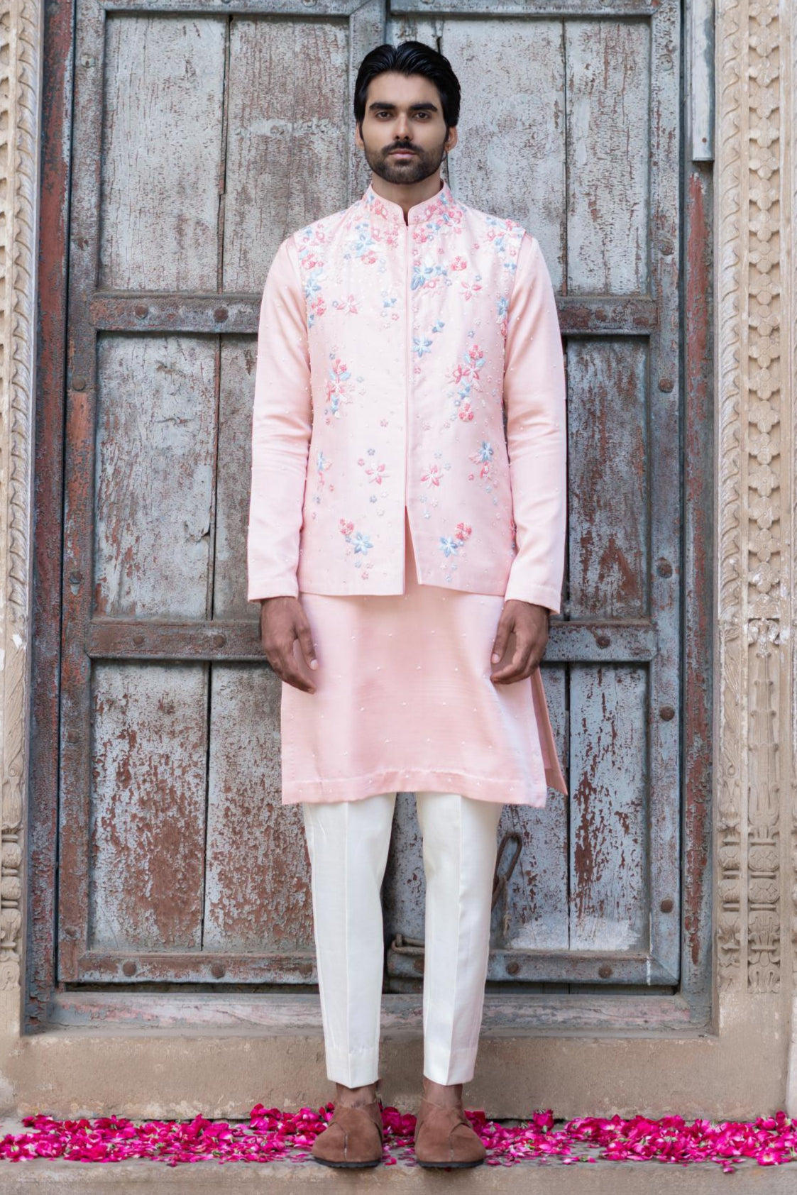 Graceful and grounded in tradition, the Pink Vatsalya Bandi Set is a symbol of refined elegance. Featuring a tailored kurta and churidar paired with a structured bandi (Nehru jacket), this set is crafted in a soft pink tone that radiates warmth and poise. The bandi is highlighted with subtle embroidery or texture, making it ideal for festive occasions, pre-wedding functions, or cultural gatherings. The Pink Vatsalya Bandi Set offers a perfect blend of comfort, heritage, and understated sophistication—designed for the modern gentleman with a classic heart.
