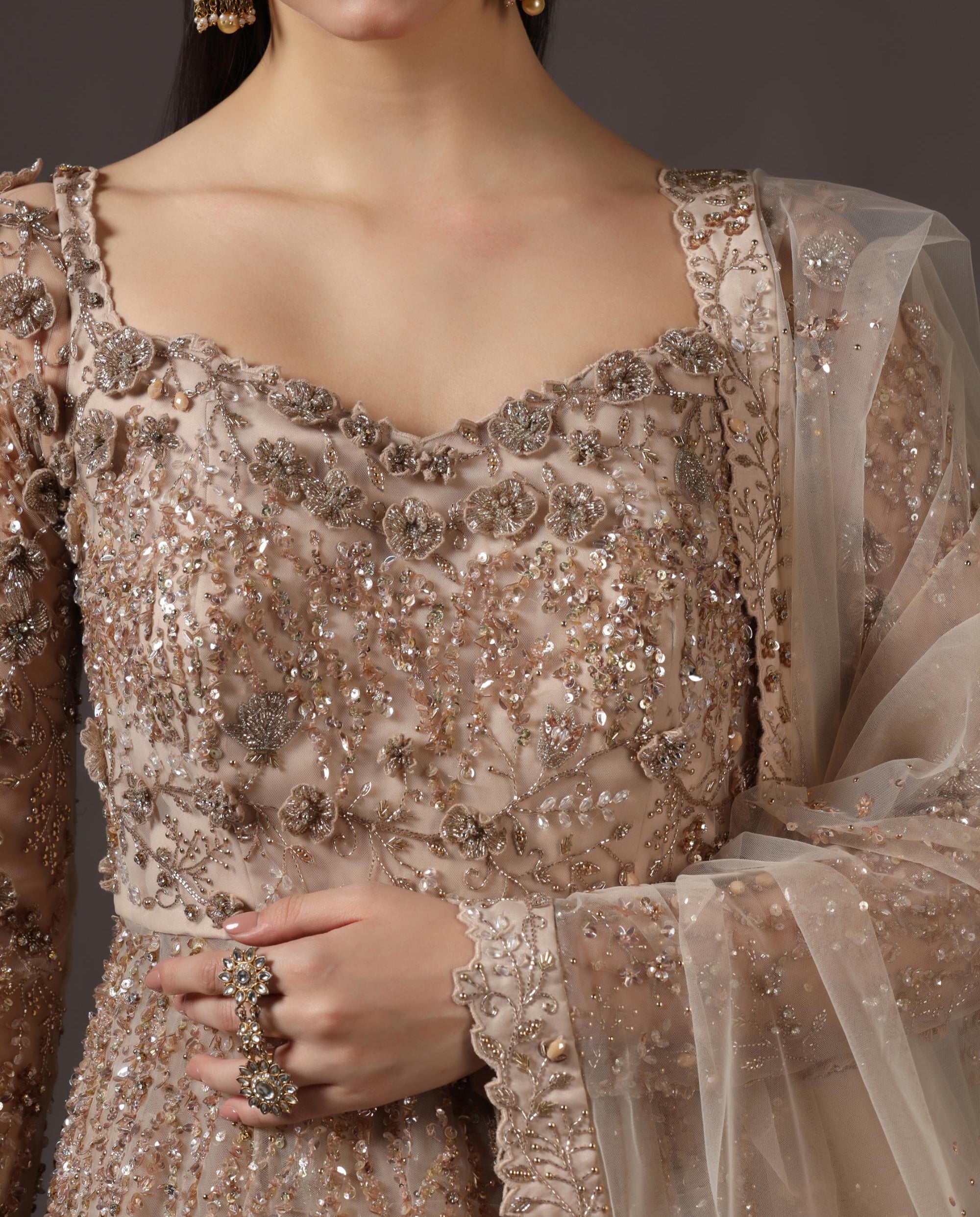 The Beige Peplum Top with Lehenga Set by Pooja Peshoria is a stunning example of how contemporary cuts can beautifully merge with traditional craftsmanship. This lehenga set is designed for women who appreciate the artistry of Indian fashion while embracing modern silhouettes. The highlight of this lehenga set is the structured peplum top, crafted from luxurious silk and embellished with intricate bead, crystal, and sequin embroidery. The peplum cut accentuates the waistline, giving a flattering shape that enhances the overall feminine appeal. Its neutral beige tone makes it versatile, pairing effortlessly with gold, silver, or even colorful accessories. The voluminous lehenga skirt is made from layers of lightweight fabric that ensure comfortable movement while maintaining a regal presence. Each pleat falls gracefully, allowing the skirt to flow with elegance as you walk or dance. The embroidery on the skirt is minimal yet impactful, drawing focus to the beautifully detailed peplum top. A sheer dupatta with delicately embroidered borders completes the lehenga set, adding a layer of traditional refinement. This versatile outfit is perfect for a wedding reception, engagement party, or even as a non-traditional bridal ensemble for women seeking a sophisticated yet contemporary look. The lehenga set can be styled with heavy chandelier earrings and bangles for a full festive effect or with minimal jewelry for a sleek, modern approach. Gold heels and a classic clutch can add the finishing touches to elevate your reception look. Pooja Peshoria’s Beige Peplum Top with Lehenga Set captures the essence of occasion wear — offering timeless craftsmanship, flattering cuts, and the perfect balance between modernity and tradition. This lehenga set is more than just an outfit; it’s a statement of style, elegance, and individuality.