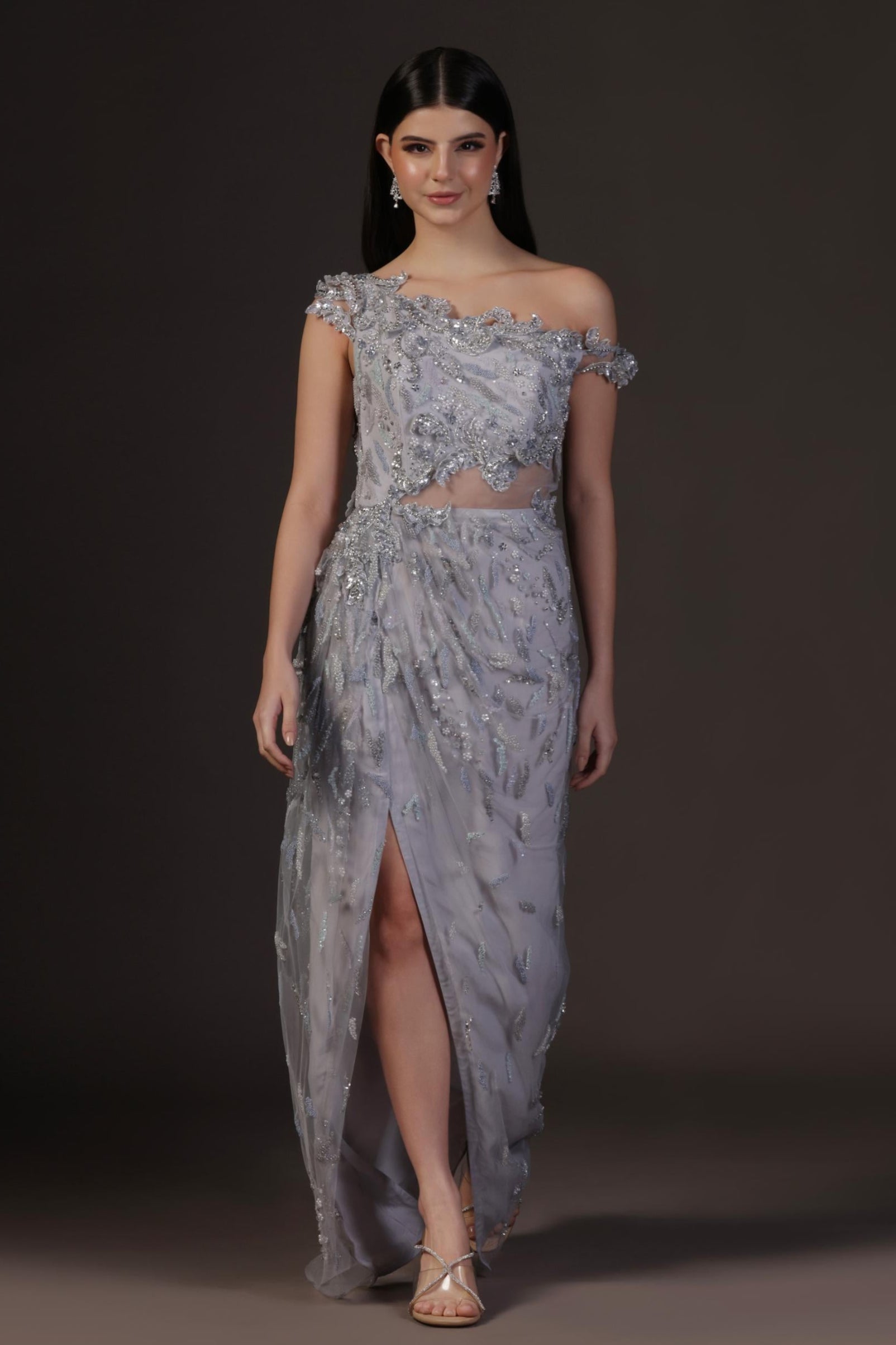 The blue draped gown by Pooja Peshoria is a striking fusion of contemporary style and timeless elegance, perfect for cocktail evenings or joyous sangeet celebrations. This gown is designed to highlight the wearer’s silhouette through its masterful draping, which adds fluidity and movement to the entire look. Crafted from premium fabrics, the gown offers both luxurious texture and breathable comfort, ensuring you feel confident all night long. Every curve of the body is accentuated by the soft yet structured folds, creating a harmonious balance between form-fitting allure and graceful flow. The rich blue hue is universally flattering, lending an air of sophistication and poise. This gown features a floor-length cut that elongates the frame, making it a perfect choice for women who appreciate elegance with a modern twist. The gown is ideal for cocktail parties, sangeet events, or formal receptions where glamour is a must. Pair this gown with statement jewelry pieces like sparkling chandelier earrings or a sleek bracelet to complement its refined design. The simple neckline leaves room for bold makeup or intricate hairstyles, giving you the flexibility to personalize your look. Pooja Peshoria’s blue draped gown stands as a celebration of craftsmanship, design, and the art of dressing for special moments. With this gown in your collection, you’re assured of making an entrance that lingers in memory long after the event ends.