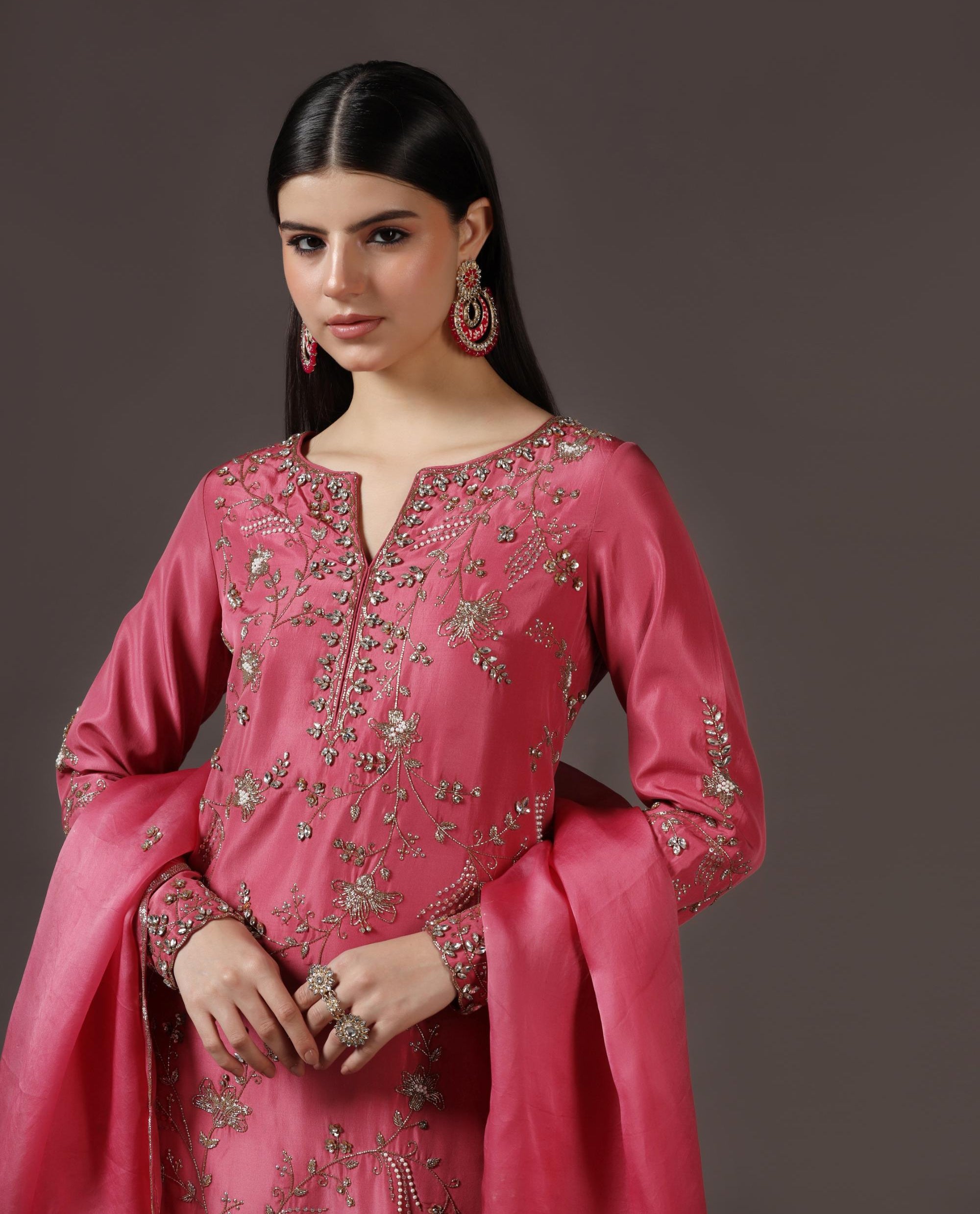 Radiate charm and grace with Pooja Peshoria’s Pink Silk Kurta Set, a festive ensemble that blends timeless tradition with understated luxury. Crafted from lustrous silk, the kurta drapes elegantly, catching the light with every movement. Its delicate embroidery enhances the soft pink hue, adding a subtle festive sparkle without overpowering the look. Paired with matching straight-cut bottoms and a beautifully coordinated dupatta, this kurta set offers effortless style and comfort for day-to-evening celebrations. Ideal for festive gatherings, pre-wedding rituals, or cultural occasions, it is a versatile piece that pairs beautifully with both minimal and statement jewelry. This kurta set embodies Pooja Peshoria’s signature finesse — refined, graceful, and designed for women who appreciate sophisticated festive wear.