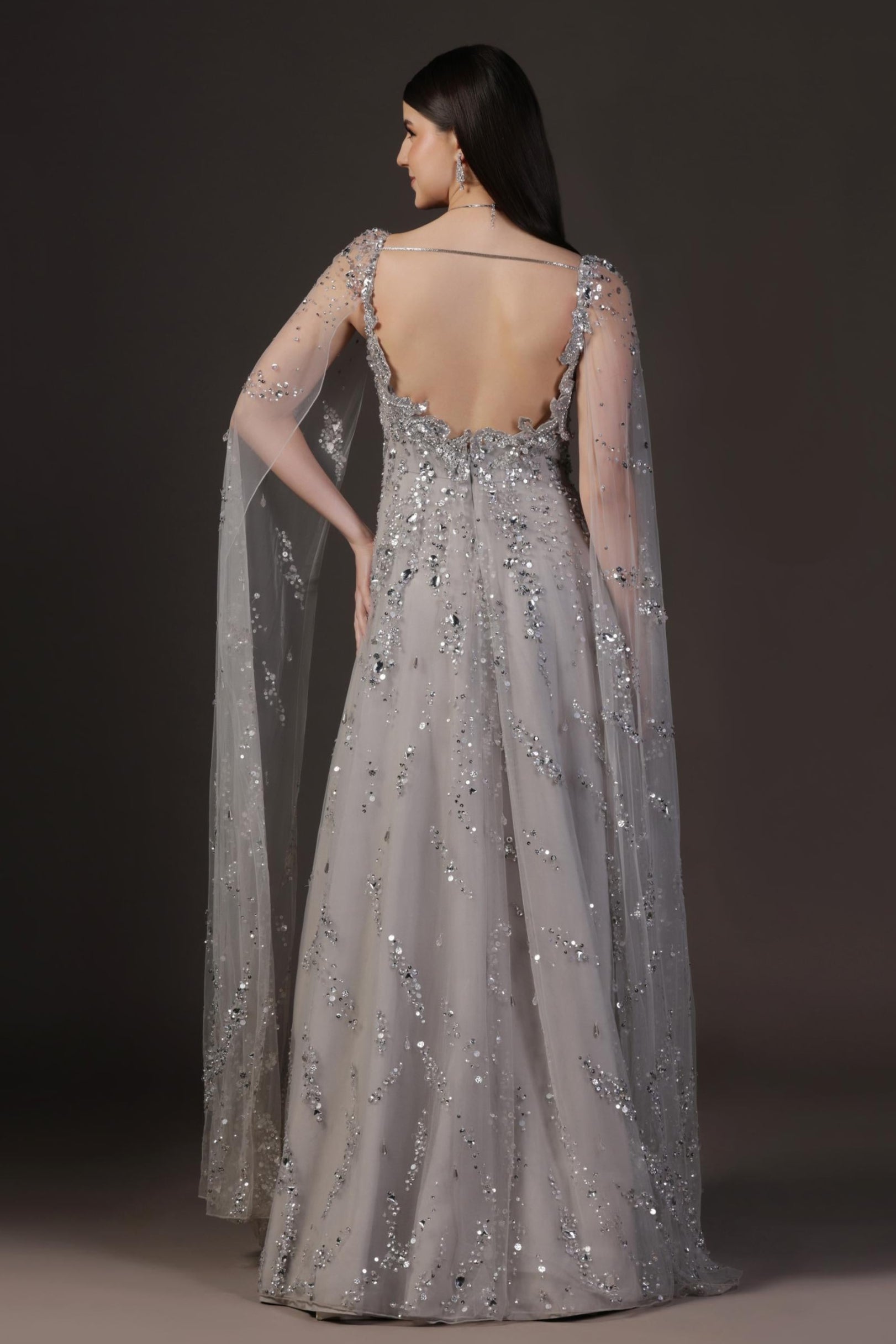 Step into the spotlight with Pooja Peshoria’s silver crystal embellished gown with cape, an exquisite masterpiece designed for wedding receptions and grand celebrations. This gown with cape combines the elegance of a flowing silhouette with the modern drama of an attached sheer cape, creating a truly regal presence. The silver hue is adorned with intricate crystal embellishments, catching the light with every movement and adding a touch of glamour. Crafted with precision, this piece offers both comfort and opulence, making it perfect for bridesmaids or guests aiming to make a statement. A harmonious blend of contemporary couture and timeless appeal, it is the ultimate choice for those who want to look unforgettable at special occasions.