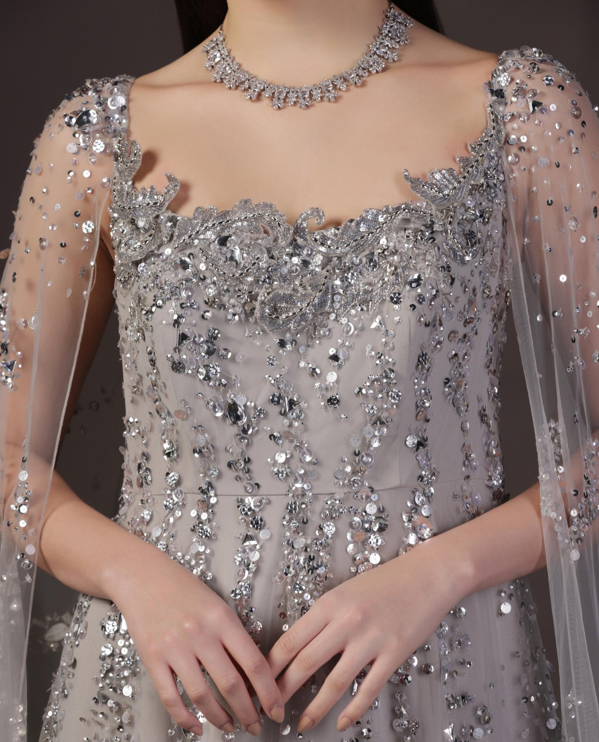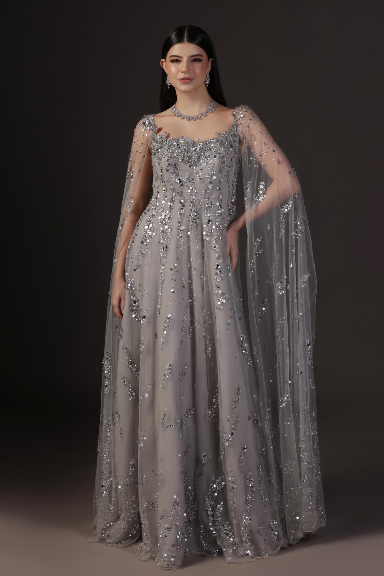 The silver crystal embellished gown with cape by Pooja Peshoria is a stunning couture creation that redefines eveningwear elegance. This gown with cape is meticulously designed to combine sophistication and grandeur, perfect for a wedding reception or any high-profile event. The shimmering silver fabric serves as a captivating base, adorned with intricate crystal embellishments that add depth, texture, and a luxurious sparkle. The attached cape flows gracefully from the shoulders, enhancing the drama and giving this gown with cape an ethereal, red-carpet-ready appeal. Every detail of this gown with cape reflects Pooja Peshoria’s commitment to craftsmanship and couture artistry. The structured yet comfortable fit allows for ease of movement, ensuring you can dance the night away while maintaining a regal posture. The floor-length silhouette elongates the frame, while the soft cape adds a layer of sophistication unmatched in traditional gowns. This gown with cape is versatile enough for bridesmaids seeking an opulent look or wedding guests aiming to leave a lasting impression. Pair it with diamond or crystal accessories to complement the shimmering embellishments, and choose a sleek updo or soft curls for a polished finish. Designed for women who appreciate both fashion-forward design and timeless elegance, this gown with cape is a piece you will cherish in your wardrobe for years to come.