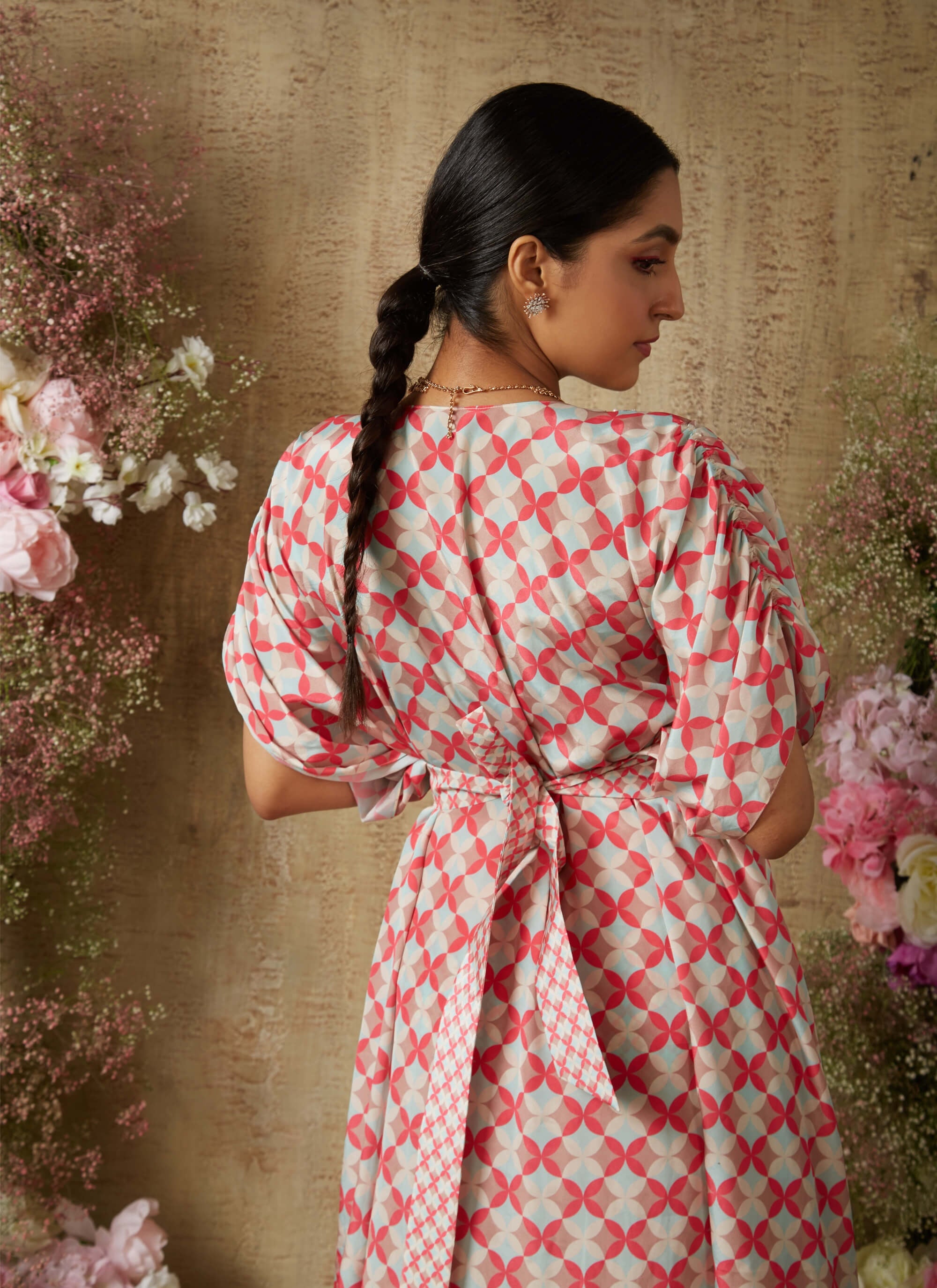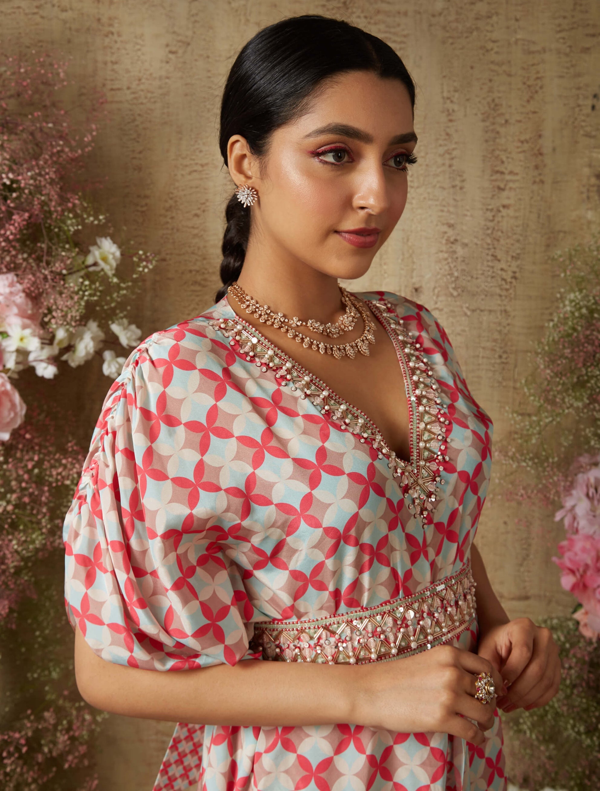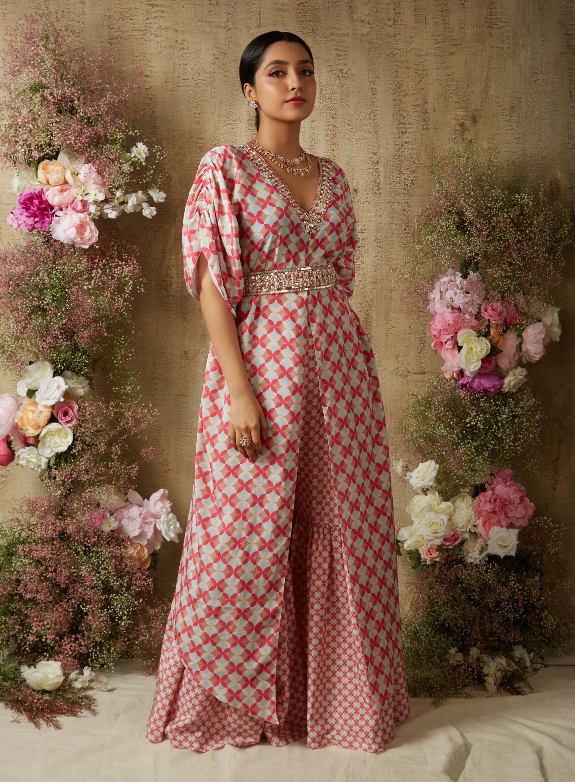 Presenting our striking print-on-print kaftan ensemble paired with sharara pants and a waist belt for a refined look. This outfit seamlessly merges bold patterns with sophisticated design elements, offering a contemporary twist on traditional attire. The kaftan's intricate prints harmonize beautifully with the flowing silhouette of the sharara pants, while the waist belt accentuates the waistline for a flattering fit. Perfect for occasions where you want to make a statement with elegance and flair, this ensemble embodies modern style with cultural richness.