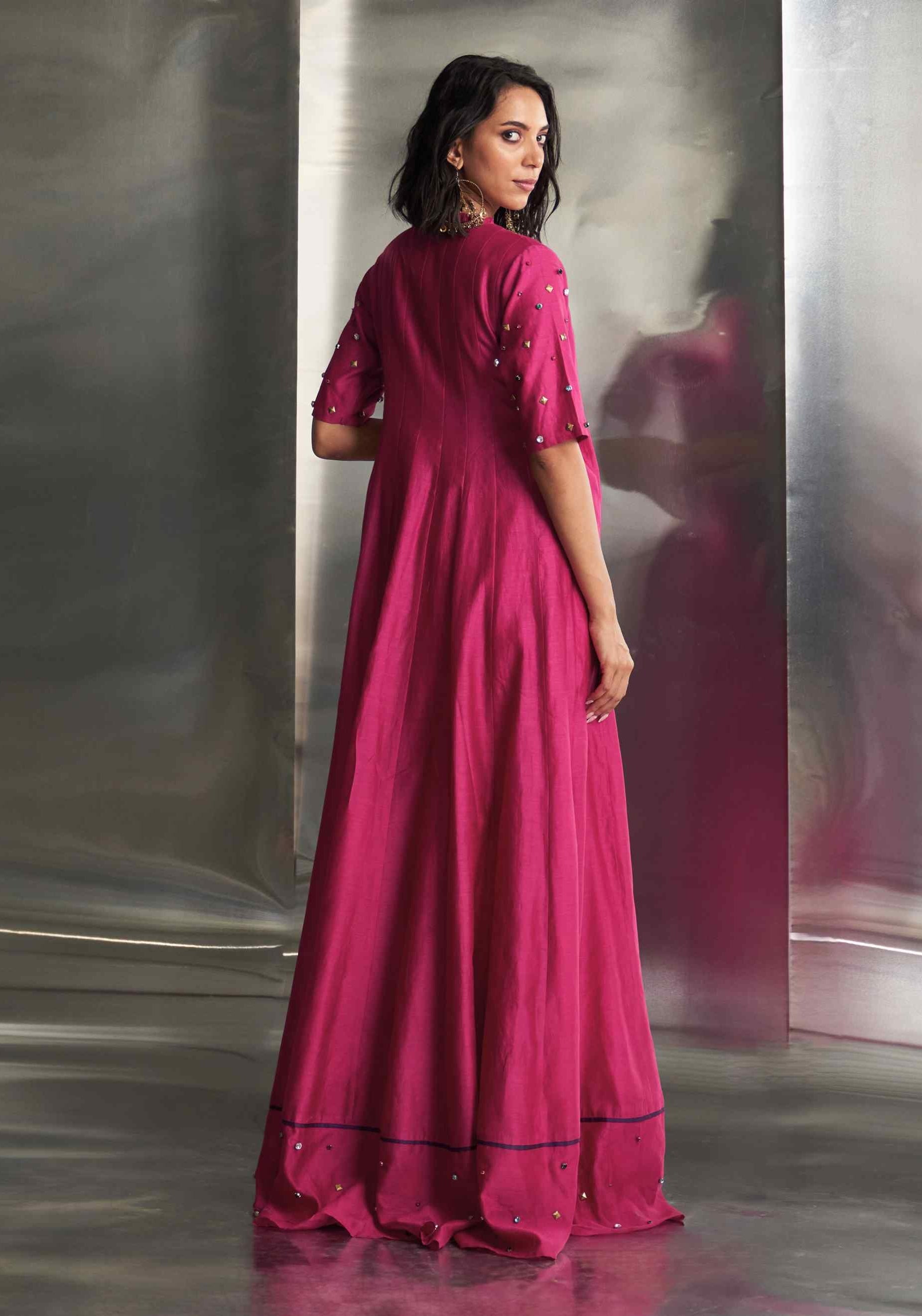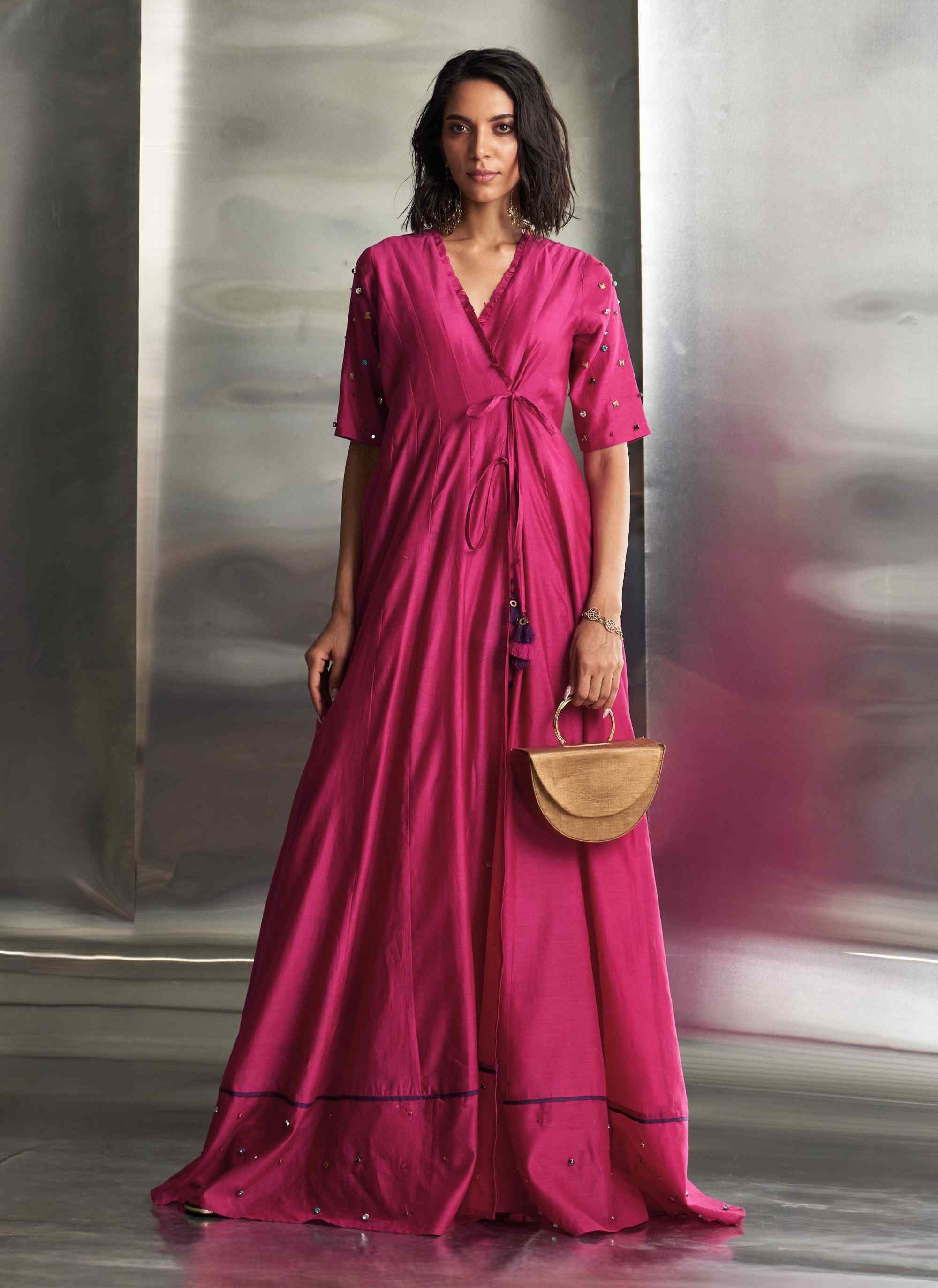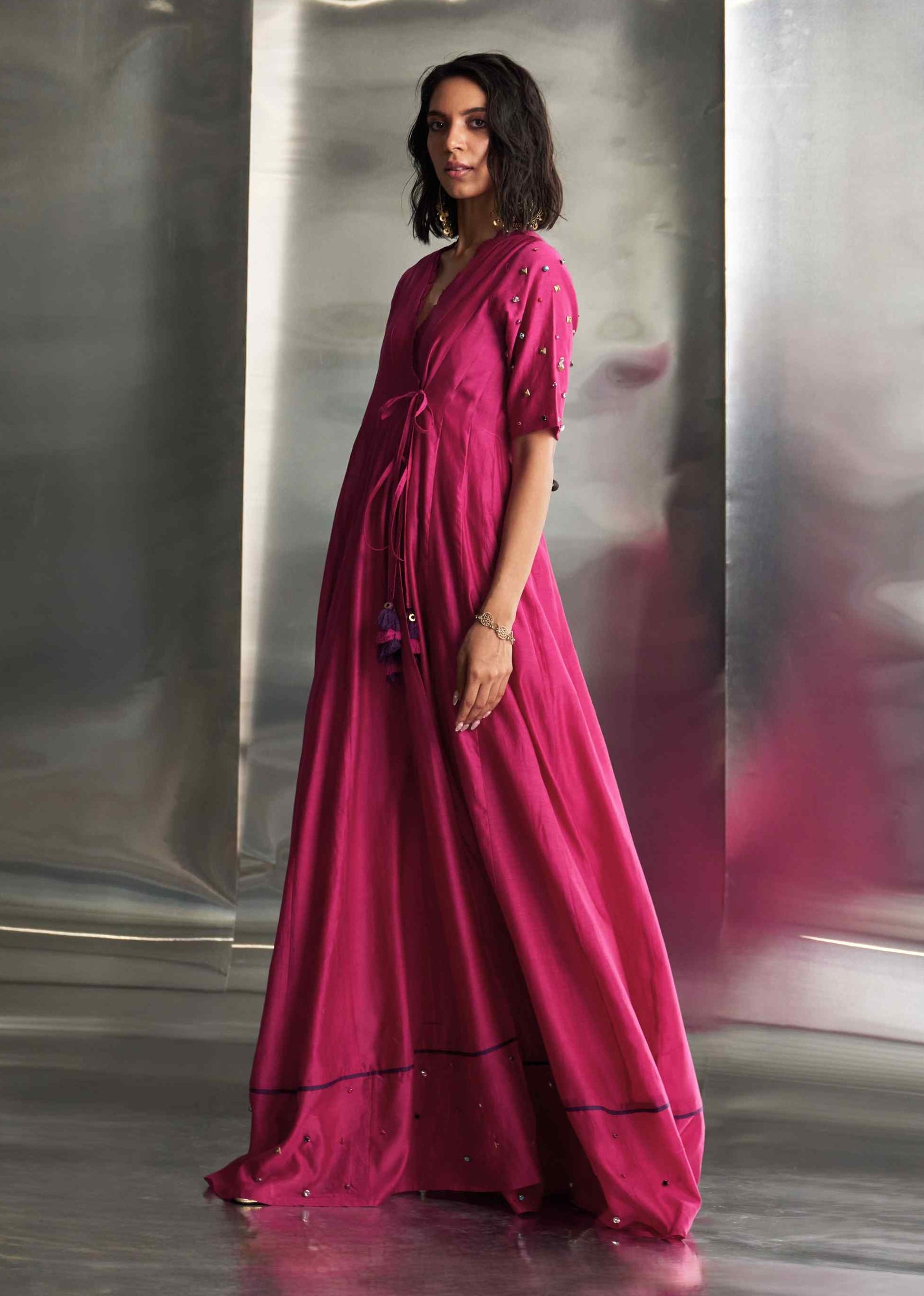 Brighten your wardrobe with this pop pink angrakha wrap-around anarkali. Adorned with gem and stud embellishments, pleated detailing, and handcrafted tassels, it’s a unique fusion of tradition and modern style. Paired with chic jogger pants and a beautifully embroidered dupatta with crochet lace, this set combines charm and elegance. The joggers feature an elasticated waistband with a drawstring for a comfortable fit.