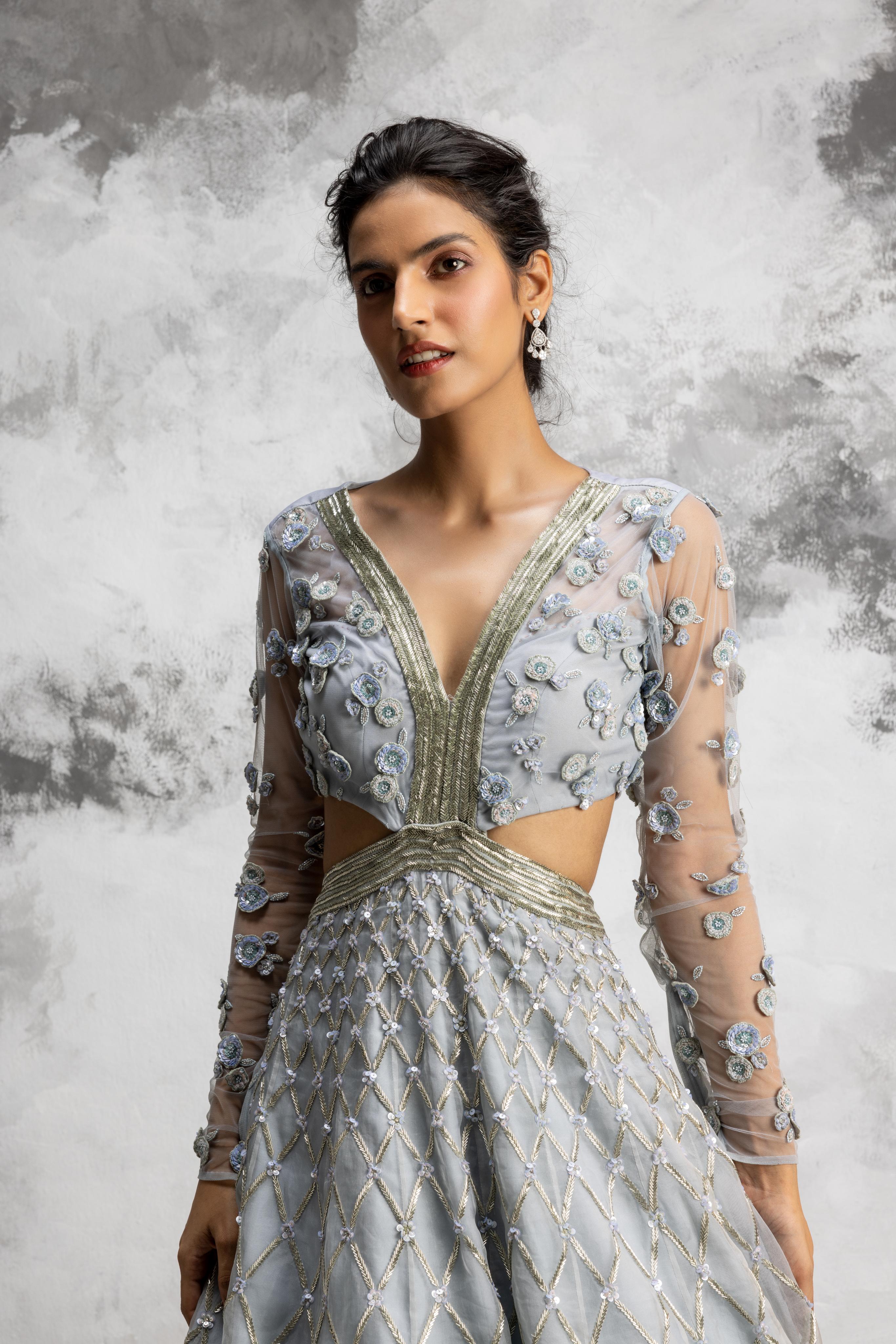 This exquisite ensemble features a powder blue 3D flower cut-out blouse, offering a contemporary twist on traditional design. The blouse is paired with a diamond pattern embroidered lehenga, adding depth and elegance. The lehenga is finished with gathered frill edging, creating a flowing, dramatic effect. Perfect for weddings or special occasions, this outfit seamlessly blends modern artistry with timeless beauty.