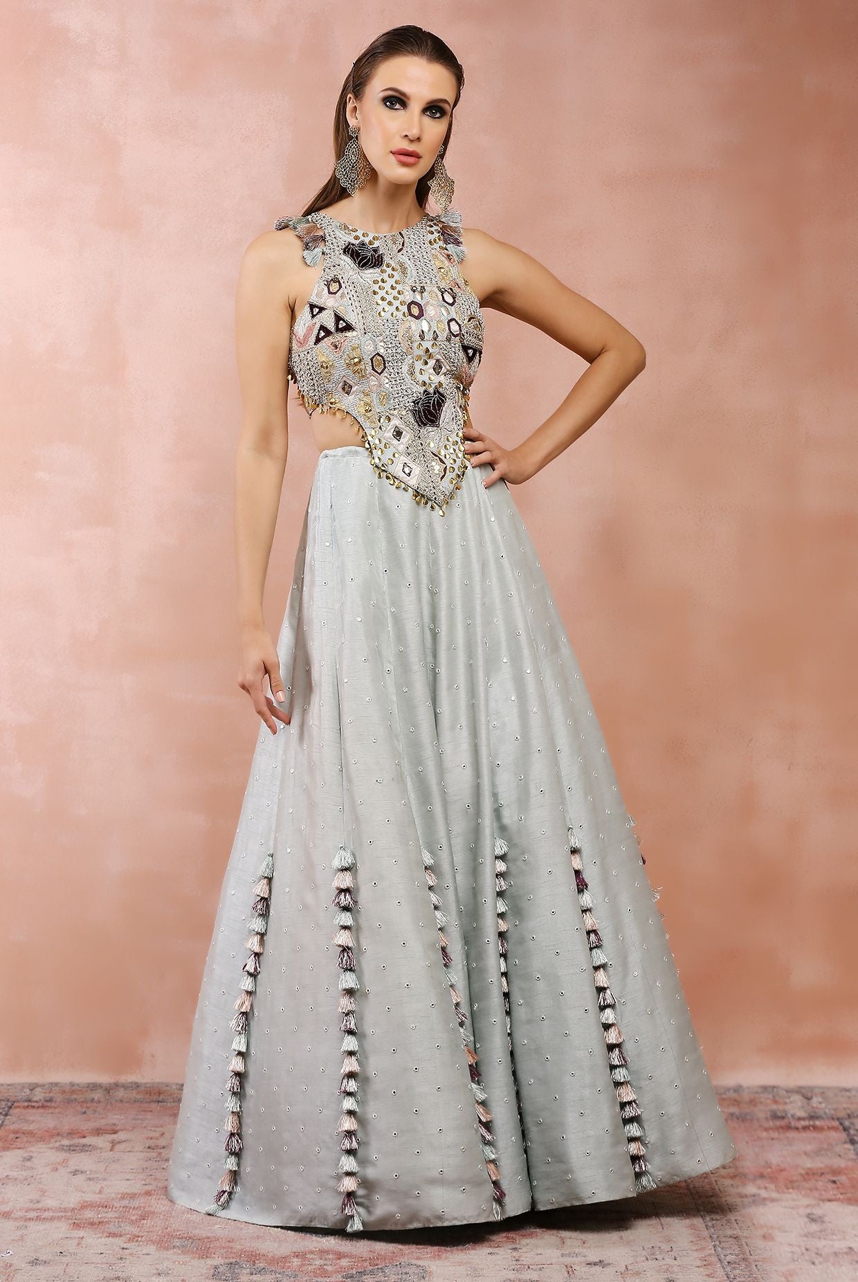 Embrace the elegance of timeless craftsmanship with our Powder Blue Georgette Choli, adorned with intricate appliqué embroidery. This delicate choli is paired beautifully with a flowing Abla Silk Lehenga, offering a perfect blend of grace and sophistication. The powder blue hue exudes a serene charm, while the rich texture of the abla silk adds a touch of opulence. Ideal for any special occasion, this ensemble promises to make you stand out with its refined, luxurious appeal.