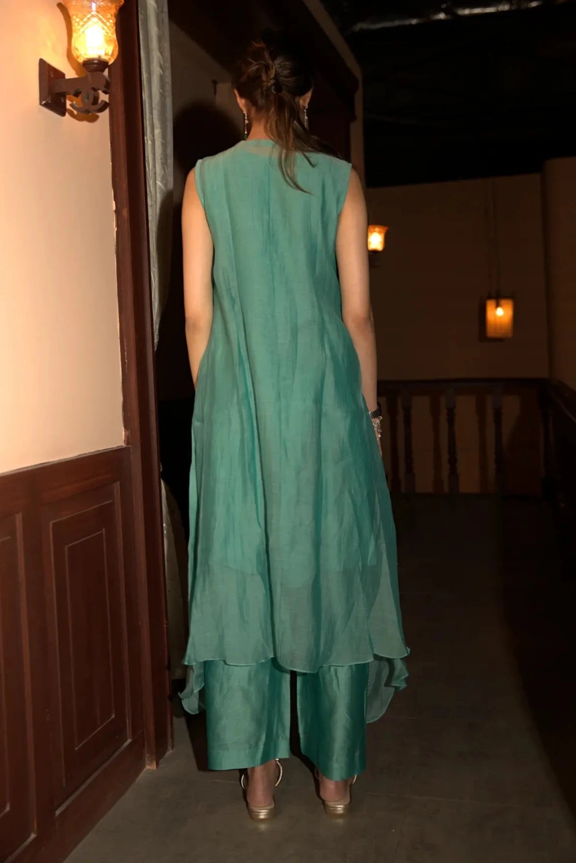 This elegant powder blue asymmetric dress showcases intricate hand-embroidered dotted mandala and mixed booti designs, offering a beautiful blend of traditional artistry and modern design. The unique asymmetric cut adds a contemporary flair, while the delicate embroidery brings timeless charm. Paired with broad hem pants for a structured yet graceful look, this ensemble effortlessly combines comfort and style. Perfect for festive or semi-formal occasions, it exudes sophistication with a modern twist.