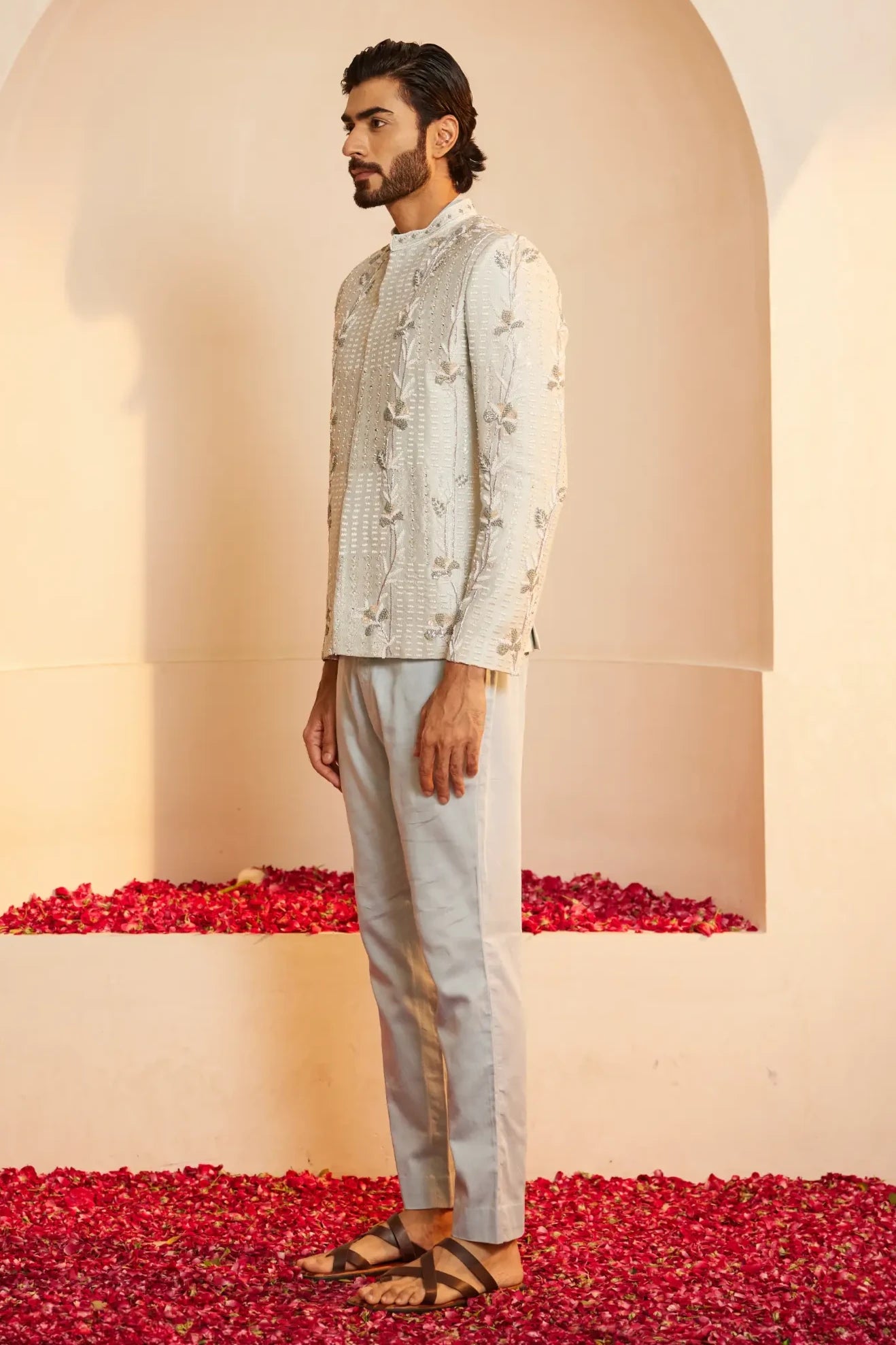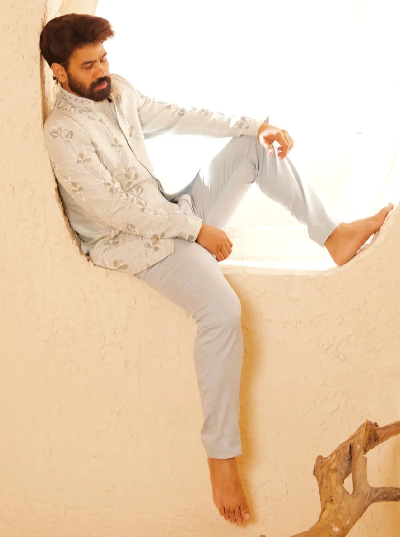 The "Ikshan" Bandhgala in powder blue dupion silk with front opening showcases exquisite thread work, dabka detailing, and delicate pearl and sequin embroidery. This refined jacket combines traditional artistry with a modern silhouette, perfect for making a sophisticated statement on special occasions.