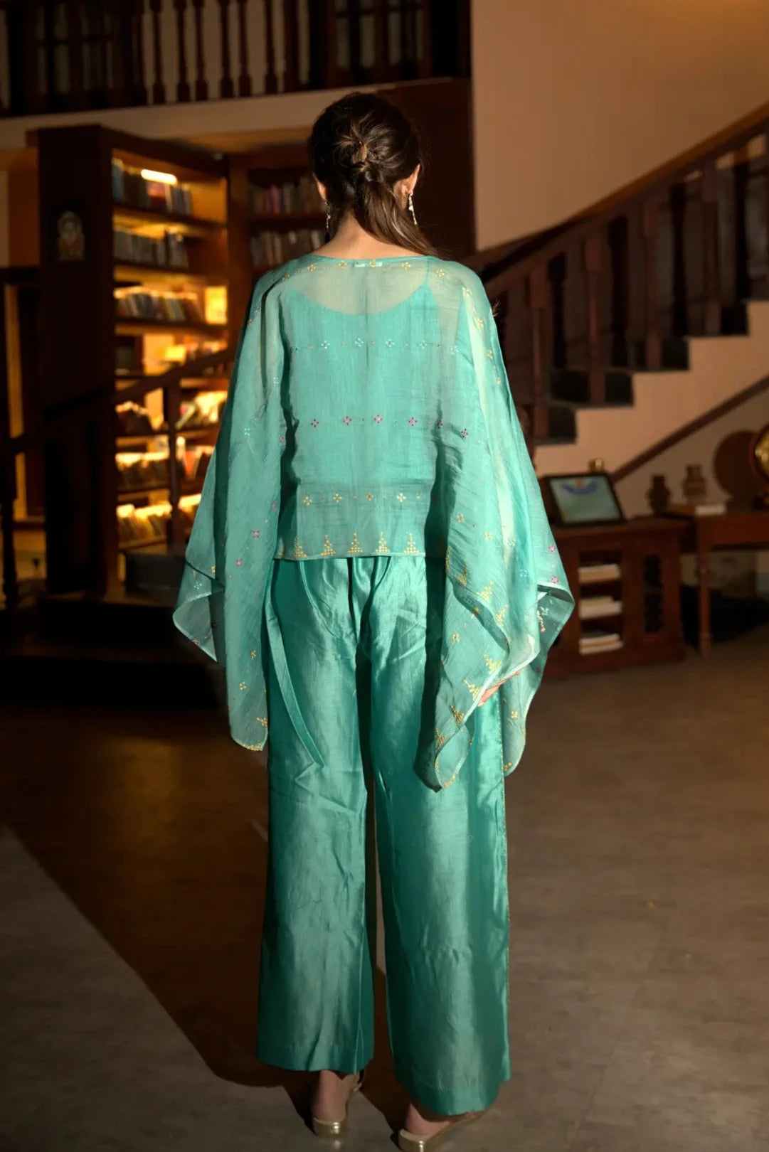 This powder blue cape is adorned with exquisite hand-embroidered multi-color resham and aari dotted lines, adding a vibrant yet elegant touch to its flowing silhouette. The intricate embroidery showcases fine craftsmanship, making the cape a standout piece. Paired with broad hem pants featuring subtle running stitch detailing along the sides, this ensemble beautifully combines traditional artistry with contemporary style. Perfect for festive or semi-formal occasions, it offers a chic and sophisticated look with a modern edge.