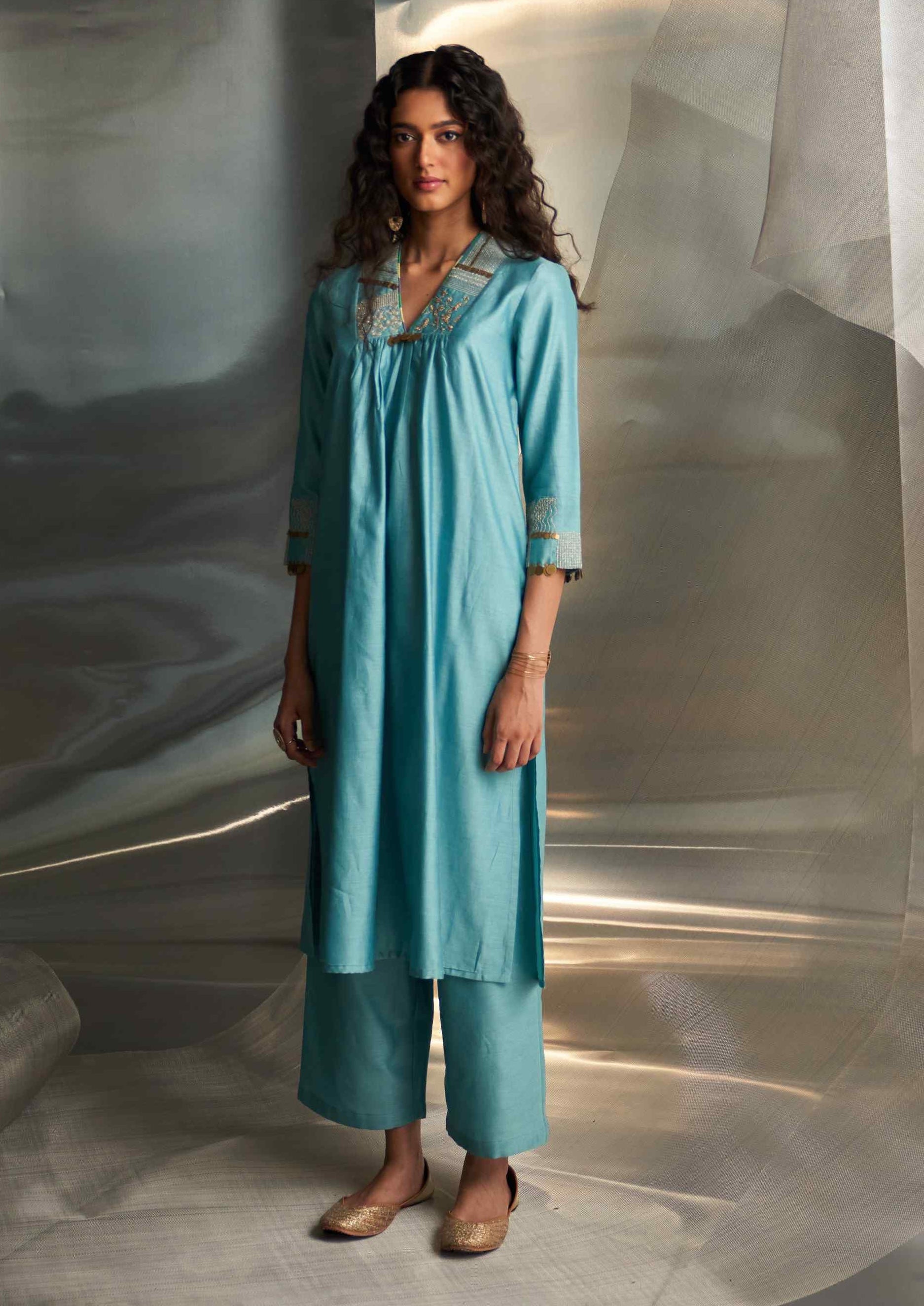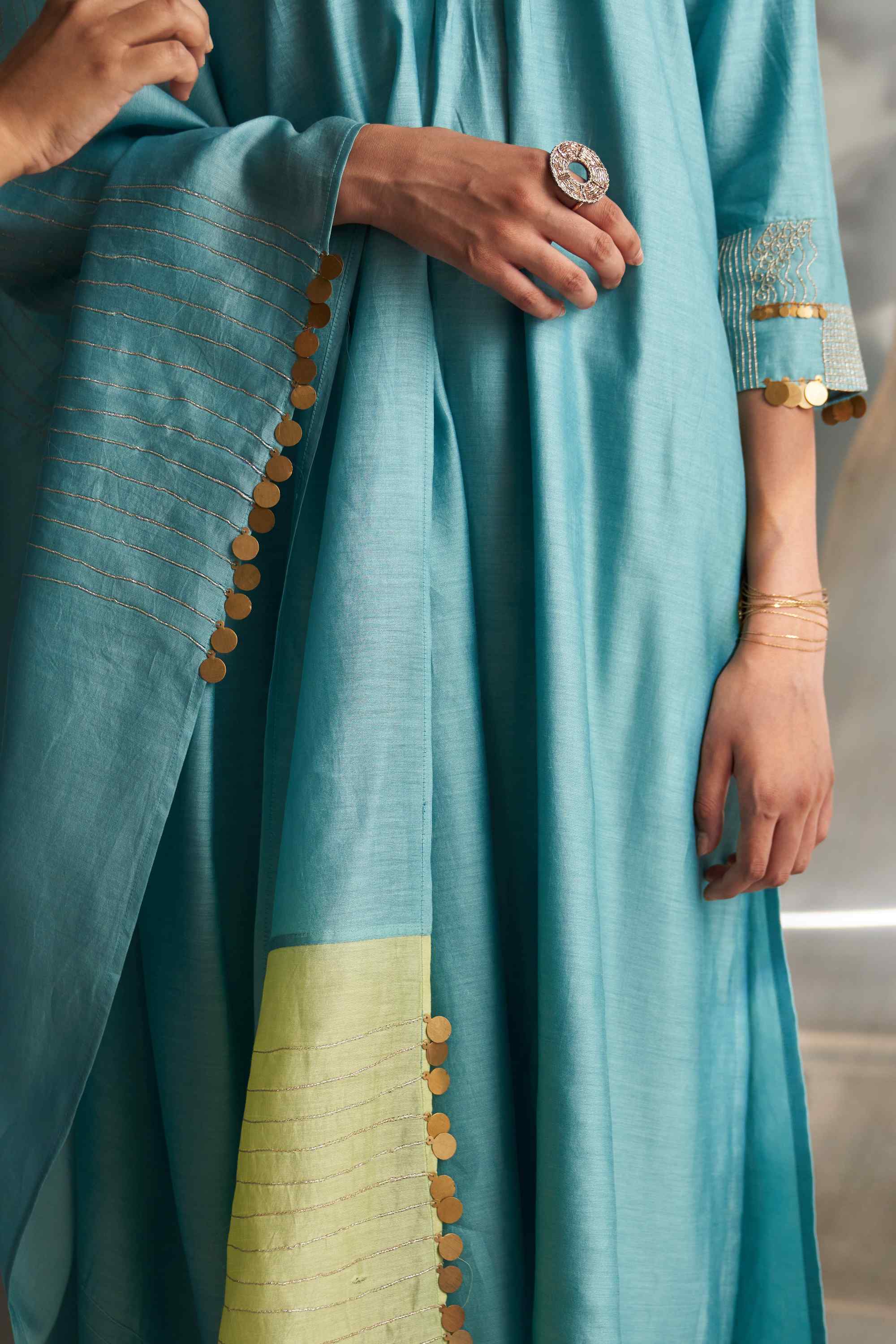 Embrace the grandeur of Cleopatra's era with this luxurious powder blue deep V-neck kurta set. Featuring intricate embroidery and vibrant patterns, the kurta exudes sophistication and elegance. The set includes a dupatta with contrasting color panels and gold-polished hangings, adding a regal touch. Completed with elasticated bottoms and a drawstring for comfort, this ensemble is perfect for making a timeless, royal statement at any special occasion.