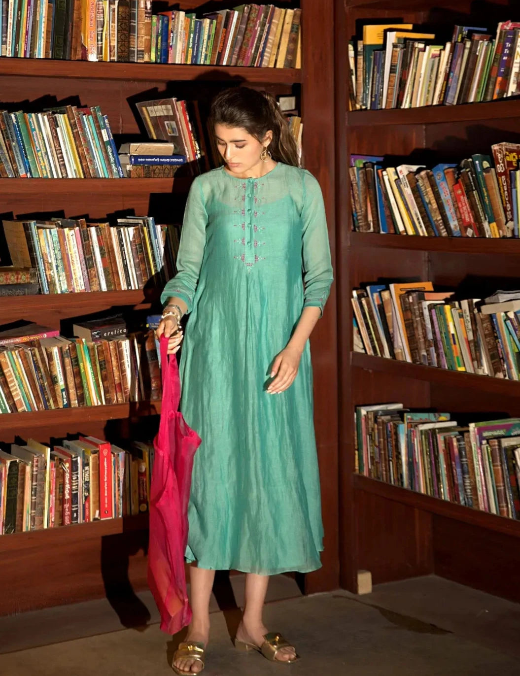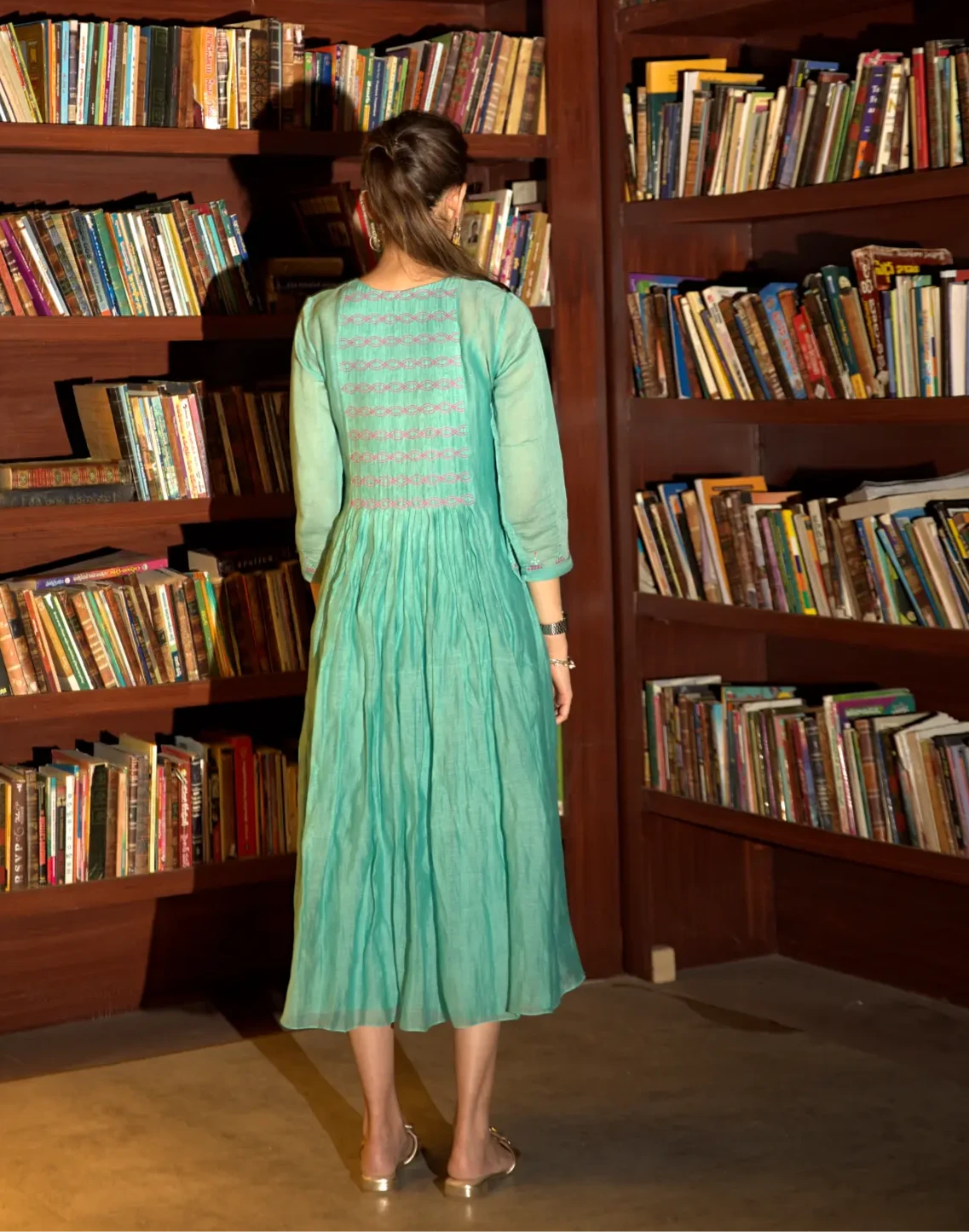 This elegant powder blue A-line dress features a refined dotted line embroidery along the front neckline, adding a subtle touch of sophistication. The back showcases delicate pintucked detailing, offering a beautiful textural element to the simple yet chic silhouette. Designed for comfort and grace, this A-line dress flows effortlessly, making it a versatile choice for both casual outings and special occasions. Its understated elegance makes it a timeless addition to any wardrobe.