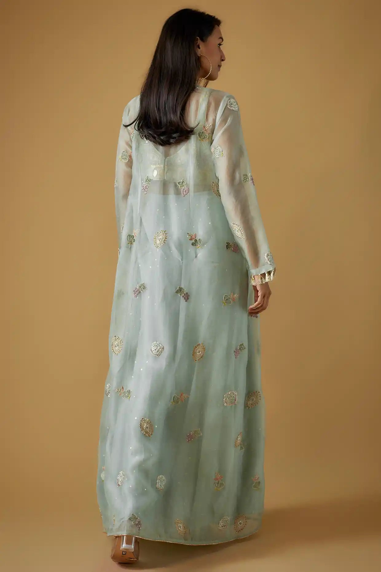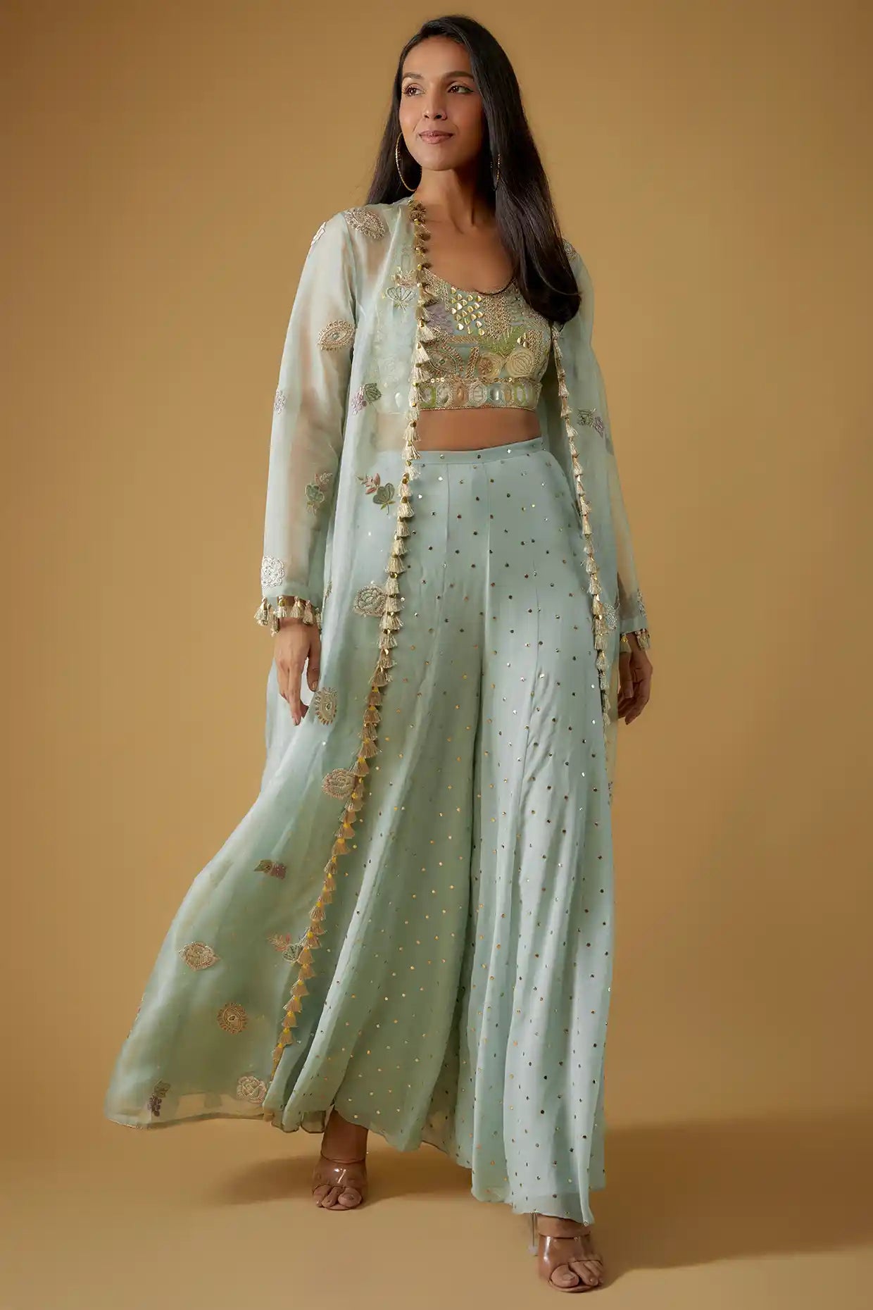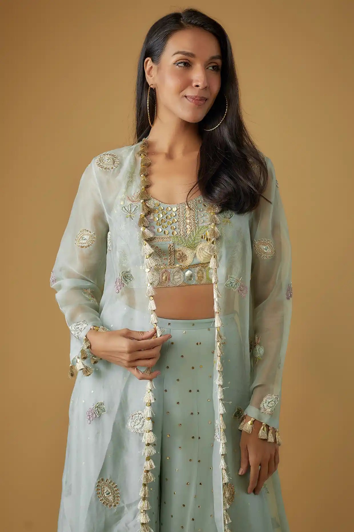 Elevate your style with this exquisite powder blue georgette embroidered bustier, paired with a beautifully crafted organza embroidered jacket and a luxurious mukaish georgette sharara. The bustier features delicate embroidery that adds sophistication, while the organza jacket enhances the overall elegance with its intricate details. The sharara flows gracefully, providing a chic and comfortable fit. Perfect for special occasions and festive celebrations, this ensemble effortlessly blends modernity with traditional charm, ensuring you stand out with confidence and grace.