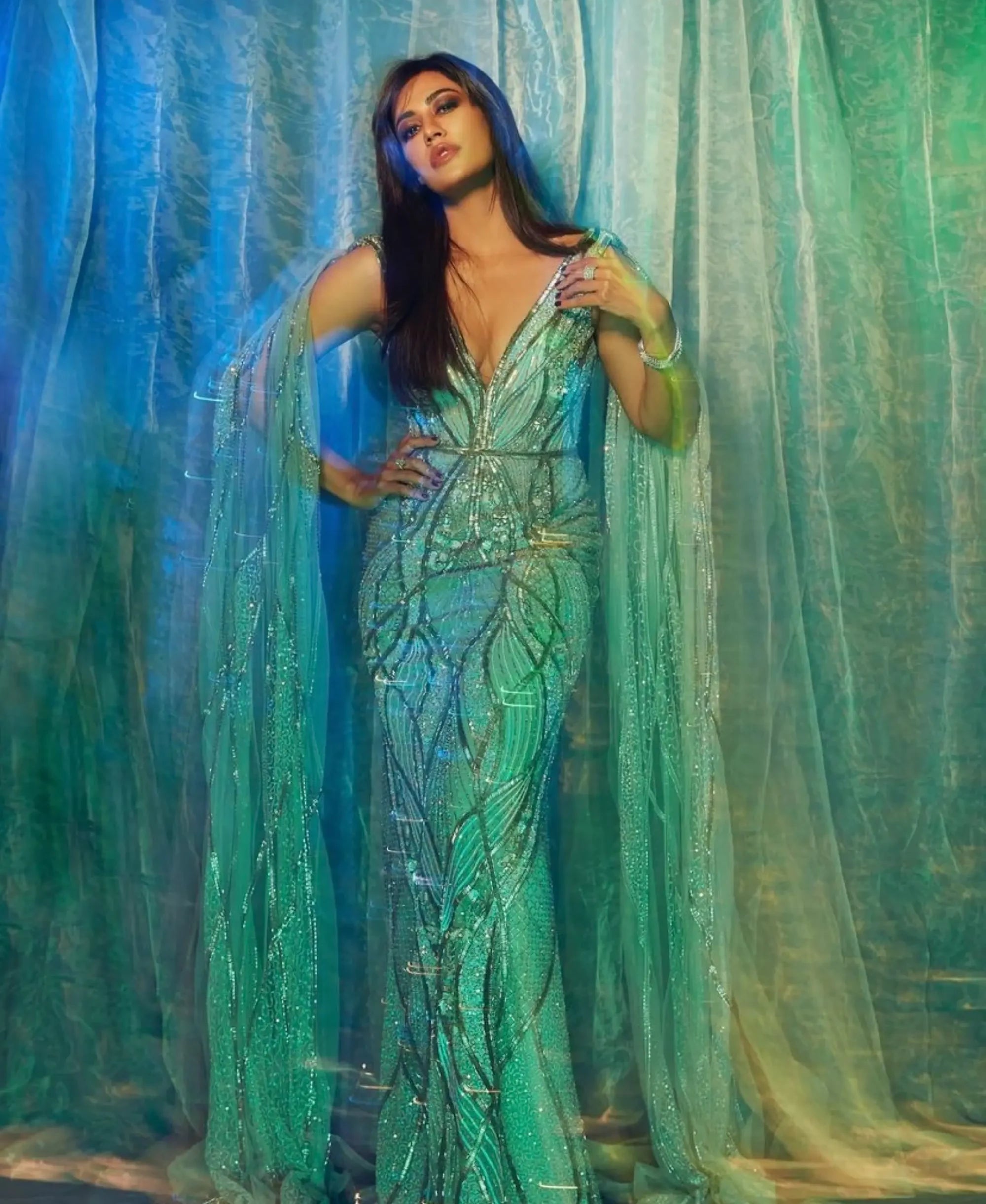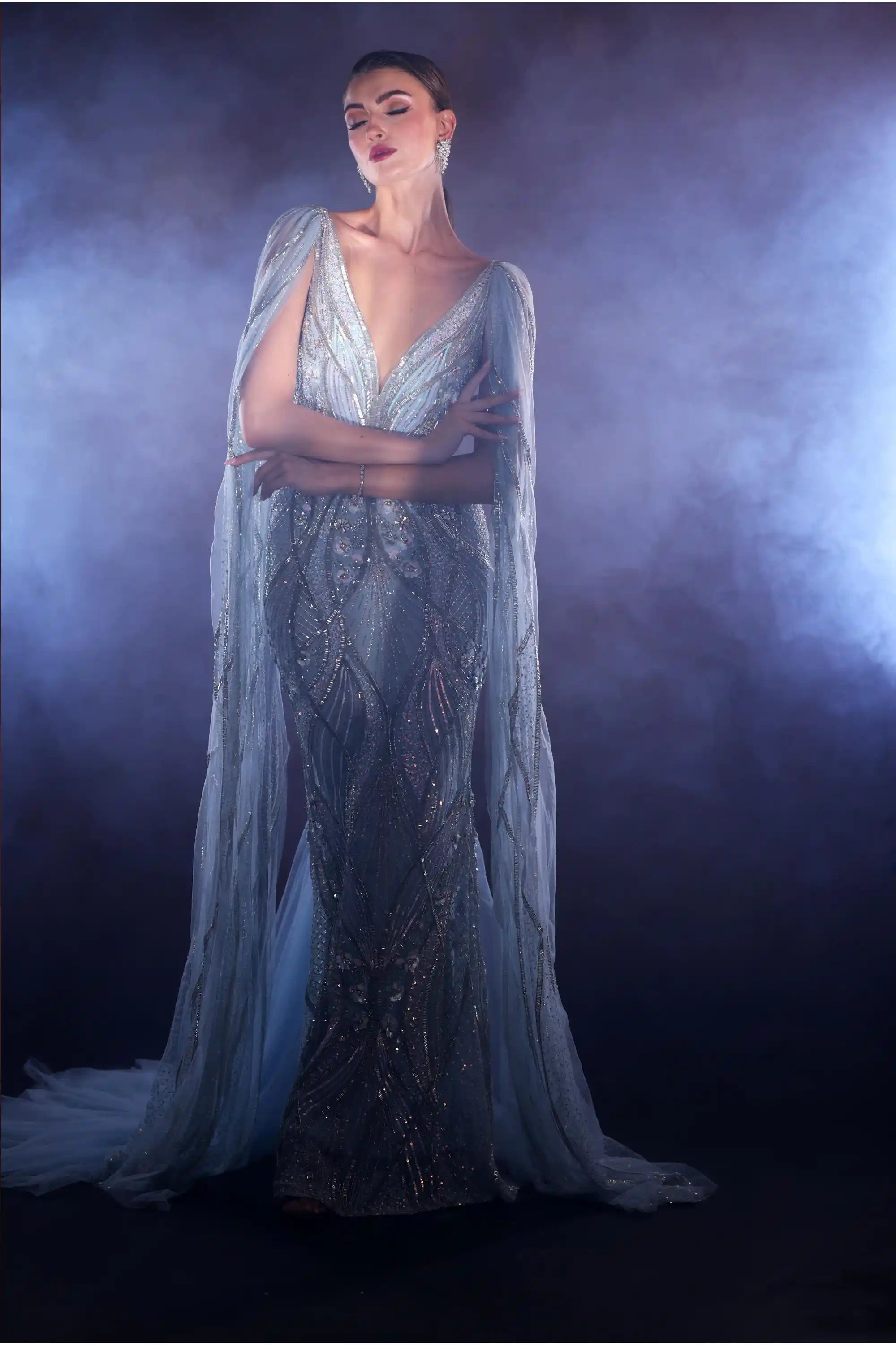Shine bright like a diamond in our stunning Bhawna Rao gown, crafted in a dreamy powder blue hue. This exquisite gown features detachable wings, beautifully embroidered with the finest beads, crystals, and 3D petals in a mesmerizing geometric pattern. The design not only enhances your elegance but also creates a slimmer, celestial silhouette. Perfect for special occasions, this gown ensures you make a captivating statement and exude glamour wherever you go.