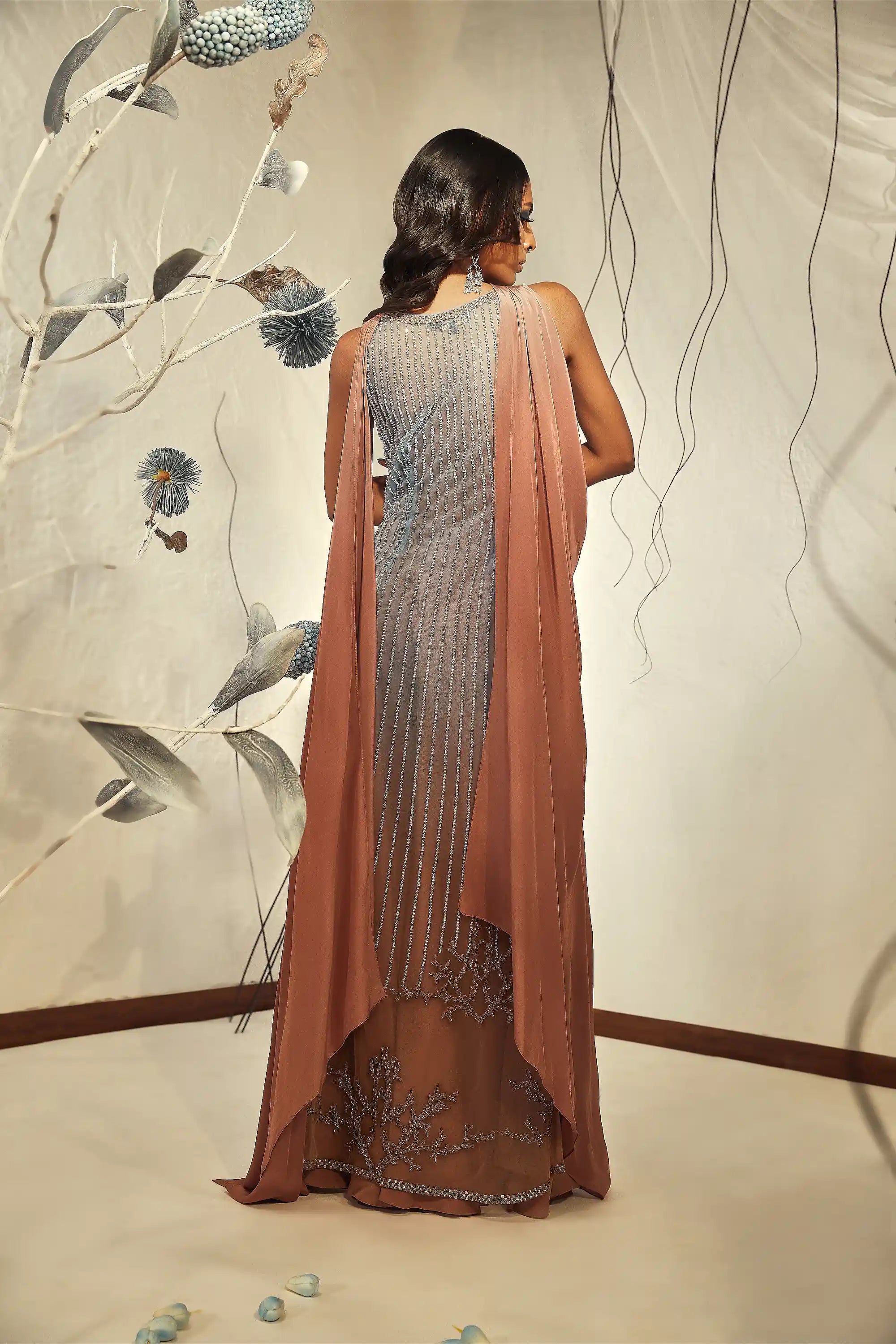 Embrace a dreamy aesthetic with this powder blue ombre long jacket in tulle, featuring a plunging neckline that exudes elegance. Adorned with shimmering sequins, sparkling crystals, and delicate thread work, this jacket adds a touch of glamour to any outfit. Paired with flared silk crepe pants for a graceful silhouette, the ensemble is beautifully completed with a prominent coffee dupatta that adds a striking contrast. Perfect for upscale events, this look combines sophistication with a hint of modern flair.