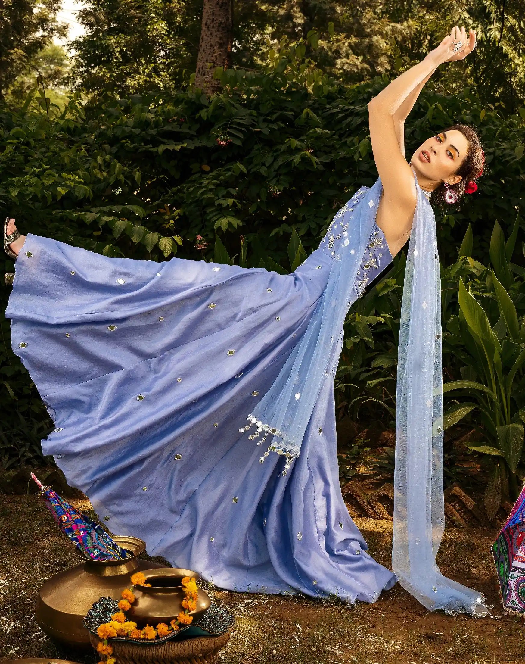 This halter neck chanderi mirror work anarkali and dupatta set is designed for the modern woman who loves tradition with a twist. The intricate mirror work and flattering silhouette make it perfect for special occasions, ensuring you make a stylish statement wherever you go.