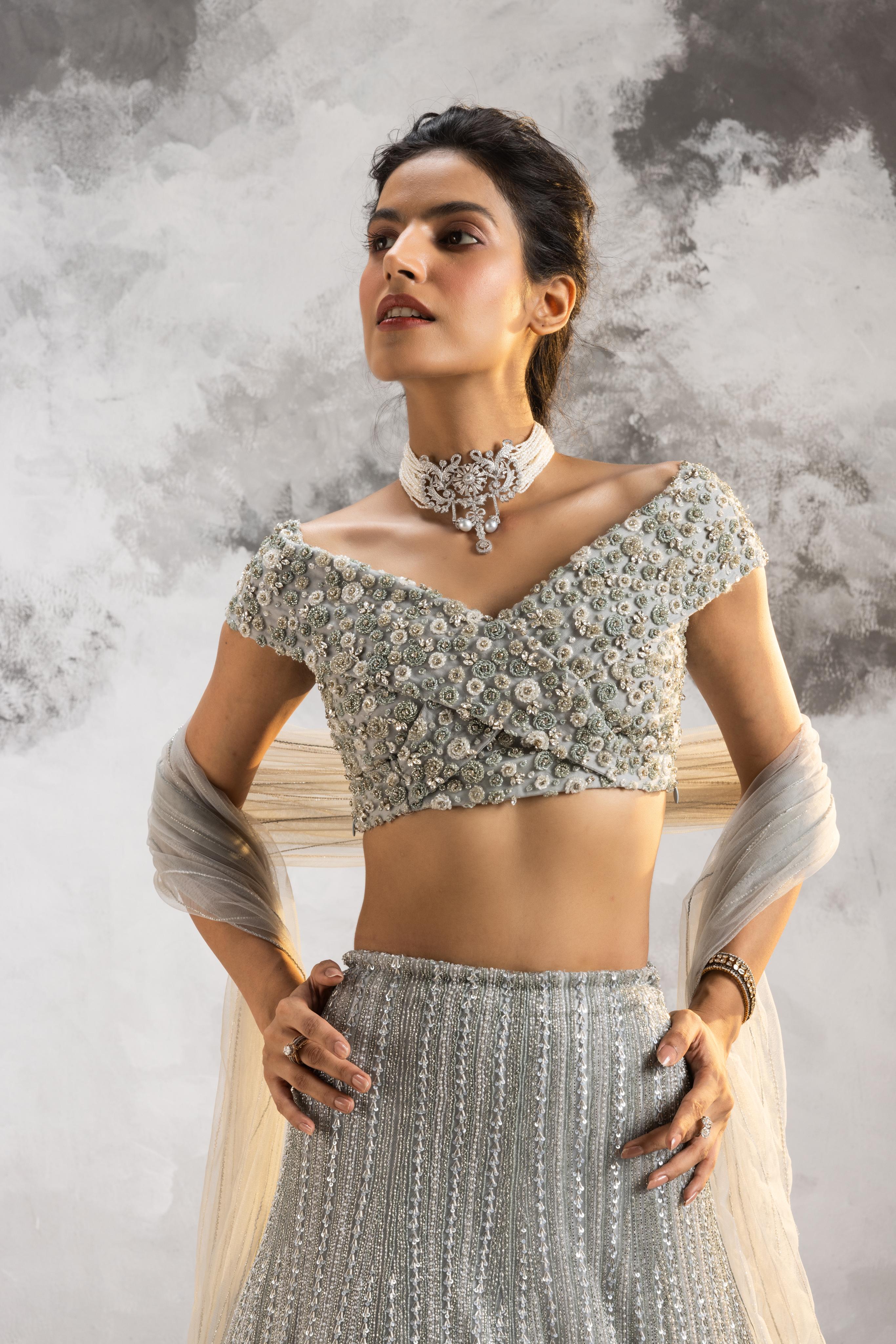 This exquisite off-shoulder blouse features overlapping rosette embroidery, creating a bold yet elegant look. Paired with a heavily embroidered, shimmery lehenga, it offers an opulent and dramatic flair. The ensemble is completed with a feather-detailed dupatta, adding a luxurious finishing touch. Ideal for weddings or grand celebrations, this outfit blends intricate craftsmanship with modern glamour for a show-stopping appearance.