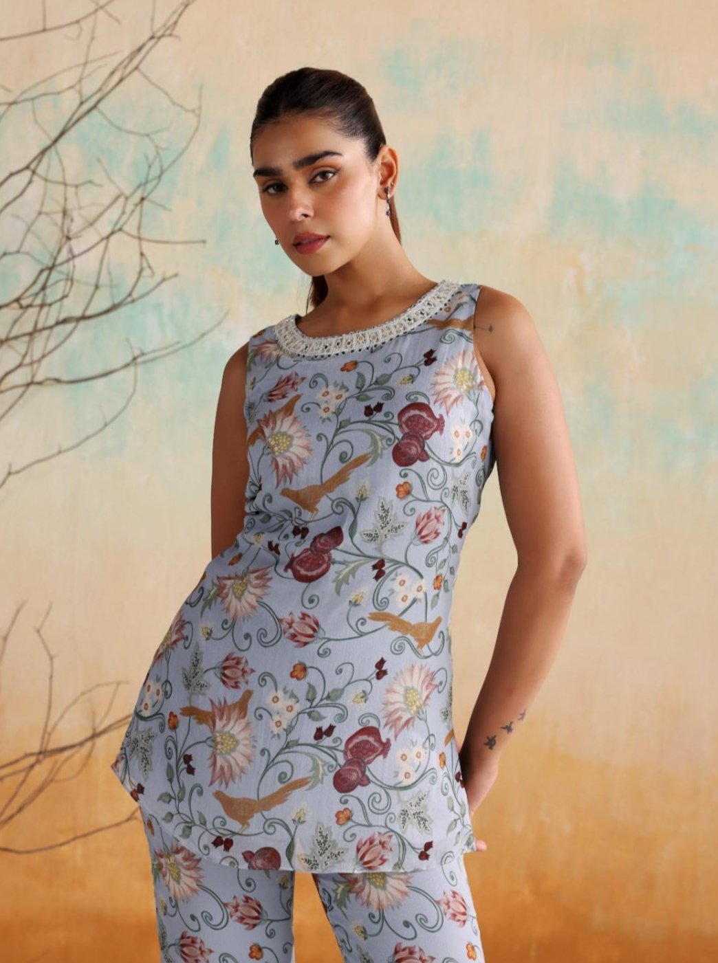 Enhance your wardrobe with our printed kurta, featuring an exquisitely embellished neckline that adds a touch of elegance and sophistication. Paired with matching printed flared pants, which are adorned with intricate handwork on the hemline, this ensemble offers a harmonious blend of style and craftsmanship. The kurta's graceful design combined with the chic, detailed pants creates a look that is perfect for both casual and formal occasions. Ideal for making a statement, this outfit seamlessly merges contemporary flair with traditional charm.