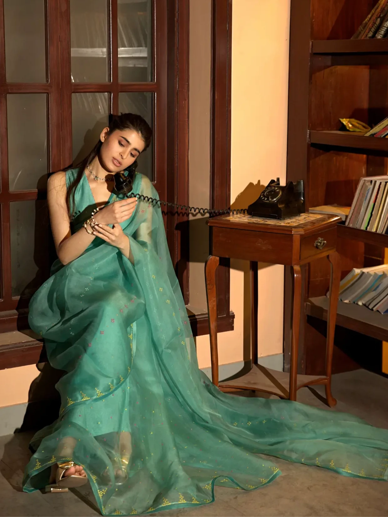This exquisite powder blue organza saree features stunning multi-color dot stripes embroidered in luxurious zari and resham, creating a vibrant and eye-catching design. The lightweight organza fabric adds a graceful drape, making it perfect for any special occasion. Complementing the saree is a solid blouse adorned with intricate pink thread knot detailing, adding a touch of modern flair to the traditional ensemble. This outfit beautifully merges elegance and contemporary style, making it a must-have for festive celebrations.