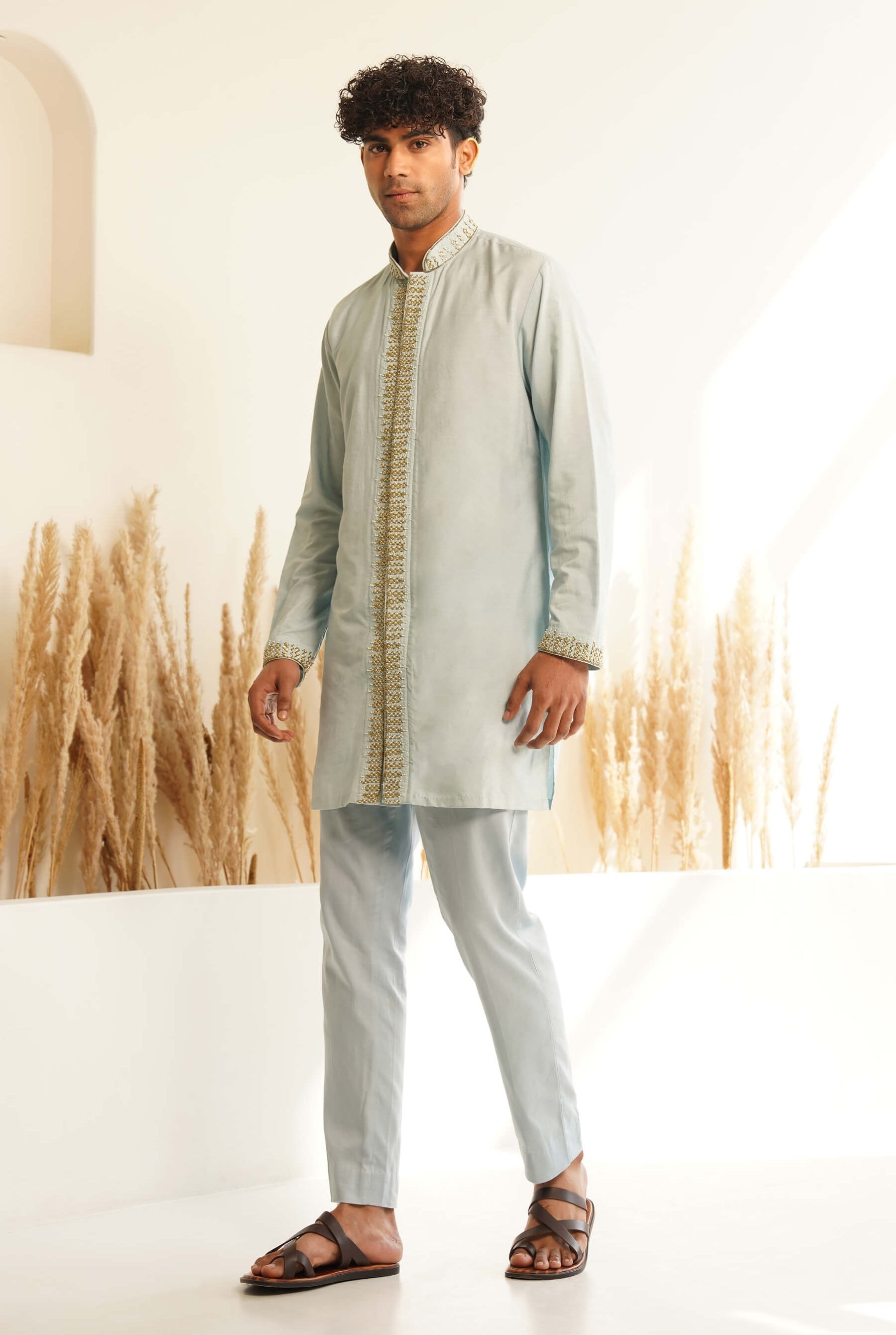 Introducing our refined powder blue open Indo-jacket, featuring a classic mandarin collar and exquisite hand embroidery throughout. This elegant piece combines a soft, serene color with intricate detailing, offering a sophisticated touch to your wardrobe. Perfect for adding a graceful and stylish flair to any special occasion or formal event, this Indo-jacket seamlessly blends traditional charm with modern elegance.