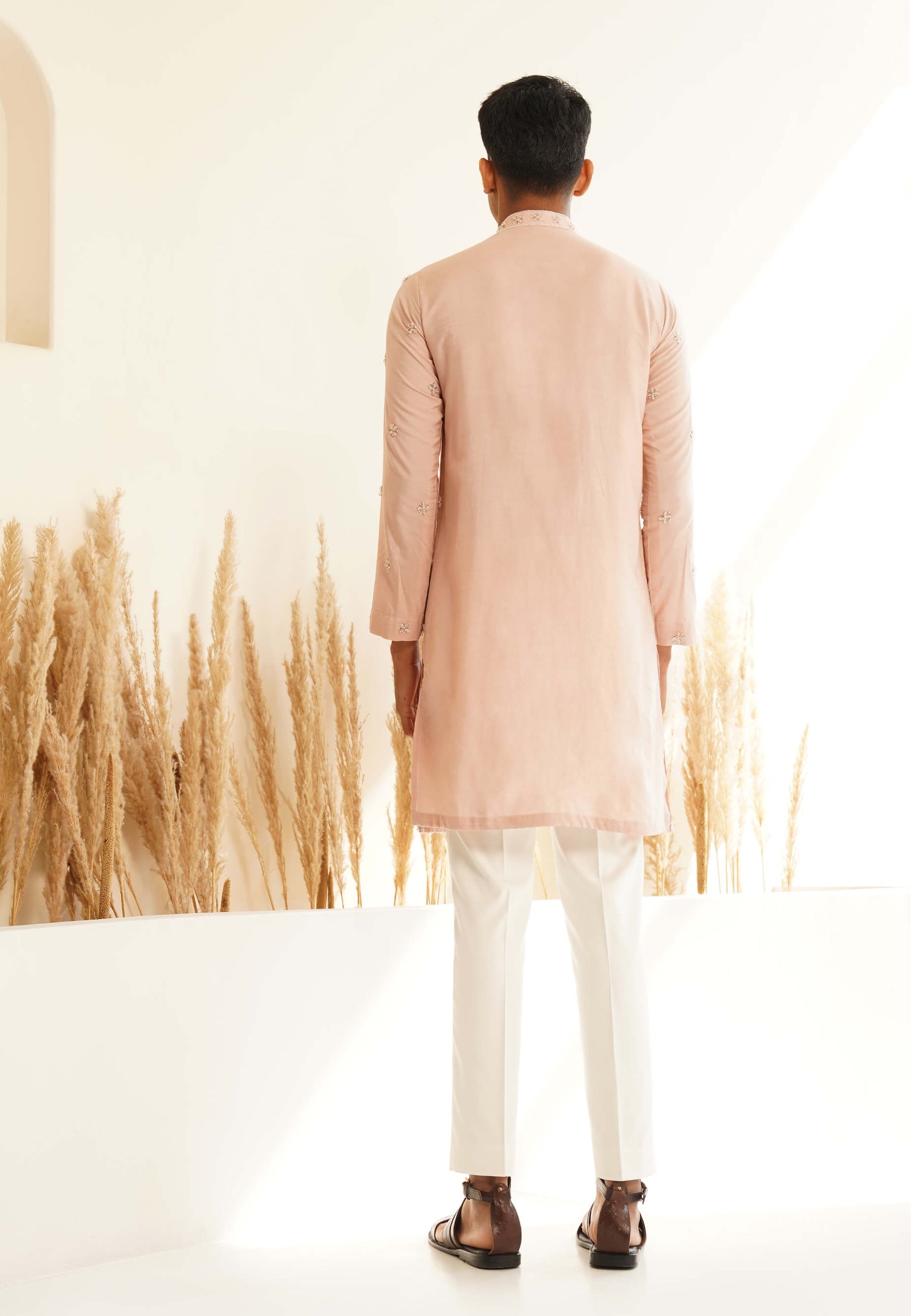 Elevate your wardrobe with our powder pink button-down kurta, featuring a refined mandarin collar and a discreet hidden placket for a sleek finish. This elegant garment is adorned with delicate hand embroidery throughout, highlighting meticulous craftsmanship and timeless beauty. Perfect for both formal events and special occasions, this kurta offers a seamless blend of classic charm and modern sophistication. Add a touch of grace to your collection with this intricately designed and versatile piece.