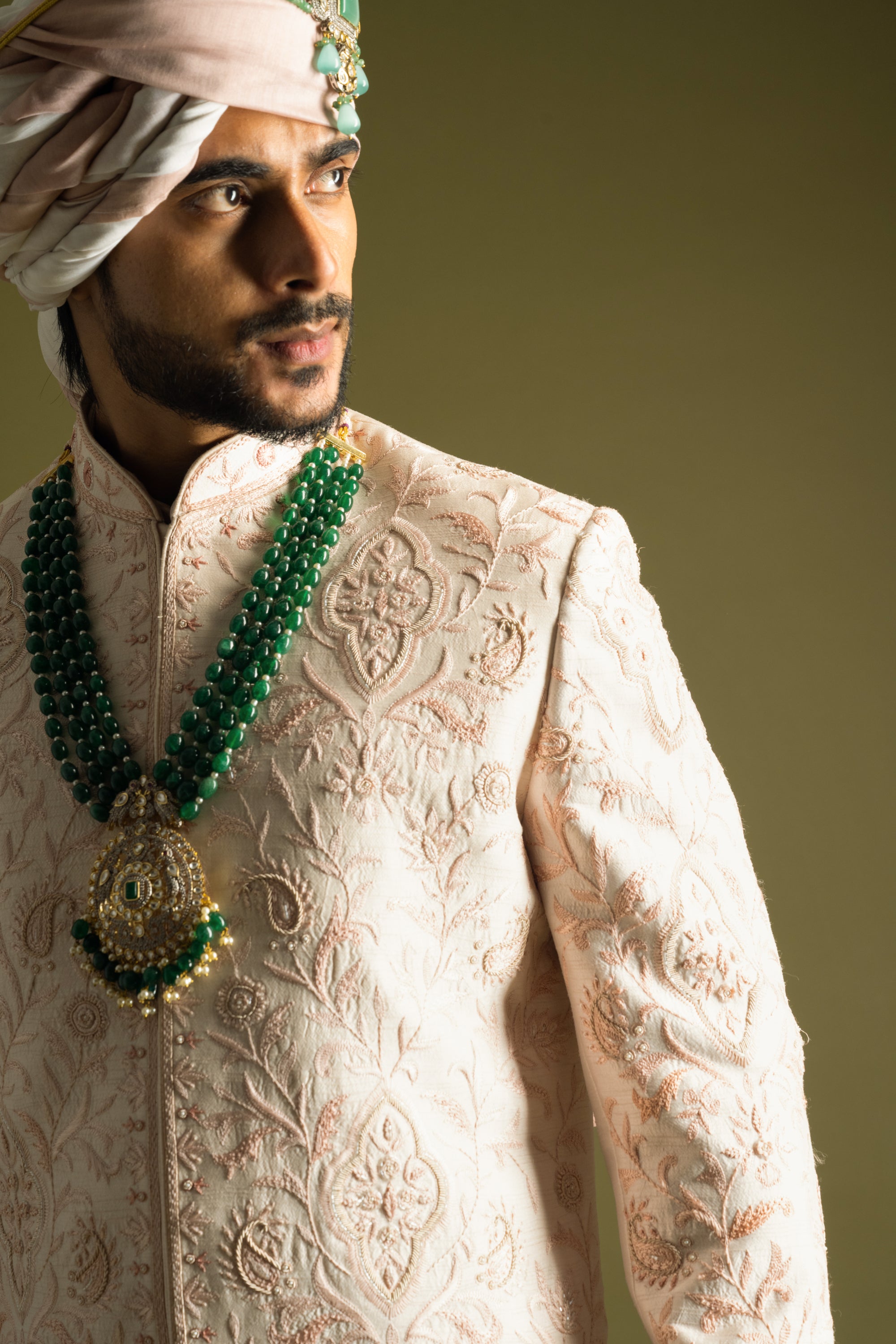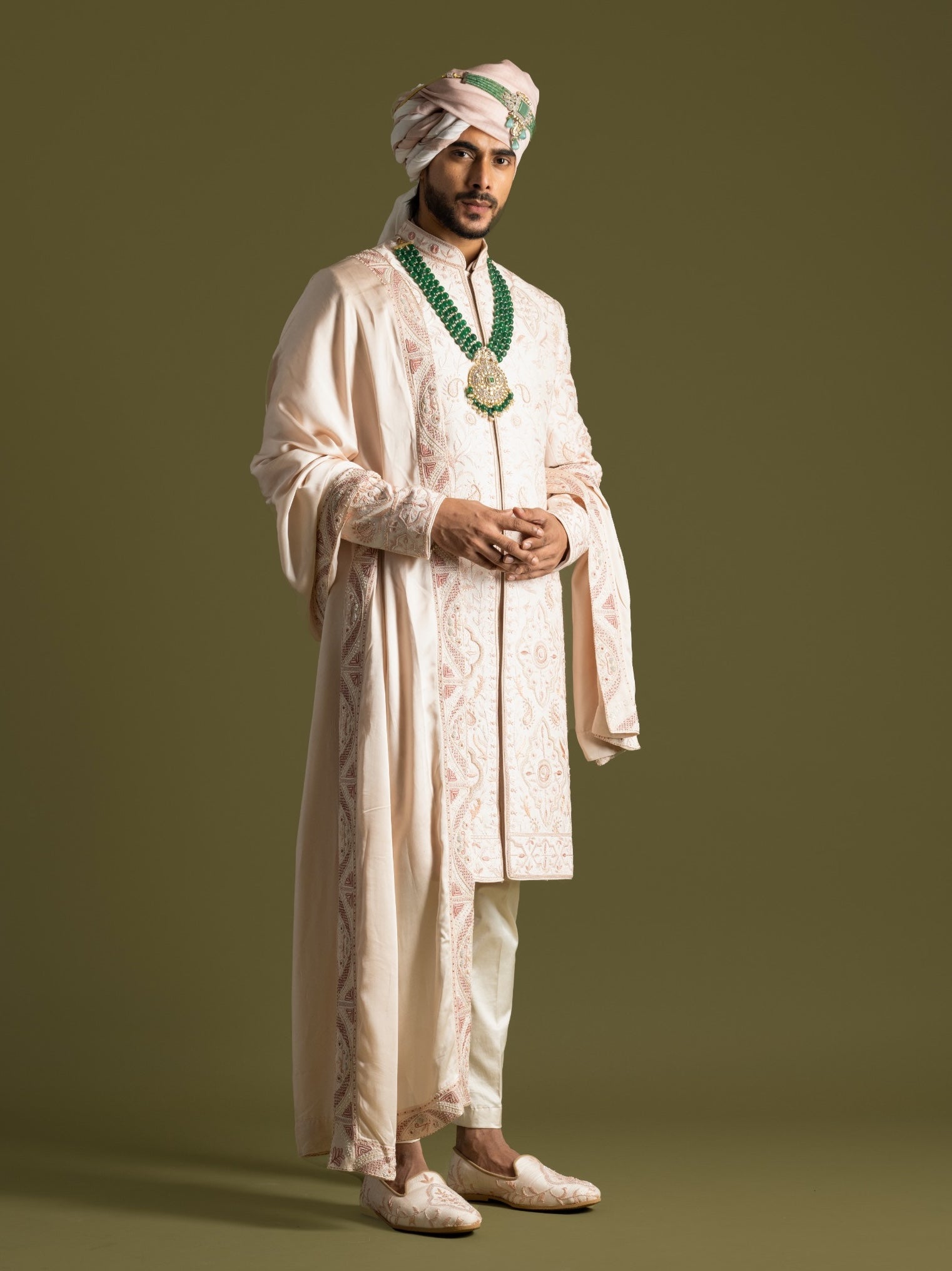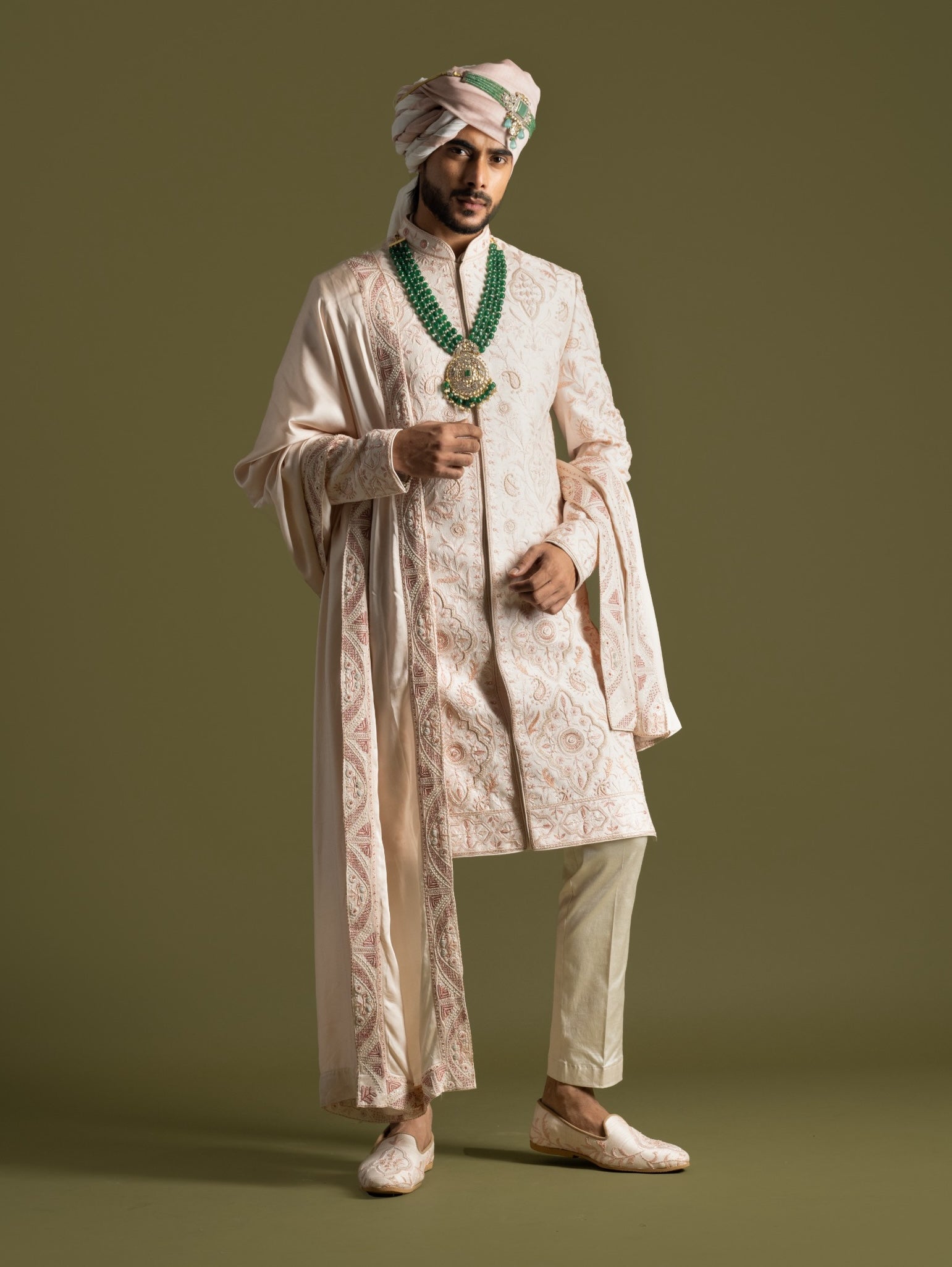 Step into elegance with our powder pink sherwani set, featuring intricate threadwork and maalwork in rose gold and multiple shades of pink. This sophisticated sherwani is beautifully complemented by a modal satin dupatta with a highlighted border, along with a straight kurta and matching pants. Perfect for high-profile events and special occasions, this ensemble combines luxurious fabric with meticulous detailing for a timeless and refined look.