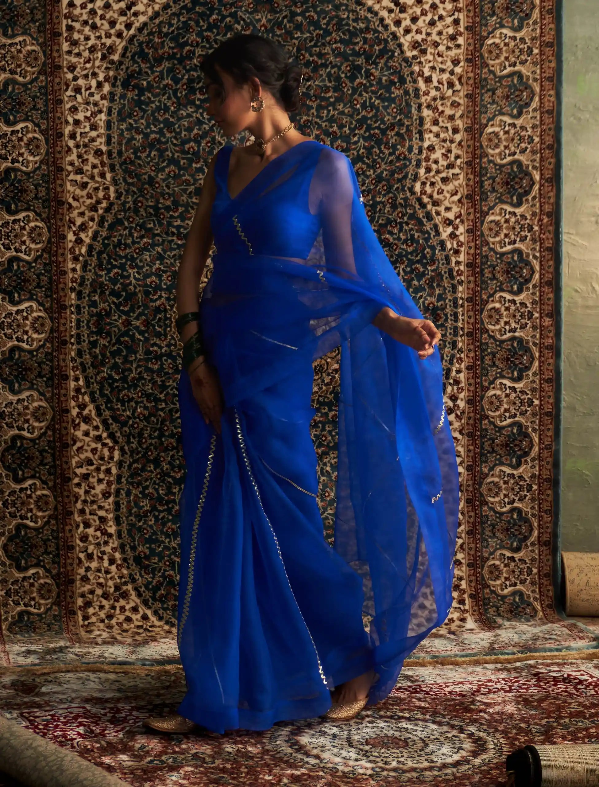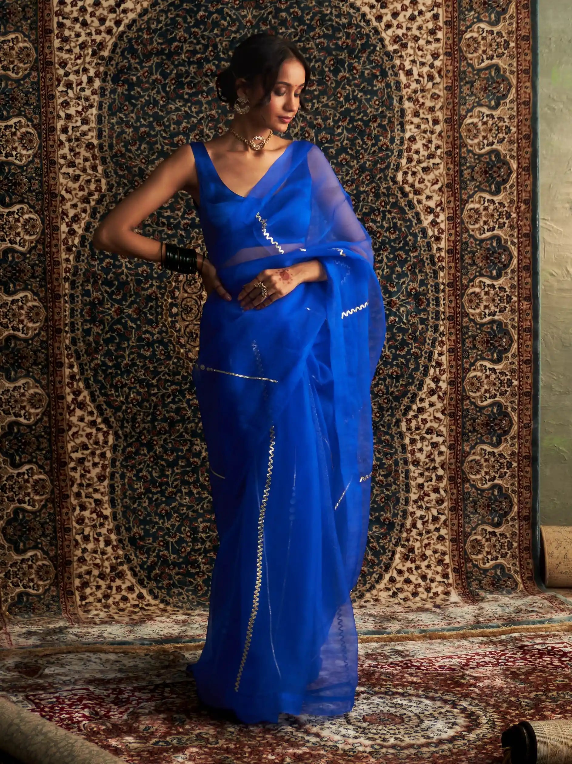 The blue organza saree is the perfect choice for Diwali, showcasing intricate embroidery that adds both texture and elegance. Paired with a matching blouse, this ensemble creates a seamless and sophisticated look.