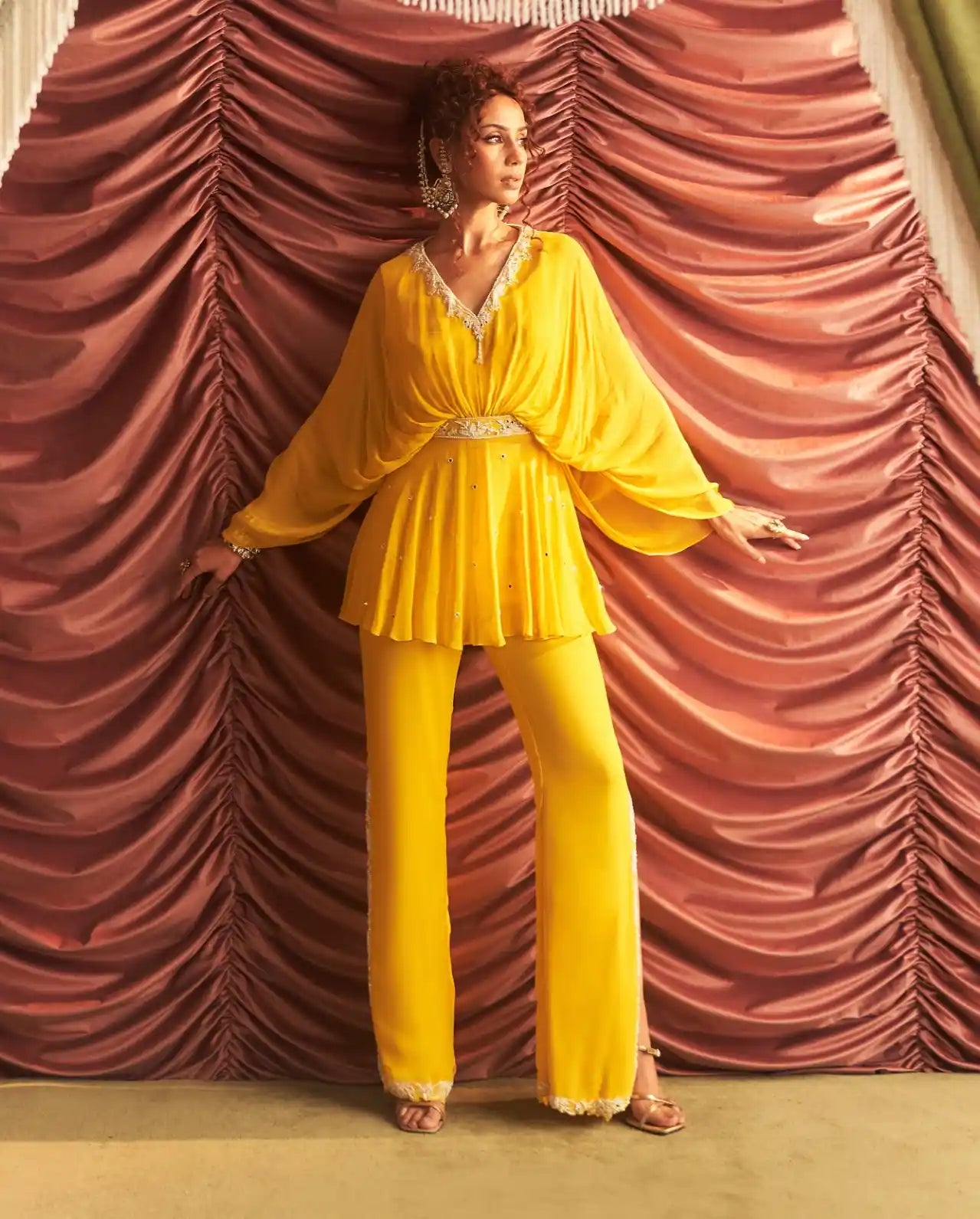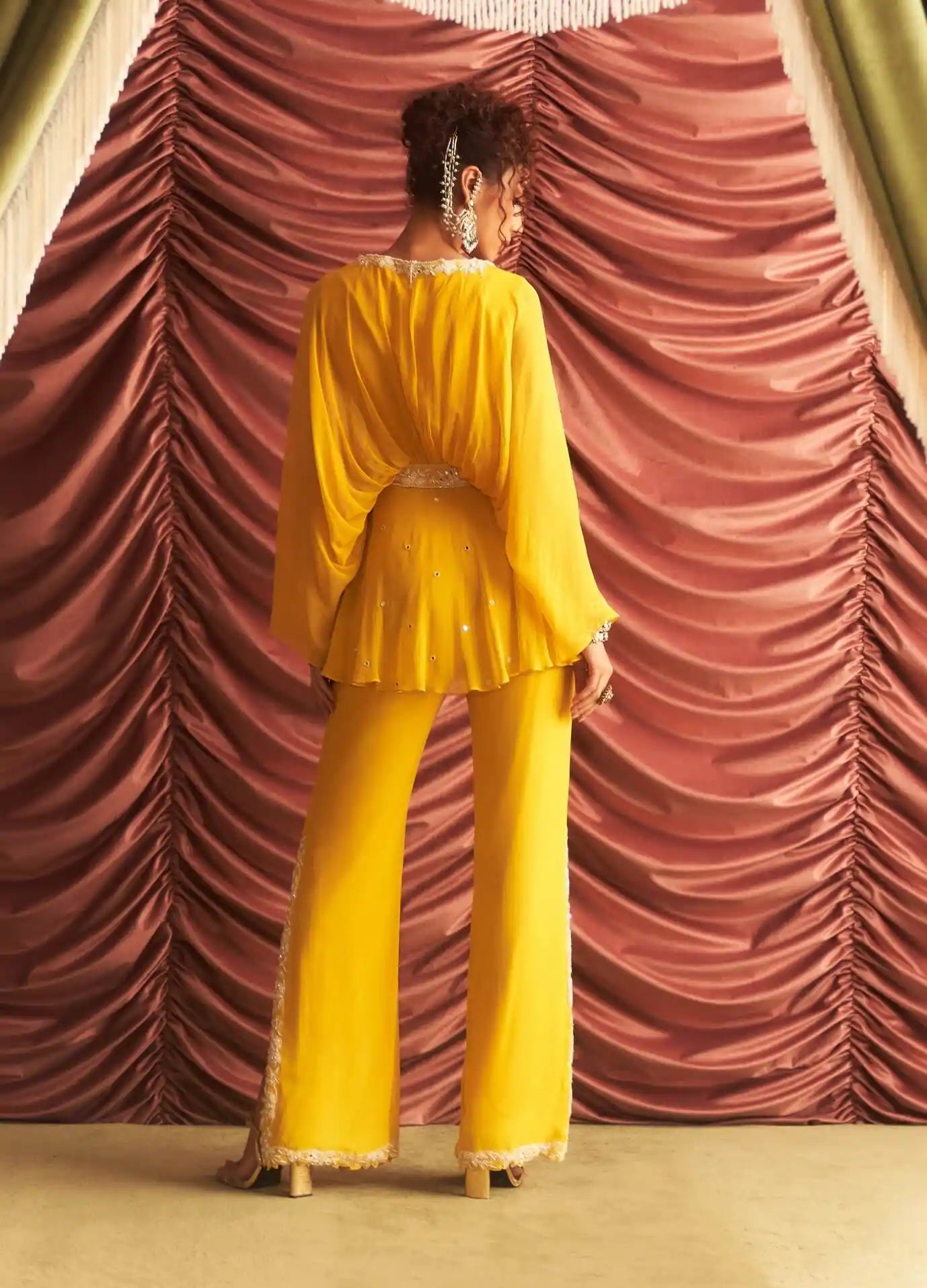 Elevate your style with our yellow embellished peplum top paired with chic pants. The peplum top features intricate embellishments that add a touch of sophistication and glamour, beautifully accentuating your waist. The tailored pants provide a sleek and modern silhouette, ensuring both comfort and elegance. Perfect for festive occasions, parties, or special gatherings, this ensemble seamlessly blends contemporary fashion with classic charm. Step out with confidence and make a statement in this stunning outfit that’s designed to turn heads!