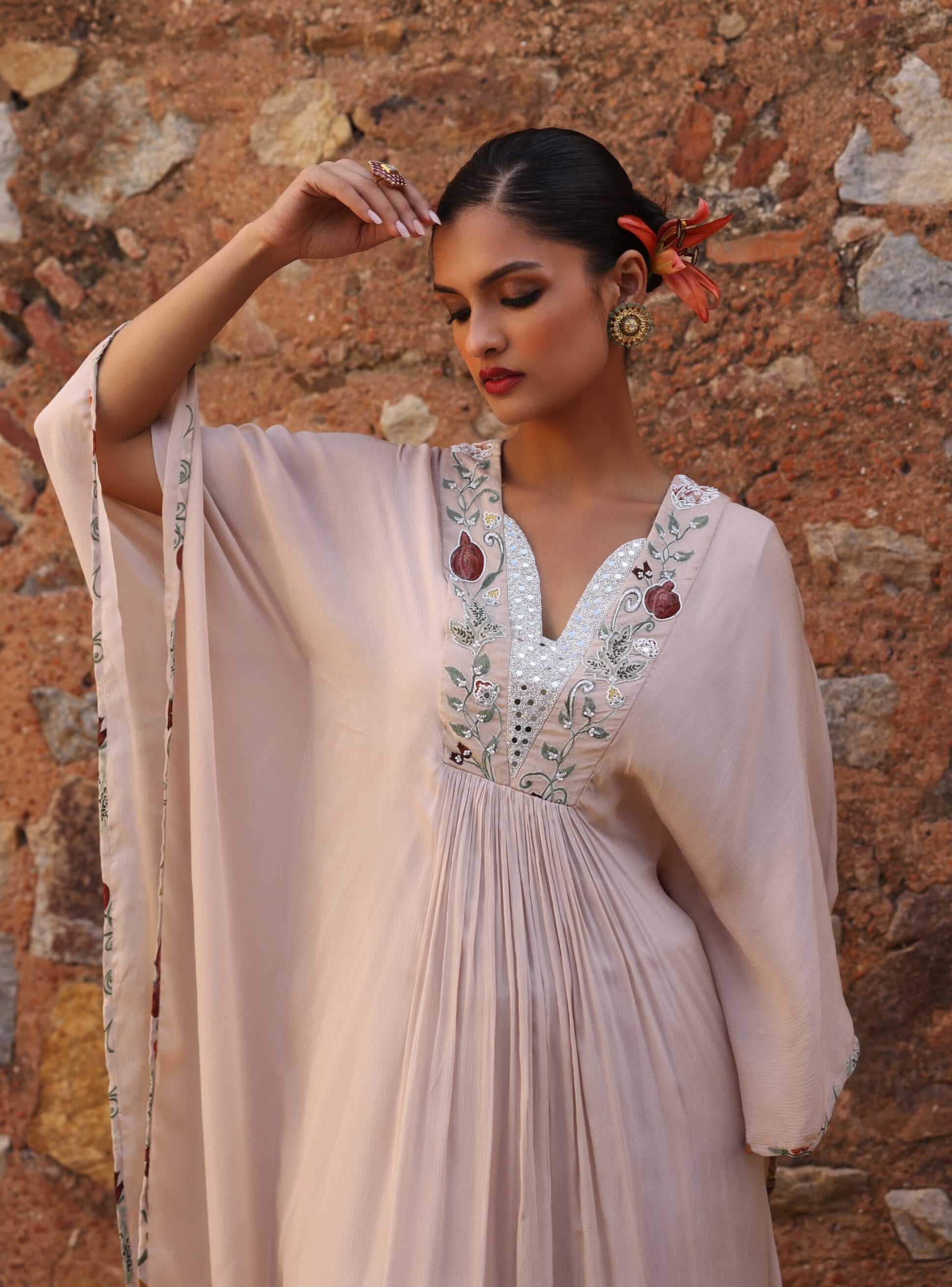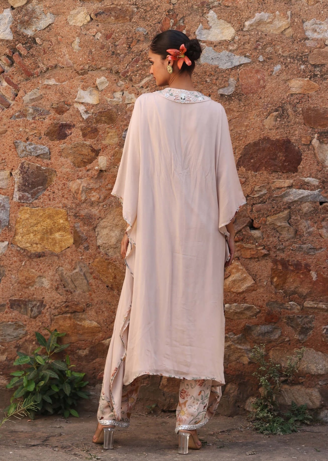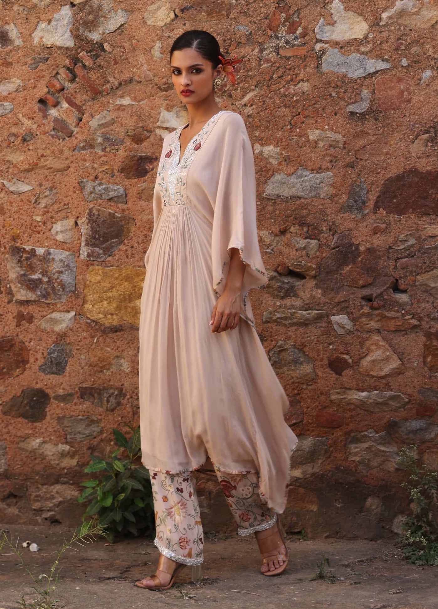 Embrace elegance with the Prisha blush pink embellished kaftan, showcasing exquisite applique detailing along the neckline and paired with coordinating embellished printed pants. This striking outfit blends style and comfort effortlessly, making it the perfect choice for any occasion. Enjoy a harmonious mix of modern sophistication and effortless chic with this captivating ensemble.