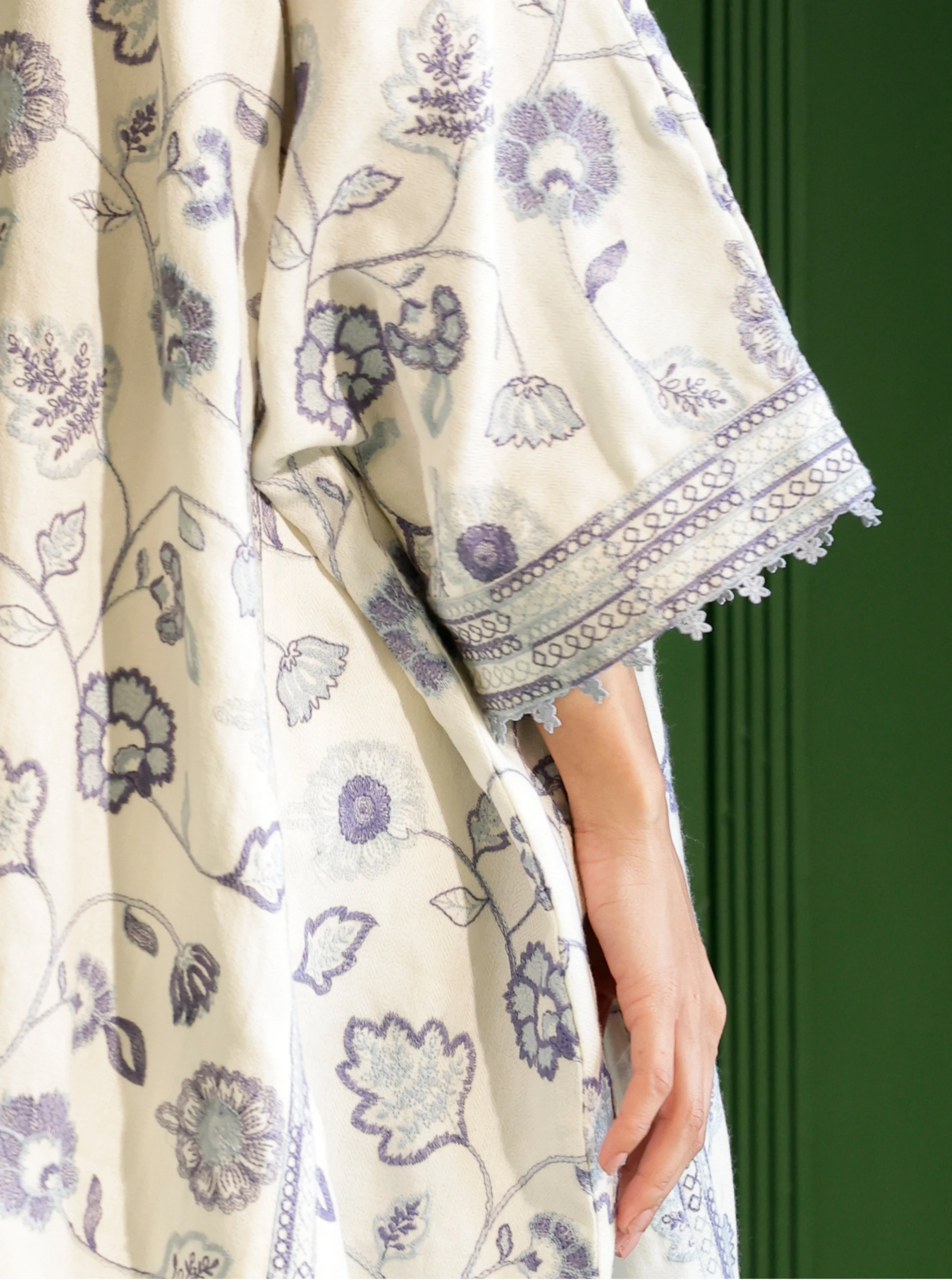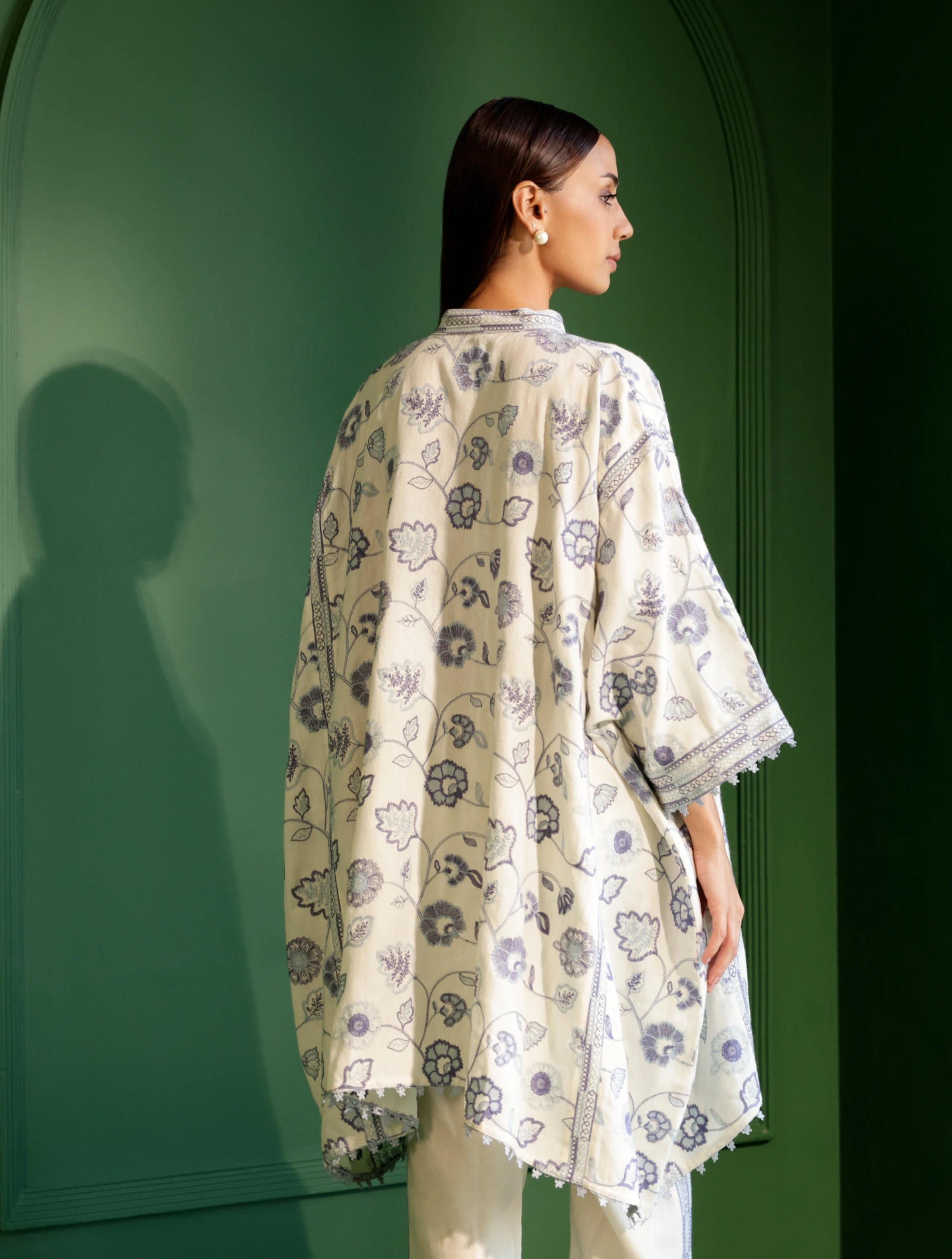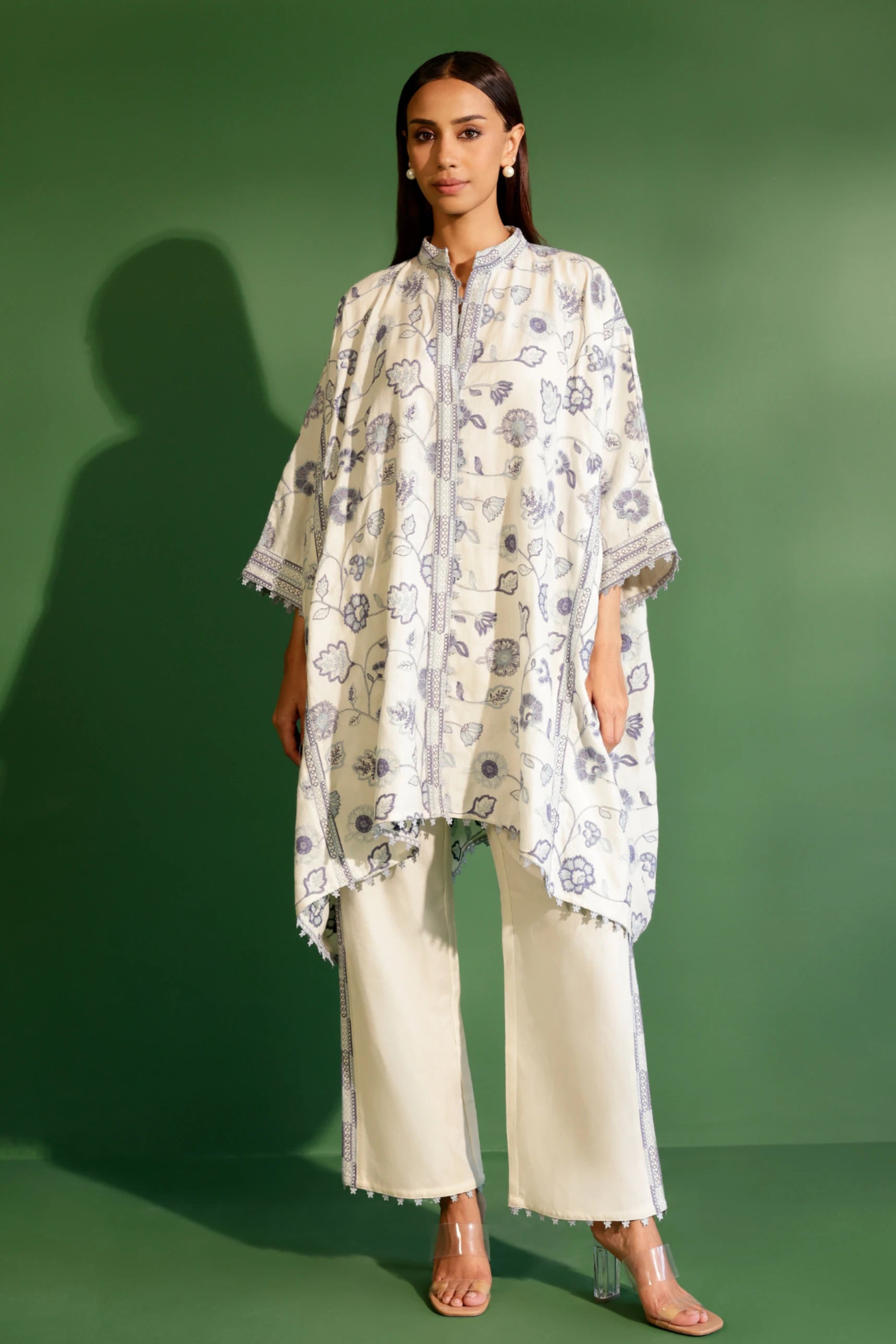 Elevate your winter wardrobe with this white woolen kurta set. Featuring delicate blue floral embroidery, a relaxed A-line fit, scalloped hemline, and lace-trimmed cuffs, it exudes elegance. Paired with minimally embellished straight-leg pants, this ensemble is perfect for cozy, stylish layering during cooler months. Warmth and sophistication come together effortlessly in this chic outfit.