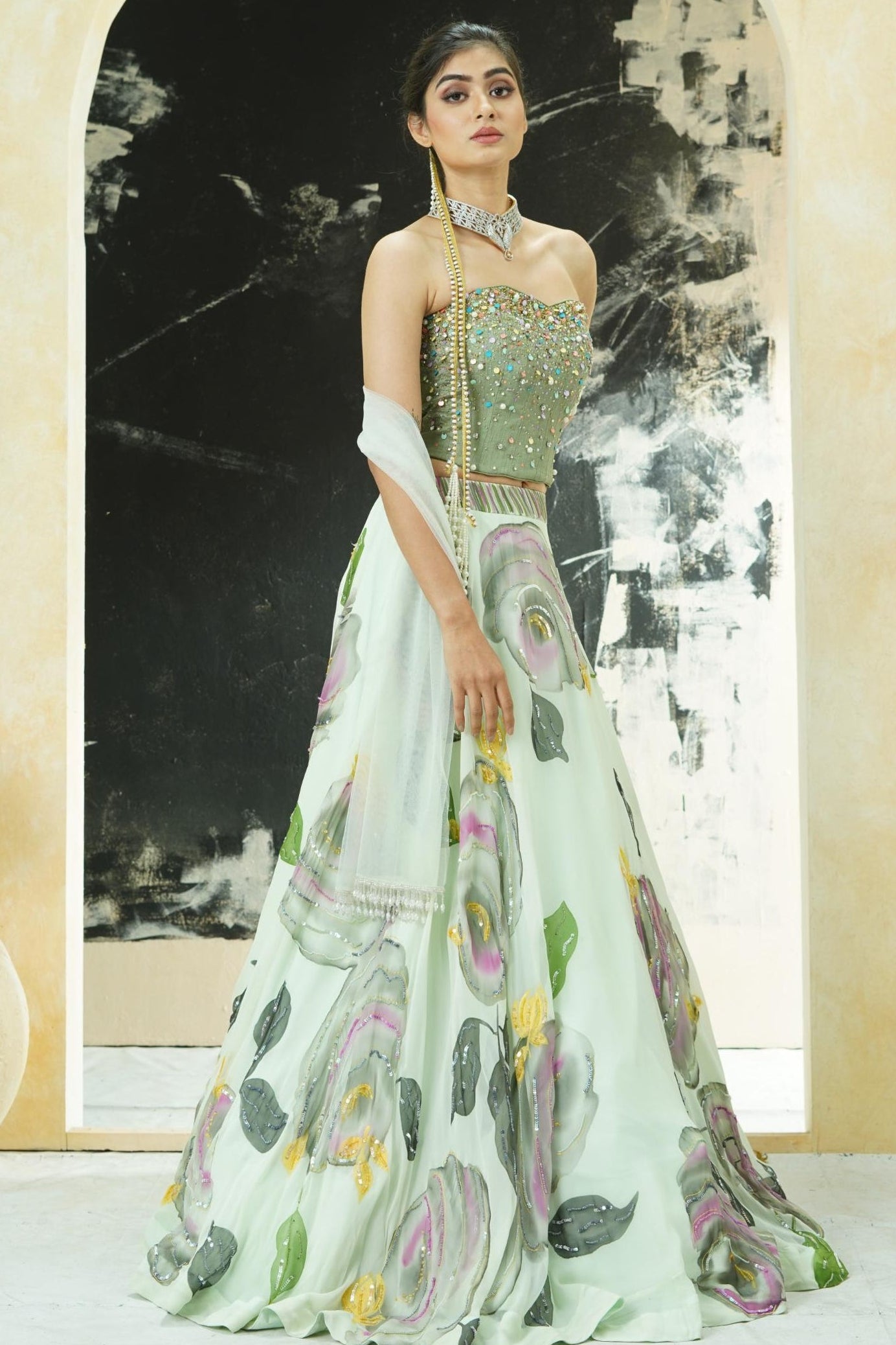 The Mint Green Aangan Hand Painted Lehenga with Corset Set is a refreshing option for events that call for elegance with a modern twist. The structured corset pairs beautifully with the flowing mint green lehenga, creating a flattering silhouette ideal for cocktail functions, sangeet nights, and destination weddings. Its pastel tone adds an air of serenity, while the hand-painted detailing introduces a unique artistic finish. Bridesmaids or close family members seeking an elevated yet contemporary choice will appreciate how versatile this ensemble is across diverse venues—from seaside resorts to lush outdoor gardens. Lightweight, graceful, and visually captivating, this look ensures effortless confidence throughout your celebrations.