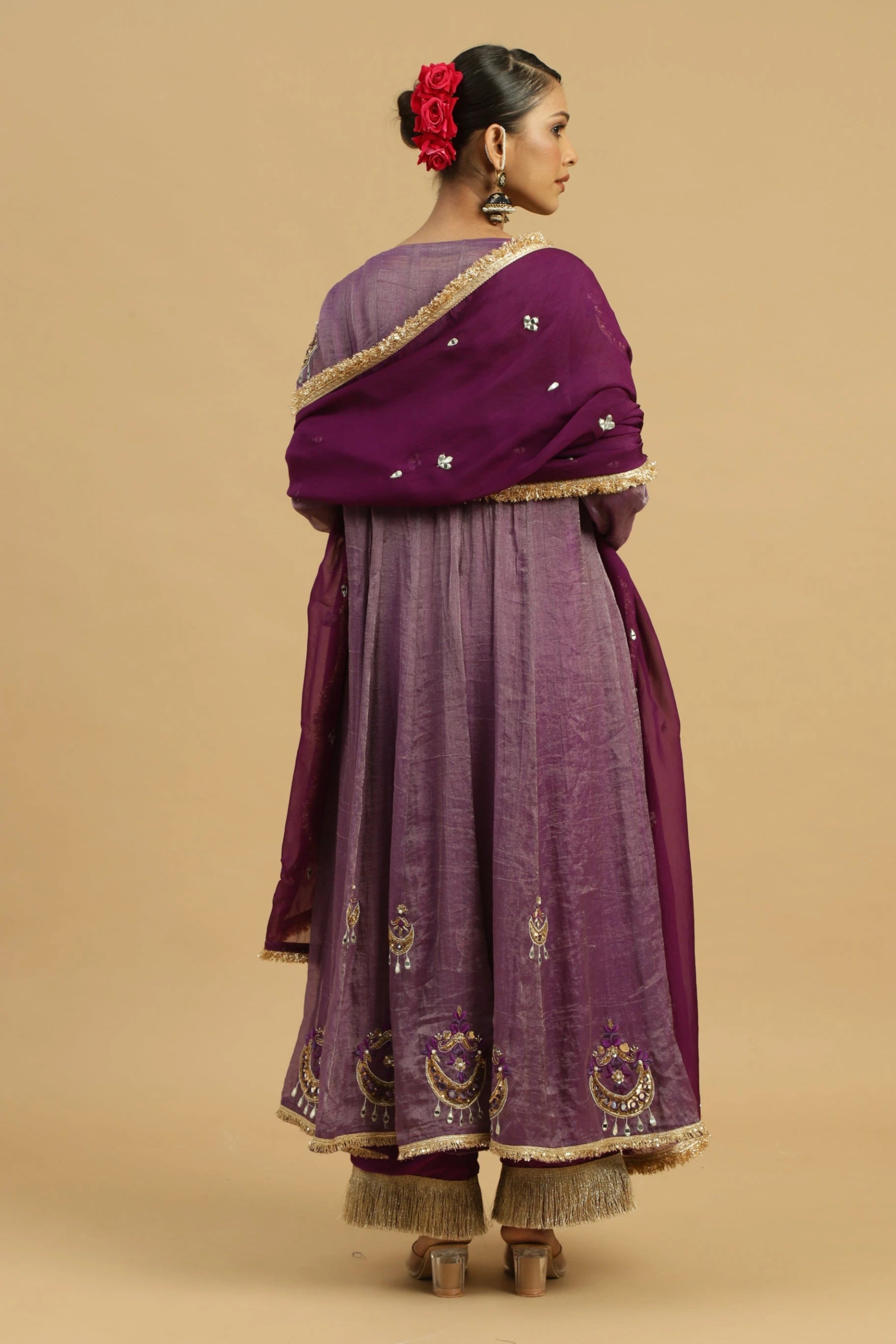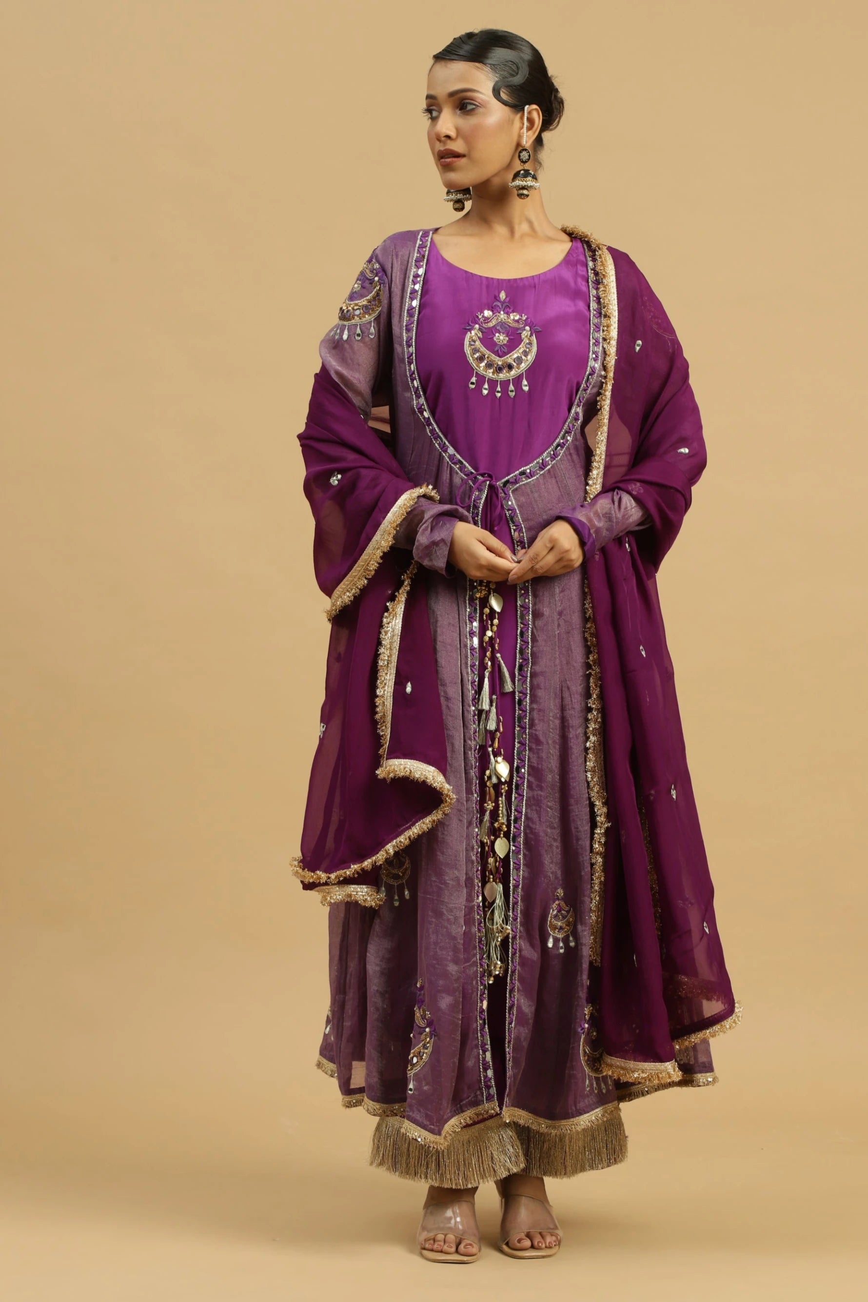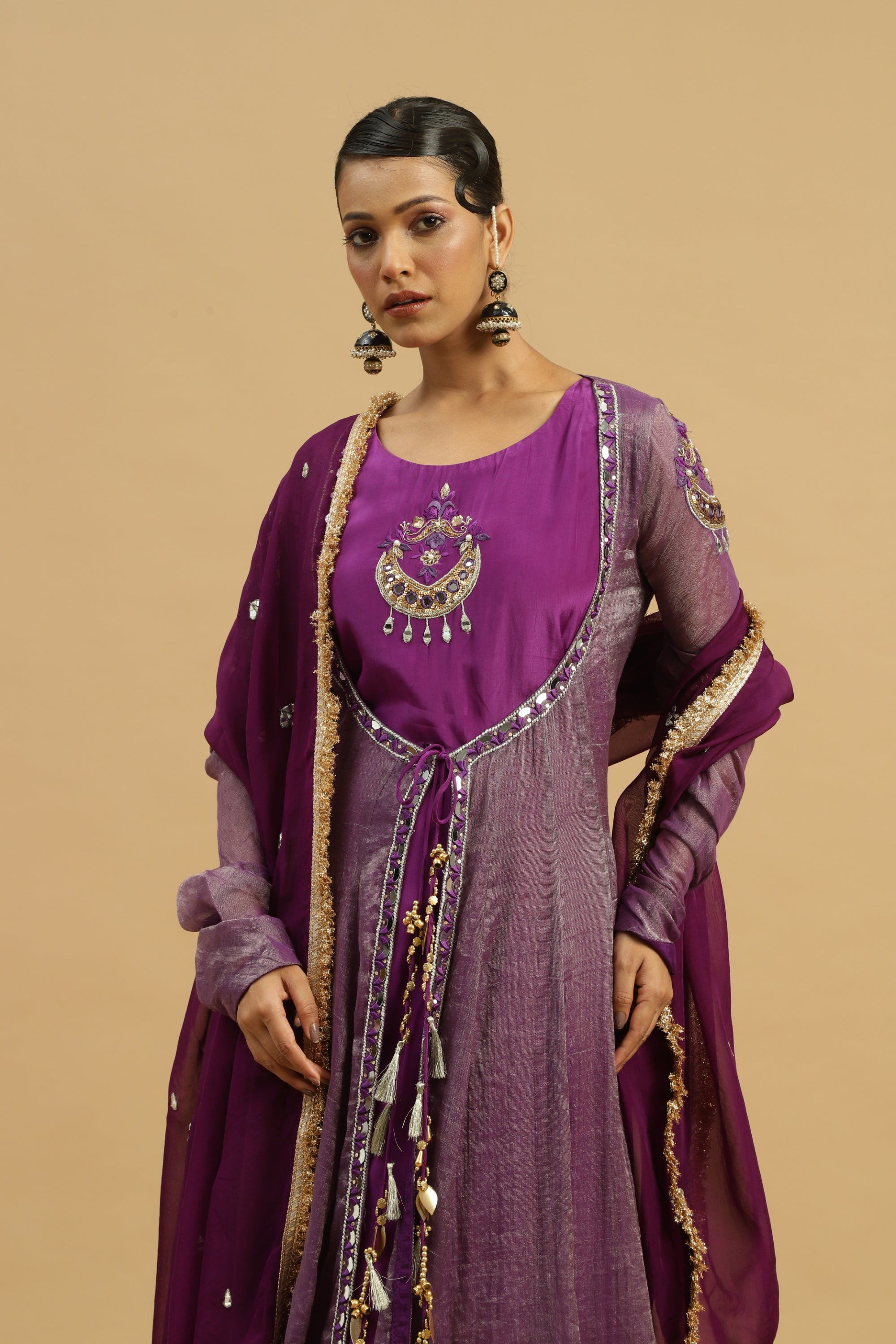 Purple anarkali with detached slip paired with straight pants & dupatta